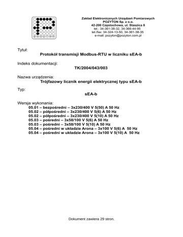 Zakład Elektronicznych Urządzeń Pomiarowych POZYTON Sp. z o.o. 42-200 Częstochowa, ul. Staszica 8 tel.: 34-361-38-32, 34-366-44-95 tel./fax: 34-324-13-50, 34-361-38-35 e-mail: [email protected] Tytuł: Protokół transmisji Modbus-RTU w liczniku sEA-b Indeks dokumentacji: TK/2004/043/003 Nazwa urządzenia: Trójfazowy licznik energii elektrycznej typu sEA-b Typ: sEA-b Wersja wykonania: 05.01 – bezpośredni – 3x230/400 V 5(50) A 50 Hz 05.02 – półpośredni – 3x230/400 V 5(6) A 50 Hz 05.02 – półpośredni – 3x230/400 V 5(10) A 50 Hz 05.03 – pośredni – 3x58/100 V 5(6) A 50 Hz 05.03 – pośredni – 3x58/100 V 5(10) A 50 Hz 05.04 – pośredni w układzie Arona – 3x100 V 5(6) A 50 Hz 05.04 – pośredni w układzie Arona – 3x100 V 5(10) A 50 Hz Dokument zawiera 29 stron. TK/2004/043/003 Protokół transmisji Modbus-RTU w liczniku sEA-b Spis treści 1.Wprowadzenie...................................................................................................................3 2.Organizacja magistrali Modbus-RTU/RS485.....................................................................3 3.Warstwa fizyczna – interfejs RS485..................................................................................3 4.Warstwa łącza danych.......................................................................................................4 4.1.Transmisja bajtu (oktetu)............................................................................................4 4.2.Ramka Modbus-RTU..................................................................................................5 5.Warstwa aplikacji................................................................................................................6 5.1.Rodzaje ramek Modbus – kody funkcji.......................................................................6 5.2.Numeracja rejestrów i adresowanie rejestrów............................................................7 5.3.Prezentowanie danych pomiarowych.........................................................................7 5.4.Ustawianie i synchronizacja czasu licznika................................................................8 5.5.Odczyt profilu obciążenia (mocy)...............................................................................9 6.Mapa pamięci rejestrów Modbus licznika – rejestry tylko do odczytu.........................10 7.Mapa pamięci Modbus – rejestry modyfikowalne............................................................22 8.Mapa pamięci rekordu pliku.............................................................................................23 9.Przykłady..........................................................................................................................25 9.1.Odczyt liczydeł sumarycznych..................................................................................25 9.2.Ustawianie czasu licznika.........................................................................................26 9.3.Synchronizacja czasu licznika..................................................................................26 9.4.Odczyt wpisu profilu obciążenia...............................................................................27 9.5.Zmiana adresu Modbus............................................................................................28 9.6.Zmiana prędkości łącza oraz typu parzystości.........................................................29 Strona 2 z 29 TK/2004/043/003 Protokół transmisji Modbus-RTU w liczniku sEA-b 1. Wprowadzenie Dokument opisuje protokół komunikacyjny Modbus-RTU zaimplementowany w licznikach typu sEA-b z oprogramowaniem wewnętrznym w wersjach: 05.01, 05.02, 05.03 i 05.04. Komunikacja z wykorzystaniem protokołu Modbus-RTU dostępna jest poprzez port RS485 (EIA-485) licznika. Komunikacja z licznikiem z wykorzystaniem portu optycznego licznika nie jest zgodna z protokołem Modbus i opisana jest w odrębnym dokumencie o oznaczeniu TK/2004/034/001. 2. Organizacja magistrali Modbus-RTU/RS485 Typowa instalacja magistrali komunikacyjnej Modbus-RTU/RS485 składa się z urządzenia Master (np. komputera PC z konwerterem RS485, sterownika PLC 1; nazywany również: „Klient”) przewodów połączeniowych (np. skrętka) i urządzeń Slave (np. liczniki sEA-b; nazywany również: „Serwer”). Komunikacja polega na wysyłaniu zapytań lub żądań przez urządzenie Master do wybranego urządzenia Slave. Urządzenie Slave realizuje żądanie i odsyła odpowiedź. Urządzenia Slave mają nadane unikalne adresy (liczba z zakresu od 1 do 247) dzięki którym urządzenie Master, wysyłając zapytanie, wskazuje do którego urządzenia Slave dane zapytanie jest kierowane. 3. Warstwa fizyczna – interfejs RS485 Licznik wyposażony jest w port komunikacyjny RS485 (EIA-485) przy pomocy którego można zrealizować transmisję danych zgodnie z protokołem Modbus opisanym w tym dokumencie. Interfejs RS485 licznika jest izolowany galwanicznie od obwodów pomiarowych licznika – wytrzymałość izolacji 4 kV(AC). Połączenia magistrali RS485 należy wykonać zgodnie z typowymi zasadami instalacji takiej magistrali. Opcjonalnie należy dokonać terminacji zakończeń magistrali (poprzez podłączenie rezystorów terminujących o rezystancji odpowiadającej impedancji falowej użytego przewodu połączeniowego) w przypadku wystąpienia połączeń o znacznej długości. Licznik sEA-b posiada wbudowane rezystory wymuszające stabilny stan na magistrali w przypadku gdy żadne urządzenie nie steruje magistralą. Obciążenie jakie dla magistrali RS485 licznik stanowi dwukrotność typowego obciążenia tej magistrali, tj. do magistrali można podłączyć maksymalnie 16 liczników. 1 Programmable Logic Controller – Programowalny Sterownik Logiczny Strona 3 z 29 TK/2004/043/003 Protokół transmisji Modbus-RTU w liczniku sEA-b 4. Warstwa łącza danych 4.1. Transmisja bajtu (oktetu) Tr