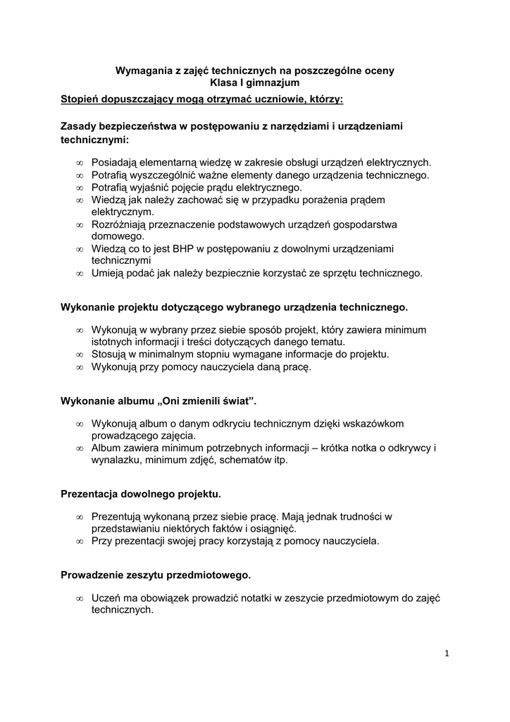 Wymagania z zajęć technicznych na poszczególne oceny Klasa I gimnazjum Stopień dopuszczający mogą otrzymać uczniowie, którzy: Zasady bezpieczeństwa w postępowaniu z narzędziami i urządzeniami technicznymi: • • • • • • • Posiadają elementarną wiedzę w zakresie obsługi urządzeń elektrycznych. Potrafią wyszczególnić ważne elementy danego urządzenia technicznego. Potrafią wyjaśnić pojęcie prądu elektrycznego. Wiedzą jak należy zachować się w przypadku porażenia prądem elektrycznym. Rozróżniają przeznaczenie podstawowych urządzeń gospodarstwa domowego. Wiedzą co to jest BHP w postępowaniu z dowolnymi urządzeniami technicznymi Umieją podać jak należy bezpiecznie korzystać ze sprzętu technicznego. Wykonanie projektu dotyczącego wybranego urządzenia technicznego. • • • Wykonują w wybrany przez siebie sposób projekt, który zawiera minimum istotnych informacji i treści dotyczących danego tematu. Stosują w minimalnym stopniu wymagane informacje do projektu. Wykonują przy pomocy nauczyciela daną pracę. Wykonanie albumu „Oni zmienili świat”. • • Wykonują album o danym odkryciu technicznym dzięki wskazówkom prowadzącego zajęcia. Album zawiera minimum potrzebnych informacji – krótka notka o odkrywcy i wynalazku, minimum zdjęć, schematów itp. Prezentacja dowolnego projektu. • • Prezentują wykonaną przez siebie pracę. Mają jednak trudności w przedstawianiu niektórych faktów i osiągnięć. Przy prezentacji swojej pracy korzystają z pomocy nauczyciela. Prowadzenie zeszytu przedmiotowego. • Uczeń ma obowiązek prowadzić notatki w zeszycie przedmiotowym do zajęć technicznych. 1 Ocena prac pisemnych: • • Sprawozdanie ze spotkania ze specjalistą danego zawodu lub wyjścia do zakładu pracy zawiera niewiele informacji. Sprawozdanie w wyjścia może być napisane pod wpływem wskazówek prowadzącego. Urządzenia techniczne: Telefon komórkowy: • • • Zna pojecie telefonu komórkowego i stacjonarnego. Wie do czego służy telefon komórkowy i stacjonarny. Wie jakie podstawowe możliwości oferuje telefon. Aparat fotograficzny: • Zna pojęcie aparatu fotograficznego. • Wie jakie są jego rodzaje. • Zna podstawowe możliwości aparatów fotograficznych. Komputer, Laptop: • Zna rodzaje komputerów. • Wie jakie są między nimi różnice. • Rozróżnia komputer stacjonarny od przenośnego. Lokówka, Prostownica, Suszarka: • Wie do czego te urządzenia służą. Telewizor, Dvd • Wie jakie są rodzaje telewizorów. (kineskopowe, LCD, plazmowe) • Zna ich zalety i wady. • Wie do czego służy DVD. Wieża stereo, Mp3 • Zna rodzaje odtwarzaczy dźwięku • Wie co to jest Mp3. Pralka • Zna zastosowanie pralki. • Wie jakie są ich rodzaje. 2 Lodówka, Lodówko-zamrażalka: • Zna funkcjonalność lodówki. • Wie jakie są rodzaje takich urządzeń. Mikrofalówka • Wie do czego służy takie urządzenie. • Zna zasadę działania mikrofalówki. Wiertarka, lutownica i pozostałe urządzenia • Posiadają elementarną wiedzę dotyczącą pozostałych urządzeń. Stopień dostateczny mogą otrzymać uczniowie, którzy spełniają kryteria na stopień dopuszczający oraz: Zasady bezpieczeństwa w postępowaniu z narzędziami i urządzeniami technicznymi: • • • Posiadają podstawową wiedzę w zakresie obsługi urządzeń elektrycznych. Potrafią wyjaśnić pojęcie pliku prądu elektrycznego w odniesieniu do zjawisk fizycznych - elektronów. Umieją podać zasady bezpiecznego korzystania z urządzeń elektrycznych wraz z działaniem gdy urządzenie posiada wady. Wykonanie projektu dotyczącego wybranego urządzenia technicznego. • • • • Wykonują w wybrany przez siebie sposób projekt, który zawiera podstawowe informacje i treści dotyczące danego tematu. Stosują w podstawowym stopniu wymagane informacje do projektu. Wykonują przy minimalnej pomocy nauczyciela daną pracę. Mimo problemów z wykonaniem starają się udoskonalać swój projekt. Wykonanie albumu „Oni zmienili świat”. • • Wykonują album o danym w sposób samodzielny, w razie problemów z minimalną ingerencją prowadzącego. Album zawiera podstawowe potrzebne informacje notka o odkrywcy i wynalazku, zdjęcia, schematy, wykresy i inne informacje dotyczące tematu. Prezentacja dowolnego projektu. • • Prezentują samodzielnie wykonaną przez siebie pracę. Przy prezentacji swojej pracy korzystają z pomocy nauczyciela. 3 • Mówiąc o danej informacji rozumieją sens przekazywanej treści. Prowadzenie zeszytu przedmiotowego. • Uczeń ma obowiązek prowadzić notatki w zeszycie przedmiotowym do zajęć technicznych. Zeszyt prowadzony jest starannie. Ocena prac pisemnych: • • Sprawozdanie ze spotkania ze specjalistą danego zawodu lub wyjścia do zakładu pracy zawiera podstawowe niezbędne informacje. Sprawozdanie w wyjścia może być napisane przy ukierunkowaniu przez prowadzącego. Urządzenia techniczne: Telefon komórkowy: • Zna oprócz podstawowych dodatkowe funkcje telefonu. Aparat fotograficzny: • Zna dodatkowe zastosowania aparatu fotograficznego. Komputer, Laptop: • Wie co to jest laptop, palm top, notebook i netbook. • Potrafi je rozróżnić. Lokówka, Prostownica, Suszarka: • Zna ich możliwości i zastosowanie. Telewizor, Dvd • Wie co to jest rozdzielczość w telewizorze oraz liczba cali telewizora, monitora. Wieża stereo, Mp3 • Umie wymienić inne formaty muzyczne. • Zna rodzaje nośników na jakich zapisywane są pliki muzyczne. Pralka • Wie co to jest program przy używaniu pralki automatycznej. 4 Lodówka, Lodówko-zamrażalka: • Zna podstawowe parametry które można ustawić w takich urządzeniach. Mikrofalówka • Zna parametry jakie można ustawiać w mikrofalówce. Wiertarka, lutownica i pozostałe urządzenia • Znają zastosowanie tych urządzeń Stopień dobry mogą otrzymać uczniowie, którzy spełniają kryteria na stopi