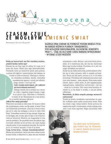 s amoocena CZASEM CZUJĘ, ŻE MÓGŁBYM ZMIENIĆ ŚWIAT R oz m a w i a D a r i u s z B u g a l s k i Każdego dnia staram się podnosić poziom mojego życia. Na bardzo różnych planach: świadomości, pod względem emocjonalnym, duchowym, komfortu pracy i… staję się dla siebie coraz bardziej wyrozumiały – wyznaje LESZEK MOŻDżER Kiedy po koncertach ma Pan standing ovation, pewnie bardzo rośnie ego? temat numeru Staram się nie brać tego do siebie, bo czuję, że to koks dla duszy. Wiele razy tego doświadczyłem. Trzymało mnie po koncercie przez parę godzin, a potem był odpływ i osamotnienie tak bolesne, że trudno to sobie wyobrazić. Uderzają w człowieka wszystkie problemy, smutki, wszystkie niezałatwione sprawy i wtedy jest alkohol, dragi, dziwki i rock and roll. Czyli, muzyka może dawać, ale i zabierać poczucie własnej wartości? Dlatego staram się je czerpać nie z muzyki, tylko z zupełnie czegoś innego, z tego, że po prostu żyję. Odkryłem to niedawno, w wieku 36 lat. Niezręcznie mi o tym mówić, bo to bardzo intymne odkrycie. Odkrył Pan swoje potrzeby? Właściwie zaczynam je odkrywać. Do tej pory żyłem dla wyobrażenia o sobie, nie dla siebie. A teraz? Chcę żyć! Kieślowski powiedział: „Chcę się w końcu wykąpać po to, żeby się wykąpać, a nie po to, żeby robić filmy”. Doszedłem wreszcie do tego samego. Kąpię się, bo się kąpię, jem, bo jem, śpię, bo śpię, a nie wypoczywam po koncercie. Niestety, nie osiągnałem w tym jeszcze perfekcji. Na przykład teraz chciałbym tego wywiadu udzielać na sto procent, ale część mojego umysłu pisze w tym momencie muzykę. Bo żyję też po to, by tworzyć muzykę. O tym to ja wiem. Czuję, że Pan teraz… trenuje. Samodoskonalenie? Można tak powiedzieć. Jakiś czas temu zafascynowała mnie Doda, a właściwie to, jakie ona ma wysokie 2 poradnik psychologiczny sierpień 2007 mniemanie o sobie. Można o niej oczywiście powiedzieć, że to malowana lala, ale ona ma charyzmę! Mnie tego trochę brakuje. Poczułem, że to jest coś, czego chciałbym się nauczyć. Kiedy ma się niską samoocenę, podświadomie wchodzi się w takie sytuacje, żeby to niejako potwierdzić. Świat jest jak lustro, zwraca ci to, co od ciebie otrzymuje. Potrzebna jest systematyczna praca nad tym, żeby zmienić… dietę umysłu. Doda sama siebie chwali, sama o sobie mówi, że jest najpiękniejsza, najmądrzejsza, najbardziej wartościowa i tak ma – świat jej to zwraca. Choć mnie teraz bardziej obchodzi to, co się dzieje w środku, a nie jak jestem odbierany. Rozumiem, że dieta umysłu pomaga wzmocnić samoocenę? Trzeba po prostu świadomie wprowadzać do umysłu wybrane przez siebie pozytywne słowa. Robi się wtedy z tego rodzaj mantry. Kiedy porzuca się negatywne myśli i wyobrażenia, wtedy znikają związane z tym wizje zagrożeń. Nagle zaczynamy sobie Zacząłem grać na fortepianie, gdy miałem pięć lat. Klawiatura zawsze dawała mi poczucie bezpieczeństwa zdawać sprawę, jak one są absurdalne. Widać też, jak jedno negatywne wyobrażenie tka całą sieć myśli, przekonań, poglądów, wyrafinowanych konstrukcji myślowych. Większości tych myśli na ogół nie jesteśmy świadomi. Gdy wprowadzimy w system zmianę, te negatywne myśli się wytrącają i zmienia się cały system. To wieloetapowa praca. No to czym jest właściwie to Życie?… Czy ktoś Panu w tej pracy pomaga? Tak. Bo skoro ten płód jest wartością, to i ja jestem wartością i moje życie jest wartością. Nie stanowi o niej to, że gram na fortepianie, tylko to, że żyję. Tak, psychoterapeutka. Nie, więcej – nauczycielka duchowa. Okazuje się, że moje problemy nie przychodzą z zewnątrz, tylko tkwią głęboko we mnie i to moje wnętrze wymaga uzdrowienia. Oglądałem niedawno w telewizji dyskusję o aborcji, sam nie wiem, czemu. Potem śniło mi się, że trzymam w dłoniach płód ludzki. I zdałem sobie sprawę, że moim naturalnym instynktem było to, żeby go chronić. Jakoś się to we mnie zalęgło… Tak, zalęgło. Tak jakby trzymał Pan w dłoniach siebie samego? Podziwiam Pana, że Pan nie zatłukł w sobie klawiszami dziecka, chociaż tłukł Pan od małego. 3 s amoocena Tak. I to naprawdę sporo. Jest taka reguła, że rok życia dzieli się przez dwa: pierwszy rok nauki – pół godziny ćwiczenia dziennie. Drugi rok nauki – godzina ćwiczenia, trzeci rok – półtorej godziny … Więc teraz … piętnaście i pół? No, nie. Ale, żeby się rozwijać, to szóstkę trzeba wytrzepać. Odkrył Pan swoje potrzeby dopiero teraz. Jak Pan przeżył tych trzydzieści kilka lat? temat numeru Cóż, inwestowałem w swój rozwój, żeby być na tym poziomie profesjonalnym, na którym teraz jestem. Lester Bowie, wielki trębacz, opowiadał, że ojciec kazał mu ćwiczyć strasząc, że go zabije. Mój mnie straszyć nie musiał. Wiedziałem, że jak solidnie nie popracuję, to się zbłaźnię na egzaminie przed profesorami, a to przecież bardzo nieprzyjemne. To znaczy, że z Pana samooceną bywało nie najlepiej? Bywało. Złe myśli powodują cierpienie. Jedni wtedy piją, inni dużo, o wiele za dużo pracują i wychodzą na scenę. Kiedyś nie czułem się pewnie wśród ludzi. Zasiadałem przed klawiaturą… i ona dodawała mi pewności. Teraz jest inaczej. Czuję się sprawnym pianistą, klawiatura nadal daje mi poczucie bezpieczeństwa, które traciłem, gdy od niej odchodziłem. Dzisiaj wiem, że trzeba pielęgnować jedno i drugie: dobre myśli o sobie i umiejętności pianistyczne. Coraz bardziej do mnie dociera, że ważniejsze jest to pierwsze, które wpływa na to drugie. Czy być lepszym pianistą oznacza być lepszym człowiekiem? Dla mnie być lepszym człowiekiem znaczy być lepszym pianistą, w tej kolejności. Twierdzi Pan, że coraz większe poczucie wartości bierze się z Pańskiego wnętrza. Co będzie, jeśli kolejnej płyty ludzie nie będą słuchać, przestaną