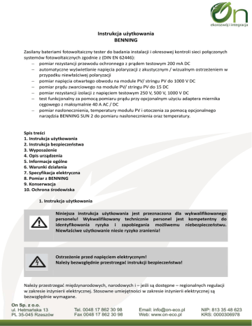 Instrukcja użytkowania BENNING Zasilany bateriami fotowoltaiczny tester do badania instalacji i okresowej kontroli sieci połączonych systemów fotowoltaicznych zgodnie z (DIN EN 62446): pomiar rezystancji przewodu ochronnego z prądem testowym 200 mA DC automatyczne wyświetlanie napięcia polaryzacji z akustycznym / wizualnym ostrzeżeniem w przypadku niewłaściwej polaryzacji pomiar napięcia otwartego obwodu na module PV/ stringu PV do 1000 V DC pomiar prądu zwarciowego na module PV/ stringu PV do 15 DC pomiar rezystancji izolacji z napięciem testowym 250 V, 500 V, 1000 V DC test funkcjonalny za pomocą pomiaru prądu przy opcjonalnym użyciu adaptera miernika cęgowego z maksymalnie 40 A AC / DC pomiar nasłonecznienia, temperatury modułu PV i otoczenia za pomocą opcjonalnego narzędzia BENNING SUN 2 do pomiaru nasłonecznienia oraz temperatury. Spis treści 1. Instrukcja użytkowania 2. Instrukcja bezpieczeństwa 3. Wyposażenie 4. Opis urządzenia 5. Informacje ogólne 6. Warunki działania 7. Specyfikacja elektryczna 8. Pomiar z BENNING 9. Konserwacja 10. Ochrona środowiska 1. Instrukcja użytkowania Niniejsza instrukcja użytkowania jest przeznaczona dla wykwalifikowanego personelu! Wykwalifikowany technicznie personel jest kompetentny do identyfikowania ryzyka i zapobiegania możliwemu niebezpieczeństwu. Niewłaściwe użytkowanie niesie ryzyko zranienia! Ostrzeżenie przed napięciem elektrycznym! Należy bezwzględnie przestrzegać instrukcji bezpieczeństwa! Należy przestrzegać międzynarodowych, narodowych i – jeśli są dostępne – regionalnych regulacji w zakresie inżynierii elektrycznej. Stosowne umiejętności w zakresie inżynierii elektrycznej są bezwzględnie wymagane. BENNING PV 1‐1 jest przeznaczone do wykonywania pomiarów w suchym otoczeniu (więcej szczegółów z rozdziale 6 „Warunki działania”). W instrukcji użytkowania BENNING PV 1‐1zastosowano następujące symbole: Ostrzeżenie przed elektrycznym niebezpieczeństwie! Określa instrukcje zachowania w celu uniknięcia zagrożenia dla człowieka. Uwaga! Prosimy postępować zgodnie z instrukcją! Ten symbol oznacza, iż należy postępować zgodnie z instrukcją użytkowania w celu uniknięcia niebezpieczeństwa. Ten symbol na urządzeniu BENNING PV 1‐1 oznacza, iż BENNING PV 1‐1 jest zgodny z normami UE. Pojawienie się tego symbolu na wyświetlaczu oznacza rozładowanie baterii. Jak tylko symbol się pojawi, natychmiast wymień baterię na nową. Oznaczenie modułu PV (AC) Napięcie lub prąd przemienny (DC) Napięcie lub prąd stały Uziemienie (Napięcie względem ziemi) Klasa ochrony I Klasa ochrony II 2. Instrukcja bezpieczeństwa Urządzenie zostało zbudowane i testowane zgodnie z DIN VDE 0411 cz. 1/ EN 61010 cz. 1 DIN VDE 0413 cz. 1/ EN 61557 cz. 1, 2, 4 i 10 i opuściło fabrykę w doskonałym stanie technicznym. W celu utrzymania tego stanu i zapewnienia bezpieczeństwa użytkowania urządzenia, użytkownik musi bez przerwy obserwować informacje i ostrzeżenia opisane w instrukcji. Niewłaściwe użytkowanie i lekceważenie ostrzeżeń może spowodować ciężkie zranienia i stanowić zagrożenie dla życia. Zasilanie do generatora PV powinno być zgodne z zaleceniami zawartymi w instrukcji. Odłącz niezalecane przez testy bezpieczeństwa przewody od urządzenia BENNING PV 1‐1 Moduł PV/stringi PV nie mogą przekraczać maksymalnej wartości obwodu otwartego 1000 V DC, maksymalnej wartości prądu zwarciowego 15 A i maksymalnej mocy prądu (P=U x I) 10 kW. Zgodnie z normą DIN EN 62446 pomiary powinny być przeprowadzone dla każdego stringu PV. Pomiar w stringu PV połączone równolegle może spowodować przeciążenie urządzenia BENNING PV 1‐1. Gniazda testowe (9) i (10) są przeznaczone wyłącznie do podłączenia do generatorów PV (moduł PV, string PV). Odłącz urządzenie BENNING PV 1‐1 od generatora PV bezpośrednio po testowaniu. Nie dotykaj czujników pomiarowych! Podczas pomiarów rezystancji izolacji, w czujnikach pomiarowych może występować prąd o wysokim napięciu. Podczas pomiarów nie dotykaj metalowych elementów testowanego obiektu. Generator PV musi zostać odizolowany od źródła zasilania elektrycznego! Oba bieguny generatora PV nie mogą być uziemione! Pomiar napięcia na obwodach zasilających jest możliwy jedynie przy 4 mm przewodach bezpieczeństwa. Do pomiaru faza‐ziemia,przy 4 mm gniazdach testowych (11) i (12), urządzenie BENNING PV 1‐1 może być używane tylko obwodach elektrycznych o kategorii przepięciowej III z maks. 300 V AC/DC. W celu pomiaru napięcia za pośrednictwem 4 mm gniazd testowych (11) i (12), prosimy odłączyć przewody pomiarowe PV z gniazd testowych (9) i (10) przed wykonaniem pomiaru. OSTRZEŻENIE! Należy zachować ostrożność podczas pracy z nieizolowanymi przewodami lub głównymi nośnikami! Kontakt z przewodami pod napięciem może spowodować porażenie prądem! Pamiętaj, że praca na elektrycznych elementach każdego rodzaju jest niebezpieczna. Nawet niskie napięcie 30 V AC i 60 V DC może stanowić zagrożenie dla życia człowieka. Przed uruchomieniem testera zawsze sprawdź go na wypadek ewentualnych uszkodzeń. Nie należy używać uszkodzonego urządzenia BENNING PV 1‐1! Uszkodzone przewody pomiarowe muszą zostać wymienione! Należy używać jedynie zalecanych przewodów pomiarowych, które stanowią wyposażenie urządzenia BENNING PV 1‐1. Używaj BENNING PV 1‐1 zgodnie ze specyfikacją określoną w niniejszej instrukcji. Używaj BENNING PV 1‐1 tylko w suchym otoczeniu. Jeżeli istnieje przypuszczenie, że bezpieczna praca testera nie jest już możliwa, należy natychmiast wyłączyć i zabezpieczyć go przed przypadkowym włączeniem. Przypuszczenie to może zachodzić jeśli: urządzenie zostało wyraźnie uszkodzone, urządzenie przestało pracować, urządzenie było przechowywane w nieodpowiednich warunkach przez dłuższy okres czasu, urządzenie było naraż