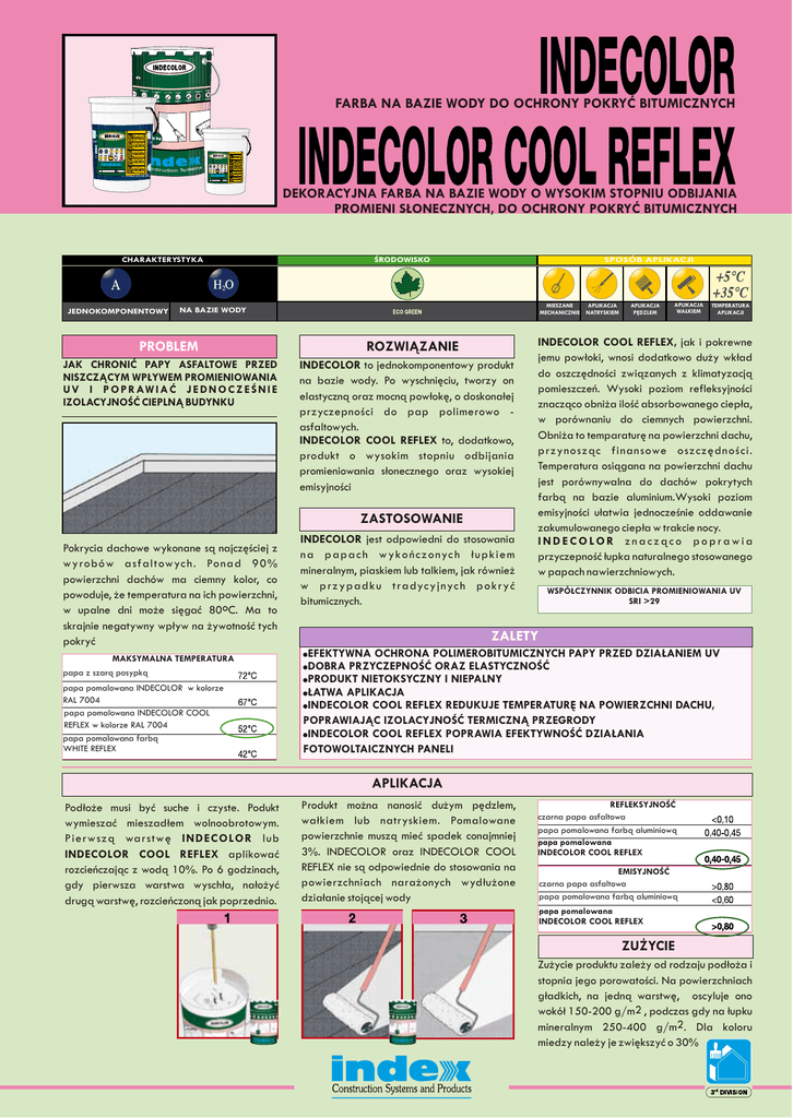 FARBA NA BAZIE WODY DO OCHRONY POKRYÆ BITUMICZNYCH DEKORACYJNA FARBA NA BAZIE WODY O WYSOKIM STOPNIU ODBIJANIA PROMIENI S£ONECZNYCH, DO OCHRONY POKRYÆ BITUMICZNYCH CHARAKTERYSTYKA JEDNOKOMPONENTOWY ŒRODOWISKO SPOSÓB APLIKACJI MIESZANE MECHANICZNIE NA BAZIE WODY PROBLEM JAK CHRONIÆ PAPY ASFALTOWE PRZED NISZCZ¥CYM WP£YWEM PROMIENIOWANIA U V I P O P R AW I A Æ J E D N O C Z E Œ N I E IZOLACYJNOŒÆ CIEPLN¥ BUDYNKU ROZWI¥ZANIE INDECOLOR to jednokomponentowy produkt na bazie wody. Po wyschniêciu, tworzy on elastyczn¹ oraz mocn¹ pow³okê, o doskona³ej przyczepnoœci do pap polimerowo asfaltowych. INDECOLOR COOL REFLEX to, dodatkowo, produkt o wysokim stopniu odbijania promieniowania s³onecznego oraz wysokiej emisyjnoœci ZASTOSOWANIE Pokrycia dachowe wykonane s¹ najczêœciej z wyrobów asfaltowyc h. Ponad 90% powierzchni dachów ma ciemny kolor, co powoduje, ¿e temperatura na ich powierzchni, w upalne dni mo¿e siêgaæ 80oC. Ma to skrajnie negatywny wp³yw na ¿ywotnoœæ tych pokryæ MAKSYMALNA TEMPERATURA papa z szar¹ posypk¹ papa pomalowana INDECOLOR w kolorze RAL 7004 papa pomalowana INDECOLOR COOL REFLEX w kolorze RAL 7004 papa pomalowana farb¹ WHITE REFLEX INDECOLOR jest odpowiedni do stosowania n a p a p a c h w y k o ñ c z o nyc h ³ u p k i e m mineralnym, piaskiem lub talkiem, jak równie¿ w przypadku tradycyjnyc h pokryæ bitumicznych. APLIKACJA NATRYSKIEM APLIKACJA PÊDZLEM APLIKACJA WA£KIEM TEMPERATURA APLIKACJI INDECOLOR COOL REFLEX, jak i pokrewne jemu pow³oki, wnosi dodatkowo du¿y wk³ad do oszczêdnoœci zwi¹zanych z klimatyzacj¹ pomieszczeñ. Wysoki poziom refleksyjnoœci znacz¹co obni¿a iloœæ absorbowanego ciep³a, w porównaniu do ciemnych powierzchni. Obni¿a to temparaturê na powierzchni dachu, przynosz¹c finansowe oszczêdnoœci. Temperatura osi¹gana na powierzchni dachu jest porównywalna do dachów pokrytych farb¹ na bazie aluminium.Wysoki poziom emisyjnoœci u³atwia jednoczeœnie oddawanie zakumulowanego ciep³a w trakcie nocy. INDECOLOR znacz¹co poprawia przyczepnoœæ ³upka naturalnego stosowanego w papach nawierzchniowych. WSPÓ£CZYNNIK ODBICIA PROMIENIOWANIA UV SRI >29 ZALETY !EFEKTYWNA OCHRONA POLIMEROBITUMICZNYCH PAPY PRZED DZIA£ANIEM UV !DOBRA PRZYCZEPNOŒÆ ORAZ ELASTYCZNOŒÆ !PRODUKT NIETOKSYCZNY I NIEPALNY !£ATWA APLIKACJA !INDECOLOR COOL REFLEX REDUKUJE TEMPERATURÊ NA POWIERZCHNI DACHU, POPRAWIAJ¥C IZOLACYJNOŒÆ TERMICZN¥ PRZEGRODY !INDECOLOR COOL REFLEX POPRAWIA EFEKTYWNOŒÆ DZIA£ANIA FOTOWOLTAICZNYCH PANELI APLIKACJA Pod³o¿e musi byæ suche i czyste. Podukt wymieszaæ mieszad³em wolnoobrotowym. Pierwsz¹ warstwê INDECOLOR lub INDECOLOR COOL REFLEX aplikowaæ rozcieñczaj¹c z wod¹ 10%. Po 6 godzinach, gdy pierwsza warstwa wysch³a, na³o¿yæ drug¹ warstwê, rozcieñczon¹ jak poprzednio. Produkt mo¿na nanosiæ du¿ym pêdzlem, wa³kiem lub natryskiem. Pomalowane powierzchnie musz¹ mieæ spadek conajmniej 3%. INDECOLOR oraz INDECOLOR COOL REFLEX nie s¹ odpowiednie do stosowania na powierzchniach nara¿onych wyd³u¿one dzia³anie stoj¹cej wody REFLEKSYJNOŒÆ czarna papa asfaltowa papa pomalowana farb¹ aluminiow¹ papa pomalowana INDECOLOR COOL REFLEX EMISYJNOŒÆ czarna papa asfaltowa papa pomalowana farb¹ aluminiow¹ papa pomalowana INDECOLOR COOL REFLEX ZU¯YCIE Zu¿ycie produktu zale¿y od rodzaju pod³o¿a i stopnia jego porowatoœci. Na powierzchniach g³adkich, na jedn¹ warstwê, oscyluje ono wokó³ 150-200 g/m2 , podczas gdy na ³upku mineralnym 250-400 g/m2. Dla koloru miedzy nale¿y je zwiêkszyæ o 30% PARAMETRY TECHNICZNE p³ynna pasta postaæ kolor p³ynna pasta bia³y (RAL 9010) szary (RAL 7004) czerwony (RAL 3009) zielony (RAL 6025) br¹zowy (RAL 8016) miedŸ szary (RAL 7004) czerwony (RAL 3009) zielony (RAL 6025) 1,43 kg/litr 1,15 kg/litr 1,43 kg/litr 4 godziny 6 godzin 4 godziny 6 godzin 4 godziny 6 godzin niepalne 12 miesiêcy niepalne 12 miesiêcy niepalne 12 miesiêcy ciê¿ar w³aœciwy w temperaturze +23oC sucha pozosta³oœæ (m/m) (UNI EN ISO 3251) czas schniêcia - py³osuchoœæ - do przemalowania pH palnoœæ magazyn. w oryg. opak ZALECENIA !przed u¿yciem produkt magazynowaæ w oryginalnie zamkniêtych opakowaniach !aplikowaæ w temperaturze +5oC - +35oC !nie aplikowaæ w warunkach wysokiej wilgotnoœci, lub gdy istnieje ryzyko wyp³ukania przez deszcz !INDECOLOR oraz INDECOLOR COOL REFLEX nie s¹ odporne na ruch pieszy, który mo¿e mieæ miejsce tylko okazjonalnie !po aplikacji nowych pap asfaltowych powstaje zjawisko emisji tlenków wêgla, które znacz¹co ogranicza przyczepnoœæ pow³oki; aplikacja INDECOLOR lub INDECOLOR COOL REFLEX mo¿e nastêpowaæ po up³ywie minimum 6 miesiêcy od u³o¿enia papy zgrzewalnej; czasem jednak, nawet tak dlugi okres czasu mo¿e okazaæ siê niewystarczaj¹cy, dlatego zaleca siê wykonane testów przyczepnoœci do pod³o¿a ZASADY BEZPIECZEÑSTWA nosiæ odzie¿ ochronn¹ !produkt nie zawiera rozpuszczalników oraz innych toksycznych lub szkodliwych substancji !stosowaæ odzie¿ ochronn¹ odpowiedni¹ dla produktów chemicznych (np. rêkawice ochronne) !w przypadku kontaktu z oczami, wyp³ukaæ natychmiast du¿¹ iloœci¹ wody !chroniæ przed kontaktem z dzieæmi !nie utylizowaæ pozota³oœci do kanalizacji !zabrudzone pod³o¿a wyczyœciæ poprzez zmycie !narzêdzia czyœciæ wod¹ natychmiast po u¿yciu; w przypadku gdy produkt zwi¹za³, u¿yæ gor¹cej wody lub alkoholu OPAKOWANIA INDECOLOR 20 kg, 10 kg, 5 kg INDECOLOR MIED 20 kg INDECOLOR COOL REFLEX 20 kg