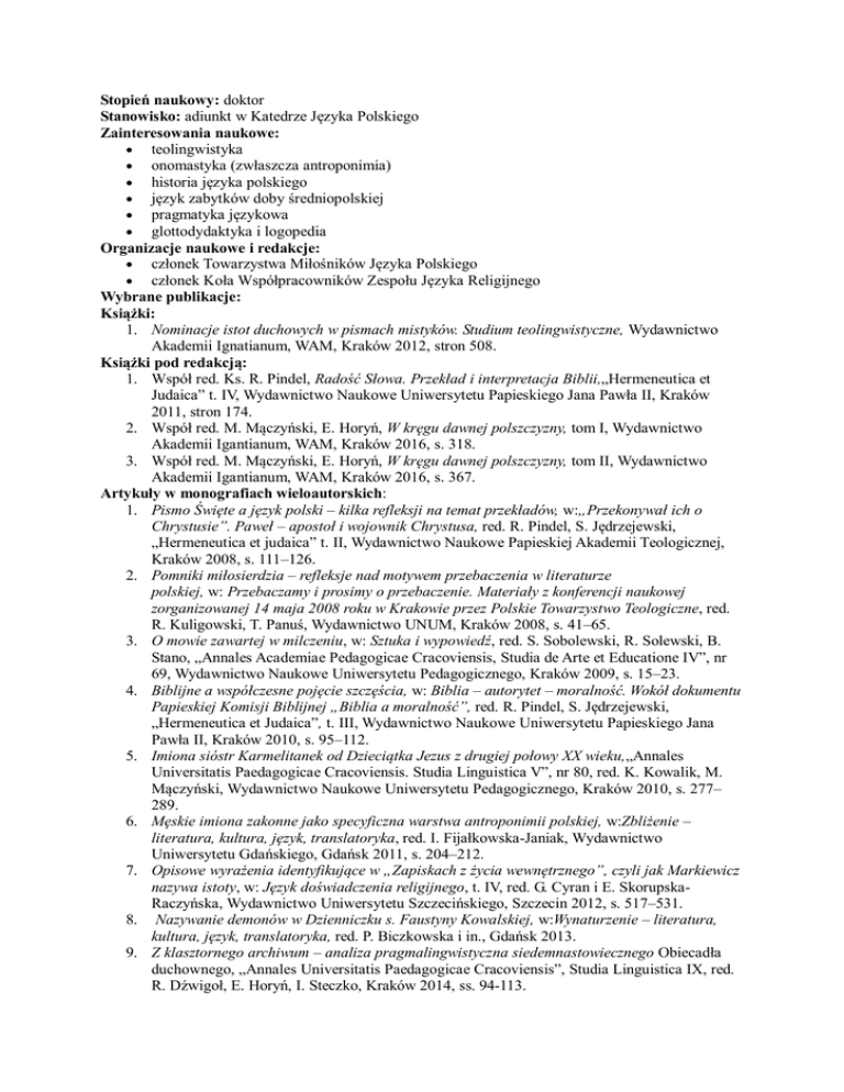 Stopień naukowy: doktor Stanowisko: adiunkt w Katedrze Języka Polskiego Zainteresowania naukowe: teolingwistyka onomastyka (zwłaszcza antroponimia) historia języka polskiego język zabytków doby średniopolskiej pragmatyka językowa glottodydaktyka i logopedia Organizacje naukowe i redakcje: członek Towarzystwa Miłośników Języka Polskiego członek Koła Współpracowników Zespołu Języka Religijnego Wybrane publikacje: Książki: 1. Nominacje istot duchowych w pismach mistyków. Studium teolingwistyczne, Wydawnictwo Akademii Ignatianum, WAM, Kraków 2012, stron 508. Książki pod redakcją: 1. Współ red. Ks. R. Pindel, Radość Słowa. Przekład i interpretacja Biblii,„Hermeneutica et Judaica” t. IV, Wydawnictwo Naukowe Uniwersytetu Papieskiego Jana Pawła II, Kraków 2011, stron 174. 2. Współ red. M. Mączyński, E. Horyń, W kręgu dawnej polszczyzny, tom I, Wydawnictwo Akademii Igantianum, WAM, Kraków 2016, s. 318. 3. Współ red. M. Mączyński, E. Horyń, W kręgu dawnej polszczyzny, tom II, Wydawnictwo Akademii Igantianum, WAM, Kraków 2016, s. 367. Artykuły w monografiach wieloautorskich: 1. Pismo Święte a język polski – kilka refleksji na temat przekładów, w:„Przekonywał ich o Chrystusie”. Paweł – apostoł i wojownik Chrystusa, red. R. Pindel, S. Jędrzejewski, „Hermeneutica et judaica” t. II, Wydawnictwo Naukowe Papieskiej Akademii Teologicznej, Kraków 2008, s. 111–126. 2. Pomniki miłosierdzia – refleksje nad motywem przebaczenia w literaturze polskiej, w: Przebaczamy i prosimy o przebaczenie. Materiały z konferencji naukowej zorganizowanej 14 maja 2008 roku w Krakowie przez Polskie Towarzystwo Teologiczne, red. R. Kuligowski, T. Panuś, Wydawnictwo UNUM, Kraków 2008, s. 41–65. 3. O mowie zawartej w milczeniu, w: Sztuka i wypowiedź, red. S. Sobolewski, R. Solewski, B. Stano, „Annales Academiae Pedagogicae Cracoviensis, Studia de Arte et Educatione IV”, nr 69, Wydawnictwo Naukowe Uniwersytetu Pedagogicznego, Kraków 2009, s. 15–23. 4. Biblijne a współczesne pojęcie szczęścia, w: Biblia – autorytet – moralność. Wokół dokumentu Papieskiej Komisji Biblijnej „Biblia a moralność”, red. R. Pindel, S. Jędrzejewski, „Hermeneutica et Judaica”, t. III, Wydawnictwo Naukowe Uniwersytetu Papieskiego Jana Pawła II, Kraków 2010, s. 95–112. 5. Imiona sióstr Karmelitanek od Dzieciątka Jezus z drugiej połowy XX wieku,„Annales Universitatis Paedagogicae Cracoviensis. Studia Linguistica V”, nr 80, red. K. Kowalik, M. Mączyński, Wydawnictwo Naukowe Uniwersytetu Pedagogicznego, Kraków 2010, s. 277– 289. 6. Męskie imiona zakonne jako specyficzna warstwa antroponimii polskiej, w:Zbliżenie – literatura, kultura, język, translatoryka, red. I. Fijałkowska-Janiak, Wydawnictwo Uniwersytetu Gdańskiego, Gdańsk 2011, s. 204–212. 7. Opisowe wyrażenia identyfikujące w „Zapiskach z życia wewnętrznego”, czyli jak Markiewicz nazywa istoty, w: Język doświadczenia religijnego, t. IV, red. G. Cyran i E. SkorupskaRaczyńska, Wydawnictwo Uniwersytetu Szczecińskiego, Szczecin 2012, s. 517–531. 8. Nazywanie demonów w Dzienniczku s. Faustyny Kowalskiej, w:Wynaturzenie – literatura, kultura, język, translatoryka, red. P. Biczkowska i in., Gdańsk 2013. 9. Z klasztornego archiwum – analiza pragmalingwistyczna siedemnastowiecznego Obiecadła duchownego, „Annales Universitatis Paedagogicae Cracoviensis”, Studia Linguistica IX, red. R. Dźwigoł, E. Horyń, I. Steczko, Kraków 2014, ss. 94-113. 10. Frazeologia w siedemnastowiecznych modlitewnikach karmelitańskich, w:Parémie národů slovanských VII, red. E. Mrhačová, U. Kolberová, Wydział Filozoficzny Uniwersytetu Ostrawskiego, Ostrawa 2014, s. 141-154. 11. Imię zakonne znakiem religijności i tożsamości, w: Język tożsamości, red. G. Cyran, E. Skorupska-Raczyńska, Gorzów Wielkopolski 2015, s. 209-222. 12. Maria jako imię zakonne, „Onomastica” R. LIX, 2015, s. 137-151. 13. Tytuły tekstów modlitewnych (na materiale XVII-wiecznych modlitewników), w: W kręgu dawnej polszczyzny, tom I, red. M. Mączyński, E. Horyń, E. Zmuda, Wydawnictwo Akademii Ignatianum, WAM, Kraków 2016, s. Planowane prace badawcze: Język XVII-wiecznych modlitewników i medytacji (analiza rękopisów znajdujących się w wybranych zakonach żeńskich) (kilkuletni projekt badawczy) Męskie i żeńskie imiona zakonne na przykładzie imion karmelitów i karmelitanek bosych (w przygotowaniu monografia) Żeńskie imiona zakonne (w przygotowaniu monografia) Kontakt: [email protected]