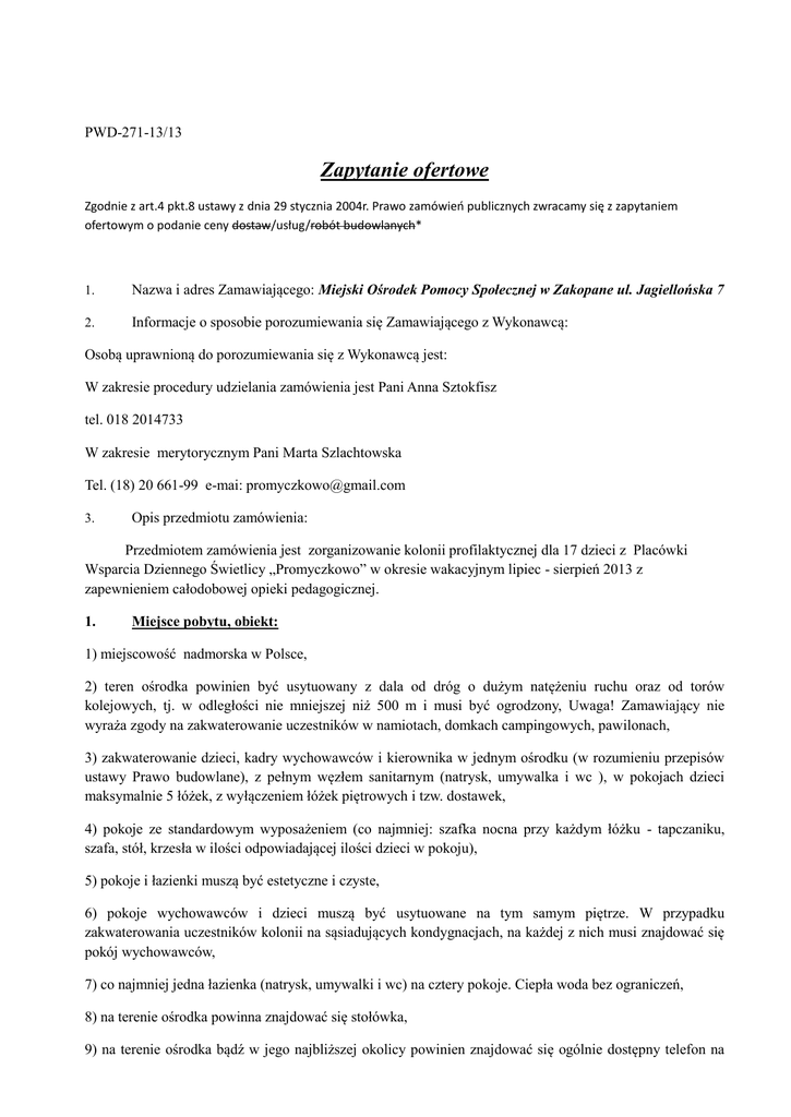 PWD-271-13/13 Zapytanie ofertowe Zgodnie z art.4 pkt.8 ustawy z dnia 29 stycznia 2004r. Prawo zamówień publicznych zwracamy się z zapytaniem ofertowym o podanie ceny dostaw/usług/robót budowlanych* 1. Nazwa i adres Zamawiającego: Miejski Ośrodek Pomocy Społecznej w Zakopane ul. Jagiellońska 7 2. Informacje o sposobie porozumiewania się Zamawiającego z Wykonawcą: Osobą uprawnioną do porozumiewania się z Wykonawcą jest: W zakresie procedury udzielania zamówienia jest Pani Anna Sztokfisz tel. 018 2014733 W zakresie merytorycznym Pani Marta Szlachtowska Tel. (18) 20 661-99 e-mai: [email protected] 3. Opis przedmiotu zamówienia: Przedmiotem zamówienia jest zorganizowanie kolonii profilaktycznej dla 17 dzieci z Placówki Wsparcia Dziennego Świetlicy „Promyczkowo” w okresie wakacyjnym lipiec - sierpień 2013 z zapewnieniem całodobowej opieki pedagogicznej. 1. Miejsce pobytu, obiekt: 1) miejscowość nadmorska w Polsce, 2) teren ośrodka powinien być usytuowany z dala od dróg o dużym natężeniu ruchu oraz od torów kolejowych, tj. w odległości nie mniejszej niż 500 m i musi być ogrodzony, Uwaga! Zamawiający nie wyraża zgody na zakwaterowanie uczestników w namiotach, domkach campingowych, pawilonach, 3) zakwaterowanie dzieci, kadry wychowawców i kierownika w jednym ośrodku (w rozumieniu przepisów ustawy Prawo budowlane), z pełnym węzłem sanitarnym (natrysk, umywalka i wc ), w pokojach dzieci maksymalnie 5 łóżek, z wyłączeniem łóżek piętrowych i tzw. dostawek, 4) pokoje ze standardowym wyposażeniem (co najmniej: szafka nocna przy każdym łóżku - tapczaniku, szafa, stół, krzesła w ilości odpowiadającej ilości dzieci w pokoju), 5) pokoje i łazienki muszą być estetyczne i czyste, 6) pokoje wychowawców i dzieci muszą być usytuowane na tym samym piętrze. W przypadku zakwaterowania uczestników kolonii na sąsiadujących kondygnacjach, na każdej z nich musi znajdować się pokój wychowawców, 7) co najmniej jedna łazienka (natrysk, umywalki i wc) na cztery pokoje. Ciepła woda bez ograniczeń, 8) na terenie ośrodka powinna znajdować się stołówka, 9) na terenie ośrodka bądź w jego najbliższej okolicy powinien znajdować się ogólnie dostępny telefon na kartę magnetyczną/chipową, 10) ośrodek musi dysponować: świetlicą wyposażoną w stoliki i krzesła, gry planszowe, układanki itp., TV, salą przystosowaną do prowadzenia programu profilaktyki, 11) Wykonawca zapewni nieodpłatną dostępność do obiektów i sprzętów sportowych. Uwaga! Zamawiający przed podpisaniem umowy z wybranym wykonawcą zastrzega sobie prawo kontroli obiektu. 2. Ilość i czas trwania turnusu: 1) wypoczynek dla dzieci ma być zorganizowany w formie jednego turnusu, 2) czas trwania turnusu – 14 dni, tj 13 dób (13 noclegów w ośrodku pobytowym i 14 pełnych dni żywieniowych). 3.Liczba uczestników kolonii: Uczestnikami kolonii będą dzieci i młodzież w wieku 7 - 16 lat, ogółem 17 dzieci. Zamawiający we własnym zakresie zorganizuje nabór uczestników kolonii. Lista uczestników kolonii przekazywana będzie Wykonawcy zamówienia na 7 dni przed planowanym turnusem. 4.Wymogi dotyczące wyżywienia: 1) całodzienne wyżywienie, 2)zapewnienie suchego prowiantu na drogę powrotną z miejsca pobytu do Zakopanego oraz podczas całodniowych wycieczek zaplanowanych w programie ramowym kolonii, 3)dzieci muszą mieć stały dostęp do napoi - w stołówce lub na korytarzu przed stołówką Wykonawca udostępni przez całą dobę zimne napoje, kompot bądź herbatę, 4)posiłki winny być urozmaicone, odpowiadające normom żywienia opracowanym przez Instytut Żywności i Żywienia zarówno pod względem ilości, jak i jakości oraz wartości odżywczych, bogatych w witaminy, owoce i warzywa. 5. Transport: 1) transport zapewnia Wykonawca, 2) transport uczestników- autokar klasy turystycznej, 3) w czasie transportu musi być zapewniona opieka wychowawców, pomoc podczas wsiadania i wysiadania dzieci z środków transportu, a także pomoc przy korzystaniu z toalet w środkach transportu. Środek transportu, którym będą wykonywane usługi, musi posiadać: a) wyjścia awaryjne, b) dwie gaśnice, z których jedna powinna być umieszczona blisko kierowcy, a druga wewnątrz autobusu, w miejscu łatwo dostępnym, w razie zaistnienia potrzeby jej użycia, c) apteczkę doraźnej pomocy. Wykonawca gwarantuje, że kierowca środków transportu będzie posiadał przy sobie i okazywał na żądanie: a) prawo jazdy adekwatne do pojazdu, b) dowód rejestracyjny pojazdu, c) dokument stwierdzający zawarcie umowy obowiązkowego ubezpieczenia OC, NNW, d) inne dokumenty wynikające z ustawy o transporcie drogowym. Wykonawca ponosi wszelkie koszty związane z eksploatacją i używaniem pojazdów własnych oraz ewentualne koszty z tytułu kar, nałożonych na niego przez właściwe organy. 6. Ubezpieczenie: 1)Wykonawca zapewnia ubezpieczenie uczestników od następstw nieszczęśliwych wypadków i kosztów leczenia, 2)ubezpieczenie obejmuje okres od momentu przekazania dzieci pod opiekę wychowawców z miejsca zbiórki w Zakopanem, do momentu odebrania dzieci przez opiekunów/ rodziców w Zakopanem, 3)Wykonawca ponosi pełną odpowiedzialność za wszelkie szkody wyrządzone przez uczestników kolonii w trakcie podróży oraz podczas pobytu dziecka w ośrodku, 4)Wykonawca zobowiązany jest do posiadania ubezpieczenia OC. 7. Opieka: 1. Na turnusie Wykonawca zapewnia: a) całodobową opiekę uprawnionych wychowawców, w liczbie zgodnej z normami rozporządzenia Ministra Edukacji Narodowej z dnia 21 stycznia 1997 r. w sprawie warunków, jakie muszą spełniać organizatorzy wypoczynku dla dzieci i młodzieży szkolnej, a także zasad jego organizowania i nadzorowania (Dz. U. z 1997 r. Nr 12, poz. 67 z późniejszymi zmianami), b) kierownika kolonii z uprawnieniami MEN stosownie do w/w rozporządzenia, c) osobę/osoby realizujące program profilaktyki uzależnień -
