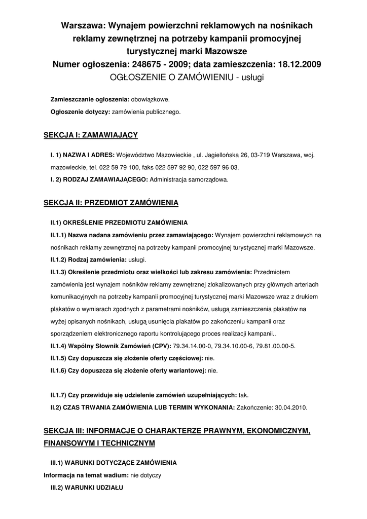 Warszawa: Wynajem powierzchni reklamowych na no nikach reklamy zewn trznej na potrzeby kampanii promocyjnej turystycznej marki Mazowsze Numer ogłoszenia: 248675 - 2009; data zamieszczenia: 18.12.2009 OGŁOSZENIE O ZAMÓWIENIU - usługi Zamieszczanie ogłoszenia: obowi zkowe. Ogłoszenie dotyczy: zamówienia publicznego. SEKCJA I: ZAMAWIAJ CY I. 1) NAZWA I ADRES: Województwo Mazowieckie , ul. Jagiello ska 26, 03-719 Warszawa, woj. mazowieckie, tel. 022 59 79 100, faks 022 597 92 90, 022 597 96 03. I. 2) RODZAJ ZAMAWIAJ CEGO: Administracja samorz dowa. SEKCJA II: PRZEDMIOT ZAMÓWIENIA II.1) OKRE LENIE PRZEDMIOTU ZAMÓWIENIA II.1.1) Nazwa nadana zamówieniu przez zamawiaj cego: Wynajem powierzchni reklamowych na no nikach reklamy zewn trznej na potrzeby kampanii promocyjnej turystycznej marki Mazowsze. II.1.2) Rodzaj zamówienia: usługi. II.1.3) Okre lenie przedmiotu oraz wielko ci lub zakresu zamówienia: Przedmiotem zamówienia jest wynajem no ników reklamy zewn trznej zlokalizowanych przy głównych arteriach komunikacyjnych na potrzeby kampanii promocyjnej turystycznej marki Mazowsze wraz z drukiem plakatów o wymiarach zgodnych z parametrami no ników, usług zamieszczenia plakatów na wy ej opisanych no nikach, usług usuni cia plakatów po zako czeniu kampanii oraz sporz dzeniem elektronicznego raportu kontroluj cego proces realizacji kampanii.. II.1.4) Wspólny Słownik Zamówie (CPV): 79.34.14.00-0, 79.34.10.00-6, 79.81.00.00-5. II.1.5) Czy dopuszcza si zło enie oferty cz ciowej: nie. II.1.6) Czy dopuszcza si zło enie oferty wariantowej: nie. II.1.7) Czy przewiduje si udzielenie zamówie uzupełniaj cych: tak. II.2) CZAS TRWANIA ZAMÓWIENIA LUB TERMIN WYKONANIA: Zako czenie: 30.04.2010. SEKCJA III: INFORMACJE O CHARAKTERZE PRAWNYM, EKONOMICZNYM, FINANSOWYM I TECHNICZNYM III.1) WARUNKI DOTYCZ CE ZAMÓWIENIA Informacja na temat wadium: nie dotyczy III.2) WARUNKI UDZIAŁU • Opis warunków udziału w post powaniu oraz opis sposobu dokonywania oceny spełniania tych warunków: 1. O udzielenie zamówienia mog ubiega si wykonawcy, którzy: 1)posiadaj uprawnienia do wykonywania okre lonej działalno ci lub czynno ci, je eli ustawy nakładaj obowi zek posiadania takich uprawnie ; 2)posiadaj niezb dn wiedz i do wiadczenie, oraz dysponuj potencjałem technicznym lub przedstawi pisemne zobowi zanie innych podmiotów do udost pnienia potencjału technicznego niezb dnego do wykonania zamówienia, a w szczególno ci w okresie ostatnich 3 lat przed dniem wszcz cia post powania o udzielenie zamówienia, a je eli okres prowadzenia działalno ci jest krótszy - w tym okresie, zrealizowali co najmniej 1 zamówienie tego samego rodzaju polegaj ce na zrealizowaniu kampanii reklamowej na no nikach reklamy zewn trznej o zasi gu min. miasta powiatowego 3) nie podlegaj wykluczeniu z post powania o udzielenie zamówienia. 2.Wykonawcy mog wspólnie ubiega si o udzielenie zamówienia. 3.W przypadku udziału w post powaniu wykonawców wyst puj cych wspólnie, wykonawcy ustanawiaj pełnomocnika do reprezentowania ich w post powaniu o udzielenie zamówienia lub reprezentowania i zawarcia umowy w sprawie zamówienia publicznego. 4.W przypadku udziału w post powaniu wykonawców wyst puj cych wspólnie, zamawiaj cy dopuszcza mo liwo ł cznego spełniania i dokumentowania warunków o których mowa w ust. 1 pkt 1-2. 5.Warunek, o którym mowa w ust. 1 pkt 3 ka dy z wykonawców musi spełni i udokumentowa samodzielnie 6.Ocena spełniania warunków wymaganych od wykonawcy w post powaniu o zamówienie publiczne zostanie dokonana przez Komisj przetargow poprzez analiz zło onych dokumentów lub o wiadcze przy zastosowaniu formuły spełnia/nie spełnia, z zastrze eniem art. 26 ust. 3 ustawy.. • Informacja o o wiadczeniach i dokumentach, jakie maj dostarczy wykonawcy w celu potwierdzenia spełniania warunków udziału w post powaniu: 1.Ka dy z wykonawców zobowi zany jest do zło enia o wiadcze zgodnych z art. 22 ust. 1 i z art. 24 ust. 1 i 2 p.z.p., których wzór stanowi zał czniki nr 4A i 4B do siwz dost pnej na stronie internetowej www.zamowienia.mazovia.pl 2.W przypadku wykonawców wyst puj cych wspólnie do zło enia o wiadcze zgodnych z art. 24 ust. 1 i 2 p.z.p. zobowi zany jest ka dy z wykonawców wyst puj cych wspólnie. Okoliczno ci uzasadniaj ce wykluczenie z post powania w oparciu o przepisy art. 24 ust. 1 i 2 p.z.p. zachodz ce cho by wzgl dem pojedynczego wykonawcy dyskwalifikuj cał grup wykonawców ubiegaj cych si wspólnie o udzielenie zamówienia. O wiadczenie z art. 22 mo e zło y pełnomocnik stron. 3.W celu potwierdzenia, e wykonawca posiada uprawnienie do wykonywania okre lonej działalno ci lub czynno ci oraz nie podlega wykluczeniu na podstawie art. 24 p.z.p., zamawiaj cy po wiadczonej na ka dej stronie (zawieraj cej tre da, w formie oryginału lub kserokopii ) za zgodno z oryginałem przez wykonawc aktualnego odpisu z wła ciwego rejestru albo aktualnego za wiadczenia o wpisie do ewidencji działalno ci gospodarczej, je eli odr bne przepisy wymagaj wpisu do rejestru lub zgłoszenia do ewidencji działalno ci gospodarczej, wystawionego nie wcze niej ni 6 miesi cy przed upływem terminu składania ofert. 4.w celu potwierdzenia opisanego przez zamawiaj cego warunku posiadania przez wykonawc niezb dnej wiedzy i do wiadczenia osobami zdolnymi do wykonania zamówienia, zamawiaj cy da: a) zło enia wykazu wykonanych usług w okresie ostatnich 3 lat przed dniem wszcz cia post powania o udzielenie zamówienia, a je eli okres prowadzenia działalno ci jest krótszy - w tym okresie, odpowiadaj cych swoim rodzajem usługom stanowi cym przedmiot zamówienia, z podaniem ich warto ci, przedmiotu, dat wykonania i odbiorców oraz zał czenia dokumentów potwierdzaj cych, e te usługi zostały wykonane nale ycie, b) zło enia o wiadczenia, e Wykonawca dysponuje i/lub posiada pisemne zobowi zanie innych podmiotów do udost pnienia potencjału technicznego niezb dnego do wykonania zamówienia - no niki rekla