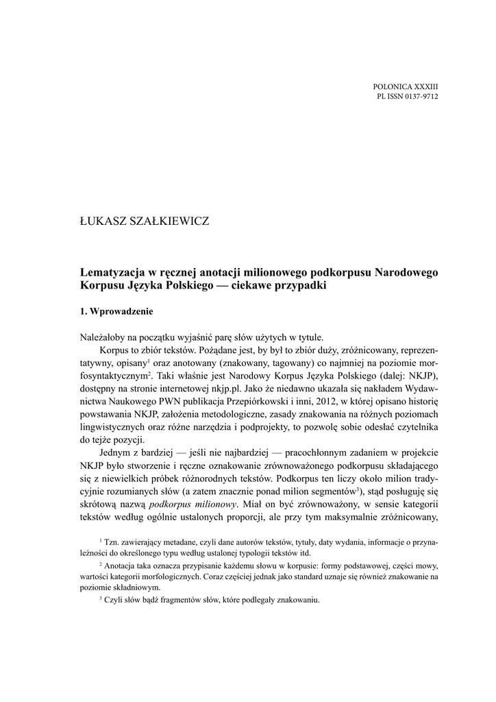 POLONICA XXXIII PL ISSN 0137-9712 ŁUKASZ SZAŁKIEWICZ Lematyzacja w ręcznej anotacji milionowego podkorpusu Narodowego Korpusu Języka Polskiego — ciekawe przypadki 1. Wprowadzenie Należałoby na początku wyjaśnić parę słów użytych w tytule. Korpus to zbiór tekstów. Pożądane jest, by był to zbiór duży, zróżnicowany, reprezentatywny, opisany1 oraz anotowany (znakowany, tagowany) co najmniej na poziomie morfosyntaktycznym2. Taki właśnie jest Narodowy Korpus Języka Polskiego (dalej: NKJP), dostępny na stronie internetowej nkjp.pl. Jako że niedawno ukazała się nakładem Wydawnictwa Naukowego PWN publikacja Przepiórkowski i inni, 2012, w której opisano historię powstawania NKJP, założenia metodologiczne, zasady znakowania na różnych poziomach lingwistycznych oraz różne narzędzia i podprojekty, to pozwolę sobie odesłać czytelnika do tejże pozycji. Jednym z bardziej — jeśli nie najbardziej — pracochłonnym zadaniem w projekcie NKJP było stworzenie i ręczne oznakowanie zrównoważonego podkorpusu składającego się z niewielkich próbek różnorodnych tekstów. Podkorpus ten liczy około milion tradycyjnie rozumianych słów (a zatem znacznie ponad milion segmentów3), stąd posługuję się skrótową nazwą podkorpus milionowy. Miał on być zrównoważony, w sensie kategorii tekstów według ogólnie ustalonych proporcji, ale przy tym maksymalnie zróżnicowany, Tzn. zawierający metadane, czyli dane autorów tekstów, tytuły, daty wydania, informacje o przynależności do określonego typu według ustalonej typologii tekstów itd. 2 Anotacja taka oznacza przypisanie każdemu słowu w korpusie: formy podstawowej, części mowy, wartości kategorii morfologicznych. Coraz częściej jednak jako standard uznaje się również znakowanie na poziomie składniowym. 3 Czyli słów bądź fragmentów słów, które podlegały znakowaniu. 1 134 Łukasz Szałkiewicz a więc zawierać teksty wszelkich możliwych stylów z różnych źródeł komunikacyjnych. W ten sposób znalazło się też w nim około 10 procent języka mówionego4. Jako że autentyczny język konwersacyjny istotnie różni się od innych odmian polszczyzny, to tu pojawiło się najwięcej problemów związanych ze znakowaniem, w tym problemów dotyczących lematyzacji. A ponieważ często język Internetu ma duży związek z językiem mówionym, to i w znakowaniu tekstów internetowych pojawiały się podobne problemy. Podkorpus milionowy zawiera krótkie próbki tekstu (40–70 słów5) dobierane losowo. Pojedyncza próbka powinna stanowić logiczną całość, zawierać w miarę możliwości całe zdania (na przykład nie powinna składać się z końca jednego i początku drugiego akapitu ani urywać się w połowie zdania złożonego), z przewagą rzeczywistego materiału językowego — bez nadmiaru cyfr, symboli itp., bez np. wyników meczów sportowych. Korpus ten został ręcznie oznakowany, a wyniki anotacji dostępne są na stronie internetowej http://clip.ipipan.waw.pl/LRT lub w formie wyszukiwarki tekstów na stronach nkjp.pl. Do danych tych planowane jest dołączenie wyników nowej ręcznej anotacji (wykonanej na tych samych zasadach) Korpusu Frekwencyjnego (KF)6. W artykule tym będę korzystał także z doświadczeń znakowania KF (w tym część przykładów będzie pochodziła właśnie z niego). Po co znakować? To pytanie nie wymaga rozbudowanej odpowiedzi. Bez odpowiedniego oznakowania (wprowadzenia danych lingwistycznych) efektywne korzystanie z korpusu byłoby praktycznie niemożliwe. W związku z tym pożądane jest, by był on ręcznie (tzn. przez człowieka, nie przez maszynę) oznakowany. Najlepiej w taki sposób, by dany fragment tekstu tagowało niezależnie dwóch lingwistów (tzw. anotatorów), a rozbieżności między nimi rozsądzała osoba trzecia (tzw. superanotator). I tak właśnie było w przypadku anotacji podkorpusu milionowego. Szczegóły tej procedury opisane zostały w pozycji Szałkiewicz, Przepiórkowski, 2012, w podrozdziale „Anotatornia i znakowanie”. Ręczna anotacja jest jednak bardzo pracochłonna i kosztowna. Nie ma możliwości, by oznaczyć tak cały korpus wielkości NKJP. Można więc postawić pytanie, po co w ogóle znakować ręcznie, skoro i tak musi to zrobić automatycznie program. Weźmy jednak pod uwagę, że programy takie muszą się nauczyć znakować teksty, a do tego potrzebują tekstów znakowanych przez człowieka. Podkorpus milionowy posłużył do wytrenowania narzędzia PANTERA (Acedański 2012), wykorzystanego następnie do automatycznego oznakowania pełnego NKJP7. Z tym że prócz samego języka konwersacyjnego (nagrania i transkrypcje) liczy się tutaj tzw. to-be-spoken (np. stenogramy sejmowe), dane mówione medialne itp. Zob. Pęzik, 2012. 5 Daje to zwykle kilka zdań — polskie zdanie ma średnio 16 słów. 6 Korpus Frekwencyjny (korpus Słownika frekwencyjnego polszczyzny współczesnej) to zbiór próbek tekstów zebranych w latach 1963–1967 na potrzeby badań nad częstością występowania wyrazów w języku polskim. Dalsze informacje, spis publikacji oraz dane korpusu można znaleźć na stronie internetowej http:// clip.ipipan.waw.pl/PL196x. Nowa anotacja KF wykonana została w IPI PAN w ramach projektu naukowego CESAR (Central and South-East European Resources). 7 Wyniki tej anotacji dostępne są na stronie internetowej nkjp.pl. 4 Lematyzacja w ręcznej anotacji milionowego podkorpusu Narodowego Korpusu Języka Polskiego... 135 Warto zaznaczyć, że otagowany podkorpus milionowy to także wartość sama w sobie. Jest to bowiem na tyle duży zbiór słów, że może być wystarczający dla pewnych celów. Ponadto jego oznakowanie jest dużo bardziej wiarygodne niż całego NKJP, ponieważ zostało dokonane przez człowieka. Jakość tego oznakowania wzmacnia jeszcze to, że w ramach projektu CESAR w IPI PAN przeprowadzono proces wyszukiwania i poprawiania błędów ręcznej anotacji8. Zoba