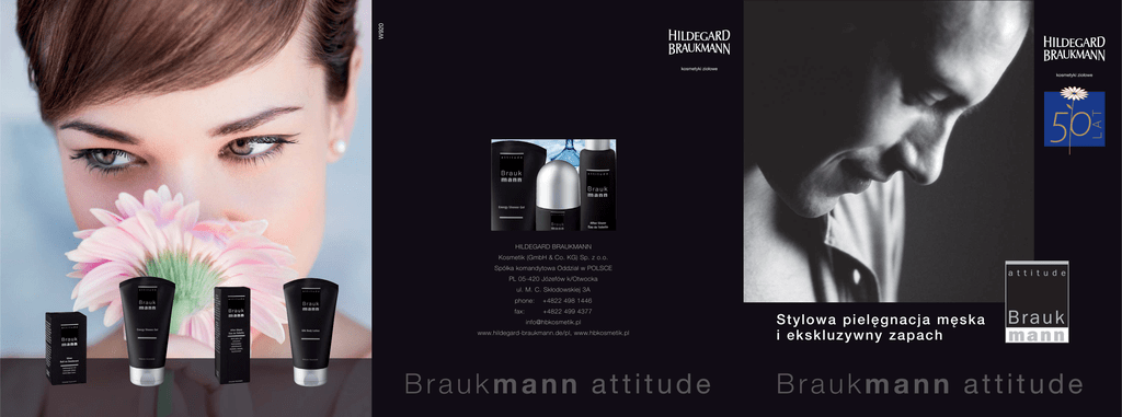 W920 kosmetyki zio³owe kosmetyki zio³owe HILDEGARD BRAUKMANN Kosmetik (GmbH & Co. KG) Sp. z o.o. Spółka komandytowa Oddział w POLSCE PL 05-420 Józefów k/Otwocka ul. M. C. Skłodowskiej 3A phone: +4822 498 1446 fax: +4822 499 4377 [email protected] www.hildegard-braukmann.de/pl, www.hbkosmetik.pl Braukmann attitude S t ylow a pielęgnacja m ęska i ekskluzyw ny zapach Braukmann attitude Z A PA C H ŚMIAŁY ZMYSŁOWY NOWOCZESNY E n e r g i z u j ą c y że l pod pr ysznic O W I E L U N U TA C H W C I Ą Ż O D K RY WA N Y Powe r s h owe r - i n t r yg u jący zapach i substacje p o c h o d ze n i a m o r s k i e g o NA NOWO Wo d a to a l e towa p o g o l e n i u M u l t i a k t y w n a , o e k s k l u z yw ny m m ę s k i m z a p a c h u Braukmann attitude O r zeź w i a j ą c y p r y s z n i c i te rapia t h a l a s s o: dzięki z awa r to ś c i w yc i ą g ów z a l g i p i e r w i a s t kó w ś l a d o w y c h p o c h o d ze n i a m o r s k i e g o m a w ł a ś c i w o ś c i r e w i t a l i z u j ą c e. P row i t a m i n a B 5 ( p a nt h e n o l ) p i e l ę g n u j e s kó rę i w ł o s y. Emulsja po goleniu oraz w o d a to a l e to w a w j e d n y m. Pielęgnacja plus zapach – pe r fekcyjna kombinacja st wo r zo n a dl a n owo cze s n e g o m ę ż c z y z n y. U s p o k a j a , w yg ł a d z a i p i e l ę g n u j e s kó rę. Z a p a c h m o c ny i e l e g a n c k i, subtelnie prowokujący i u wo d z i c i e l s k i. to wyjątkowa mini seria kosmetyków, 15 0 m l 75 m l J e d wa b i s t y b a l s a m do ciała Przyjemnie lekka emulsja o męskim zapachu Wa r to ś c i o w e p r o t e i n y j e d wa b i u o r a z a k t y w n i e o d d z i ał u j ą c e n a s kó r ę s u b s t a n c j e n a w i l ż a j ą c e n a d a j ą u cz u c i e e k s k l u z y w n e j p i e l ę - g n a c j i. Pe r fe kc y j n i e z a d b a n a s kó r a. 15 0 m l które dzięki niepowtarzalnej kompozycji łączą pielęgnację i zapach. Wyszukane produkty do pielęgnacji, zawierające JONY SREBRA substancje nawilżające, ujędrniające AKTYWNE SOLE ALUMINIUM i odżywcze połączone ze stylowym ARGININA męskim, pobudzającym zmysły, zapachem. Silver R oll on - Dezodor ant Z A PA C H I PIELĘGNACJA Antyperspirant z jonami srebra. Bezalko ho lo wy ro ll-o n skutecznie zmniejszający p o tliwość . Biologicznie aktywne elementarne jony srebra długotrwale neutralizują nieprzyjemne zap a c h y. N i e z a w o d n a o c h r o n a i p rzyjemne uczucie czystoś ci - również dla skóry wrażliwej i p o go leniu. 50 ml WODA MORSKA ALANTOINA PROTEINY JEDWABIU WYCIĄGI Z BLUSZCZU OCZAR WIRGINIJSKI PA N T E N O L PA N T E N O L BISABOLOL PA L M A S A B A L O W A FA R N E S O L MASŁO KAKAOWE Z a p a c h : Świe ie eża b er e ga a mo mota ta i s ty t mulująca lawenda mieszają się z korzennym, afrodyzującym aromatem kolend d r y Woń kon dry. onwa waliliii i kw k iatów pomarańczy przenosi do kolejnej nuty – w pikantną świeżość zapachu hu s to topn p io pn iow wo w kr krac acza za a towarzyszka delikatnej ambry i łagodnej wanilii – zmysłowość drzewa sandałowe e g o, któr kttór ó a na nada daje je c ałł ej e kompozycji trwałą moc uwodzenia.