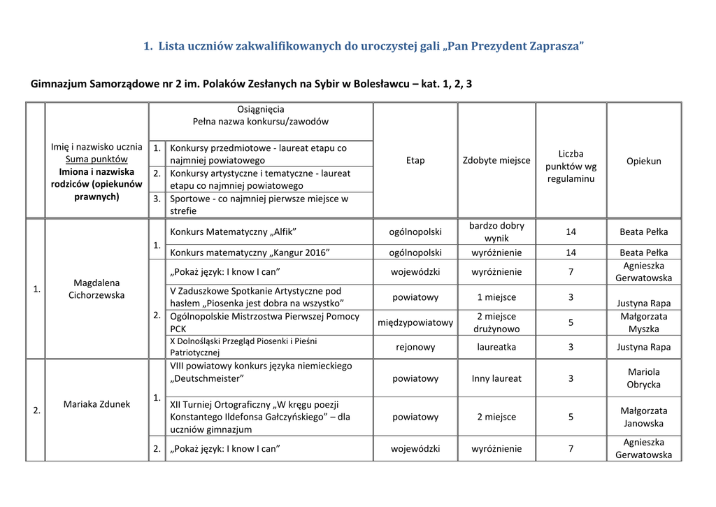 1. Lista uczniów zakwalifikowanych do uroczystej gali „Pan Prezydent Zaprasza” Gimnazjum Samorządowe nr 2 im. Polaków Zesłanych na Sybir w Bolesławcu – kat. 1, 2, 3 Osiągnięcia Pełna nazwa konkursu/zawodów Imię i nazwisko ucznia Suma punktów Imiona i nazwiska rodziców (opiekunów prawnych) 1. Konkursy przedmiotowe - laureat etapu co najmniej powiatowego 2. Konkursy artystyczne i tematyczne - laureat etapu co najmniej powiatowego 3. Sportowe - co najmniej pierwsze miejsce w strefie 1. 1. Magdalena Cichorzewska Opiekun Konkurs matematyczny „Kangur 2016” ogólnopolski bardzo dobry wynik wyróżnienie „Pokaż język: I know I can” wojewódzki wyróżnienie 7 powiatowy 1 miejsce 3 międzypowiatowy 2 miejsce drużynowo 5 rejonowy laureatka 3 Justyna Rapa powiatowy Inny laureat 3 Mariola Obrycka powiatowy 2 miejsce 5 Małgorzata Janowska wojewódzki wyróżnienie 7 Agnieszka Gerwatowska VIII powiatowy konkurs języka niemieckiego „Deutschmeister” 2. Liczba punktów wg regulaminu ogólnopolski V Zaduszkowe Spotkanie Artystyczne pod hasłem „Piosenka jest dobra na wszystko” 2. Ogólnopolskie Mistrzostwa Pierwszej Pomocy PCK 1. Zdobyte miejsce Konkurs Matematyczny „Alfik” X Dolnośląski Przegląd Piosenki i Pieśni Patriotycznej Mariaka Zdunek Etap XII Turniej Ortograficzny „W kręgu poezji Konstantego Ildefonsa Gałczyńskiego” – dla uczniów gimnazjum 2. „Pokaż język: I know I can” 14 Beata Pełka 14 Beata Pełka Agnieszka Gerwatowska Justyna Rapa Małgorzata Myszka Wojewódzki konkurs „ I Ty możesz zostać Demostenesem! Dolnośląski uczeń Mistrzem Mowy Polskiej” Ogólnopolskie Mistrzostwa Pierwszej Pomocy PCK X Dolnośląski Przegląd Piosenki i Pieśni Patriotycznej 1. 3. Wiktoria Przybylska 2. 4. Michał Jóźków 1. 1. 5. Maja Siegień 2. VIII Ogólnopolska Olimpiada „Myśli Jana Pawła 2” Ogólnopolska Akademia – Konkurs Wiedzy o Prawie VIII Ogólnopolska Olimpiada „Myśli Jana Pawła 2” VIII Powiatowy Konkurs Wiedzy o Janie Pawle 2” Ogólnopolski Konkurs Literacki na list pisany odręcznie „Gdybym mógł cofnąć czas…” Ogólnopolski Konkurs Literacki na list pisany odręcznie „Gdybym mógł cofnąć czas…” w kat. kaligrafia V Zaduszkowe Spotkanie Artystyczne pod hasłem „Piosenka jest dobra na wszystko” w kat. Recytacja 61. Dolnośląski Konkurs Recytatorski 6. Klaudia Miżdal Ogólnopolski Konkurs Literacki na list pisany 1. odręcznie „Gdybym mógł cofnąć czas…” Ogólnopolski Konkurs Literacki na list pisany odręcznie „Gdybym mógł cofnąć czas…” w kat. kaligrafia Województwo 2 miejsce międzypowiatowy 2 miejsce drużynowo 5 Małgorzata Janowska Małgorzata Myszka rejonowy laureatka 3 Justyna Rapa ogólnopolski wojewódzki finalistka 3 miejsce 14 8 Ewa Chrobot ogólnopolski ogólnopolski wojewódzki finalistka finalista 1 miejsce 8 14 10 powiatowy 2 miejsce 5 ogólnopolski 1 miejsce 20 ogólnopolski 1 miejsce 20 powiatowy 2miejsce międzypowiatowy powiatowy laureat laureat ogólnopolski wyróżnienie 9 3 5 3 Beata Orczyk Ewa Chrobot Małgorzata Janowska 14 Ewa Ołenicz Bernacka Ewa Ołenicz Bernacka ogólnopolski wyróżnienie 14 3. Mistrzostwa Strefy Jeleniogórskiej w siatkówce strefowy I miejsce drużynowo 3 Jadwiga Stachów XII Turniej Ortograficzny „W kręgu poezji Konstantego Ildefonsa Gałczyńskiego” – dla powiatowy Inny laureat 3 Ewa Ołenicz - uczniów gimnazjów 1. 7. 8. Radosław Kalamarz Marta Sarkowicz Bernacka XII Dolnośląski Konkurs Bezpieczeństwa dla Dzieci i Młodzieży „Uczę się bezpiecznie żyć” powiatowy regionalny wojewódzki 1 miejsce 3 miejsce finalista 6 6 7 Ogólnopolskie Mistrzostwa Pierwszej Pomocy PCK międzypowiatowy 2 miejsce 5 rejonowy laureat 3 2. X Dolnośląski Przegląd Piosenki i Pieśni Patriotycznej 1. Międzynarodowy Konkurs matematyczny „Kangur” ogólnopolski wyróżnienie 14 3. Mistrzostwa Strefy jeleniogórskiej w siatkówce strefowy I miejsce 3 Małgorzata Myszka Małgorzata Myszka Justyna Rapa Ewa Mieniek Jadwiga Stachów