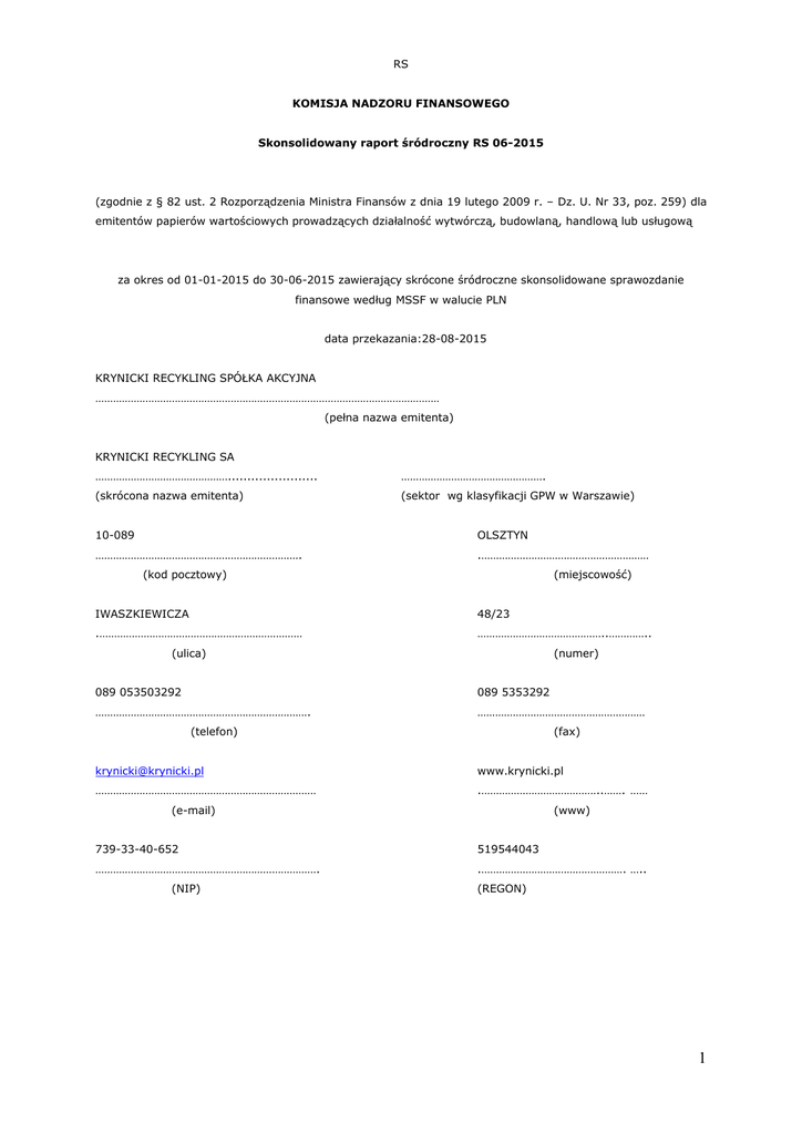 RS KOMISJA NADZORU FINANSOWEGO Skonsolidowany raport śródroczny RS 06-2015 (zgodnie z § 82 ust. 2 Rozporządzenia Ministra Finansów z dnia 19 lutego 2009 r. – Dz. U. Nr 33, poz. 259) dla emitentów papierów wartościowych prowadzących działalność wytwórczą, budowlaną, handlową lub usługową za okres od 01-01-2015 do 30-06-2015 zawierający skrócone śródroczne skonsolidowane sprawozdanie finansowe według MSSF w walucie PLN data przekazania:28-08-2015 KRYNICKI RECYKLING SPÓŁKA AKCYJNA ……………………………………………………………………………………………………… (pełna nazwa emitenta) KRYNICKI RECYKLING SA ………………………………………....................... …………………………………………. (skrócona nazwa emitenta) (sektor wg klasyfikacji GPW w Warszawie) 10-089 OLSZTYN ……………………………………………………………. .………………………………………………… (kod pocztowy) (miejscowość) IWASZKIEWICZA 48/23 .…………………………………………………………… ……………………………………..………….. (ulica) (numer) 089 053503292 089 5353292 ………………………………………………………………. ………………………………………………… (telefon) (fax) [email protected] www.krynicki.pl ………………………………………………………………… .…………………………………..……. …… (e-mail) (www) 739-33-40-652 519544043 …………………………………………………………………. .…………………………………………. ….. (NIP) (REGON) 1 Grupa Kapitałowa Krynicki Recykling S.A. ZAWARTOŚĆ RAPORTU Raport 06-2015 skonsolidowany Raport zarządu 06-2015 skonsolidowany Raport biegłych 2 Grupa Kapitałowa Krynicki Recykling S.A. PODPISY WSZYSTKICH CZŁONKÓW ZARZĄDU Data Imię i Nazwisko Stanowisko/Funkcja Podpis PODPIS OSOBY, KTÓREJ POWIERZONO PROWADZENIE KSIĄG RACHUNKOWYCH Data Imię i Nazwisko Stanowisko/Funkcja Podpis Grupa Kapitałowa KRYNICKI RECYKLING S.A. 3 Grupa Kapitałowa Krynicki Recykling S.A. SKRÓCONE ŚRÓDROCZNE SKONSOLIDOWANE SPRAWOZDANIE FINANSOWE ZA OKRES OD 1 STYCZNIA 2015 DO 30 CZERWCA 2015 Olsztyn 21-08-2015 4 Grupa Kapitałowa Krynicki Recykling S.A. WYBRANE DANE FINANSOWE PLN WYBRANE DANE FINANSOWE I. Przychody netto ze sprzedaży produktów, towarów i materiałów II. Wynik na działalności operacyjnej 06-2015 EUR 12-2014 06-2014 34 585 341,01 55 517 433,14 27 558 192,91 5 186 783,07 9 653 857,02 III. Wynik brutto 3 996 473,48 IV. Wynik netto 3 068 863,14 V. Przypływy pieniężne netto z działalności operacyjnej VI. Przypływy pieniężne netto z działalności inwestycyjnej VII. Przypływy pieniężne netto z działalności finansowej IX. Aktywa razem X. Zobowiązania i rezerwy na zobowiązania XI. Zobowiązania długoterminowe XII. Zobowiązania krótkoterminowe 06-2015 12-2014 06-2014 8 365 802,02 13 252 356,18 6 595 341,06 6 138 636,17 1 254 624,04 2 304 435,64 1 469 123,87 7 608 296,99 5 054 124,51 966 701,64 1 816 147,76 1 209 574,05 5 926 825,31 3 998 004,11 742 323,21 1 414 770,02 956 818,93 7 195 800,57 27 634 406,79 11 009 625,36 1 740 582,61 6 596 504,57 2 634 869,22 -8 955 028,81 -29 342 962,98 -12 204 184,53 -2 166 119,98 -7 004 347,55 -2 920 756,07 1 898 056,93 1 435 187,09 1 328 372,42 459 118,46 342 588,07 317 911,60 186 959 924,48 179 771 682,99 164 128 935,55 44 573 699,33 42 177 153,88 39 445 537,16 121 018 252,62 118 056 422,21 104 790 795,84 28 852 339,46 27 697 820,94 25 184 646,55 89 633 265,77 87 154 601,97 71 739 905,98 21 369 746,75 20 447 786,87 17 241 439,59 31 384 986,85 30 901 820,24 33 050 889,86 XIII. Kapitał własny 65 941 671,86 61 715 260,78 59 338 139,71 15 721 359,88 14 479 332,94 14 260 890,60 XIV. Kapitał akcyjny 1 669 880,00 1 669 880,00 1 669 880,00 398 121,30 391 779,09 401 326,64 16 698 800 16 539 619 16 376 900 16 698 800 16 539 619 16 376 900 XVI. Wynik netto na jedną akcję zwykłą (w zł/EUR) 0,18 0,36 0,24 0,04 0,09 0,06 XVII. Wartość księgowa na jedną akcję (w zł/EUR) 3,95 3,73 3,62 0,94 0,88 0,87 XV. Średnia ważona liczba akcji 7 482 592,71 7 250 034,08 7 943 206,96 PODPISY WSZYSTKICH CZŁONKÓW ZARZĄDU Data Imię i Nazwisko Stanowisko/Funkcja Podpis PODPIS OSOBY, KTÓREJ POWIERZONO PROWADZENIE KSIĄG RACHUNKOWYCH Data Imię i Nazwisko Stanowisko/Funkcja Podpis 5 Grupa Kapitałowa Krynicki Recykling S.A. Śródroczne skonsolidowane sprawozdanie z sytuacji finansowej grupy kapitałowej Krynicki Recykling S.A. sporządzone na dzień 30 czerwca 2015 roku (w PLN) L.p. Wyszczególnienie nota Stan na Stan na Stan na 30.06.2015 31.12.2014 30.06.2014 1 2 3 1 A A. AKTYWA TRWAŁE 171 226 703,96 165 737 630,44 150 689 026,72 1. Wartość firmy 1, 26 1 440 596,35 1 440 596,35 2. Pozostałe wartości niematerialne i prawne 1 26 350 067,56 27 160 210,14 26 760 404,32 3. Rzeczowe aktywa trwałe 2 142 919 970,81 136 604 392,09 121 850 662,63 4. Nieruchomości inwestycyjne 3 0,00 0,00 0,00 5. Inwestycje w jednostki stowarzyszone 4 0,00 0,00 0,00 6. Aktywa finansowe dostępne do sprzedaży 5 155 562,40 155 562,40 155 562,40 7. Pożyczki 7 0,00 0,00 0,00 8. Pochodne instrumenty finansowe 6 0,00 0,00 0,00 9. Należności z tytułu dostaw i pozostałe należności 7 0,00 0,00 0,00 360 506,84 376 869,46 481 801,02 15 733 220,52 14 034 052,55 13 439 908,83 1 030 903,22 1 199 165,51 2 501 938,84 7 13 611 077,09 11 881 219,93 10 216 939,47 9 645 469,58 591 526,58 0,00 4. Pożyczki 7 0,00 0,00 0,00 5. Pochodne instrumenty finansowe 6 0,00 0,00 0,00 6. Aktywa finansowe dostępne do sprzedaży 5 0,00 0,00 0,00 10. Aktywa z tytułu odroczonego podatku dochodowego B 1 440 596,35 8,19 B. AKTYWA OBROTOWE 1. Zapasy 10 2. Należności z tytułu dostaw i pozostałe należności 3. Należności z tytułu bieżącego podatku dochodowego od osób prawnych 7. Środki 