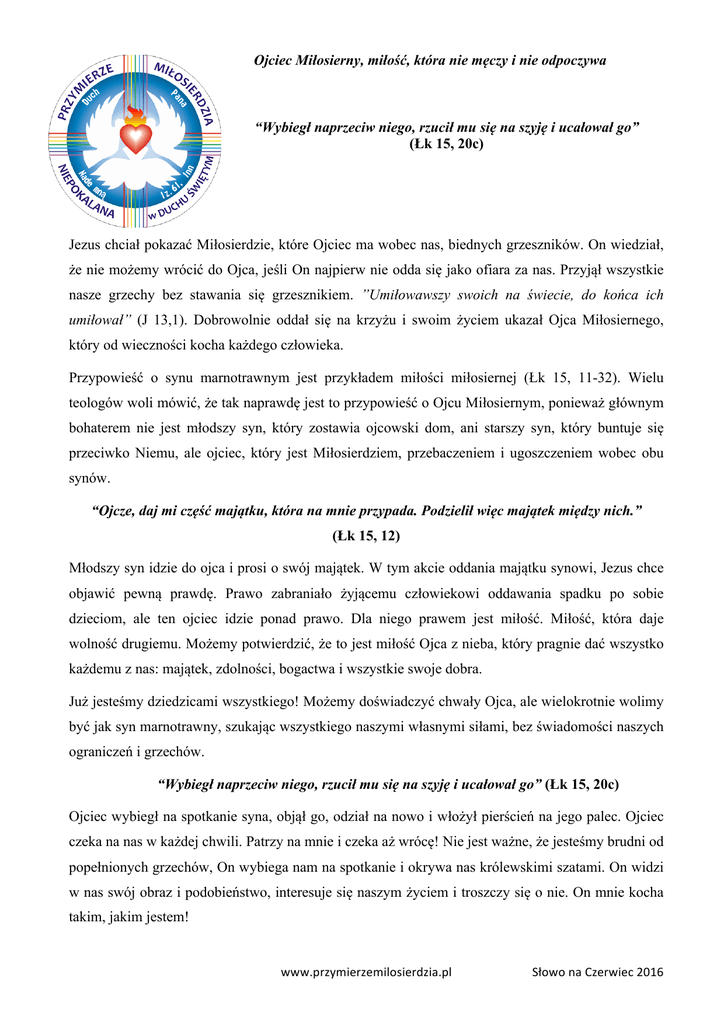 Ojciec Miłosierny, miłość, która nie męczy i nie odpoczywa “Wybiegł naprzeciw niego, rzucił mu się na szyję i ucałował go” (Łk 15, 20c) Jezus chciał pokazać Miłosierdzie, które Ojciec ma wobec nas, biednych grzeszników. On wiedział, że nie możemy wrócić do Ojca, jeśli On najpierw nie odda się jako ofiara za nas. Przyjął wszystkie nasze grzechy bez stawania się grzesznikiem. ”Umiłowawszy swoich na świecie, do końca ich umiłował” (J 13,1). Dobrowolnie oddał się na krzyżu i swoim życiem ukazał Ojca Miłosiernego, który od wieczności kocha każdego człowieka. Przypowieść o synu marnotrawnym jest przykładem miłości miłosiernej (Łk 15, 11-32). Wielu teologów woli mówić, że tak naprawdę jest to przypowieść o Ojcu Miłosiernym, ponieważ głównym bohaterem nie jest młodszy syn, który zostawia ojcowski dom, ani starszy syn, który buntuje się przeciwko Niemu, ale ojciec, który jest Miłosierdziem, przebaczeniem i ugoszczeniem wobec obu synów. “Ojcze, daj mi część majątku, która na mnie przypada. Podzielił więc majątek między nich.” (Łk 15, 12) Młodszy syn idzie do ojca i prosi o swój majątek. W tym akcie oddania majątku synowi, Jezus chce objawić pewną prawdę. Prawo zabraniało żyjącemu człowiekowi oddawania spadku po sobie dzieciom, ale ten ojciec idzie ponad prawo. Dla niego prawem jest miłość. Miłość, która daje wolność drugiemu. Możemy potwierdzić, że to jest miłość Ojca z nieba, który pragnie dać wszystko każdemu z nas: majątek, zdolności, bogactwa i wszystkie swoje dobra. Już jesteśmy dziedzicami wszystkiego! Możemy doświadczyć chwały Ojca, ale wielokrotnie wolimy być jak syn marnotrawny, szukając wszystkiego naszymi własnymi siłami, bez świadomości naszych ograniczeń i grzechów. “Wybiegł naprzeciw niego, rzucił mu się na szyję i ucałował go” (Łk 15, 20c) Ojciec wybiegł na spotkanie syna, objął go, odział na nowo i włożył pierścień na jego palec. Ojciec czeka na nas w każdej chwili. Patrzy na mnie i czeka aż wrócę! Nie jest ważne, że jesteśmy brudni od popełnionych grzechów, On wybiega nam na spotkanie i okrywa nas królewskimi szatami. On widzi w nas swój obraz i podobieństwo, interesuje się naszym życiem i troszczy się o nie. On mnie kocha takim, jakim jestem! www.przymierzemilosierdzia.pl SłowonaCzerwiec2016 A my? Czy jesteśmy gotowi, by kochać naszych braci ponad ich winami i grzechami, które popełnili? Czy jesteśmy gotowi nie tylko je wybaczyć, ale przykryć je dobrami, dać nowe szaty i nawet zdjąć nasz „pierścień dziedzictwa”, aby dać go temu, kto zgrzeszył? W przyjęciu syna, Ojciec „jedynie płakał z radości”. Czy zastanowiłeś się kiedyś, że Ojciec zawsze płacze i raduje się z powrotu dziecka, które było daleko i wróciło do domu? Przypowieść mówi, że Ojciec natychmiast rozkazał, aby zabito utuczone cielę, aby uczcić powrót syna. W czasach Jezusa rodzina, która miała „utuczone cielę” była znakiem bogactwa. Utuczone cielę było zwierzęciem, które spłodziłoby więcej cieląt, czyli, powiększyłoby bogactwo! Co zrobił Ojciec? Ofiarował swoje bogactwo, to, co miał najlepszego, czyli utuczone cielę. W tym geście możemy zobaczyć całkowite oddanie Ojca Niebieskiego, który aby nas przyjąć na nowo w swoim domu, z miłości do nas ofiarowuje swojego Jedynego Syna. “A gdy był jeszcze daleko, ujrzał go jego ojciec i wzruszył się głęboko; wybiegł naprzeciw niego...” (Łk 15, 20) On się wzruszył! Aramejski czasownik w tym wyrażeniu ma korzenie w słowie hesed, które oznacza wnętrzności miłosierdzia. Łono, które rodzi życie! Nowe życie, które ma się narodzić z łona matki, powoduje ból. Cierpienie, które rodzi życie i ból, który nie jest dłużej „bólem”, ale miłością! Kiedy Jezus oddaje się Ojcu z miłości, aby dać nam życie w pełni, przeżywa nasze cierpienia i rany, niesie na sobie nasze choroby. Wielokrotnie myślimy o Ojcu Niebieskim jako o Bogu odległym. W ten sposób nie ufamy Mu i czynimy wszystko, aby się od Niego oddalić. Pomimo tego, On nie rezygnuje z nas, ofiarowuje Swojego Syna i czeka na nas w swoim domu. “Wybiegł naprzeciw niego, rzucił mu się na szyję i ucałował go” (Łk 15, 20c) Ojciec wybiegł synowi na spotkanie i powiedział “przygotujmy ucztę”. Dla nas także może być przygotowana uczta. Wystarczy byśmy zdecydowali się cierpieć za innych, dać życie, być miłością hesed, łonem, które rodzi i cierpi z miłości, aby w ten sposób dawać życie. Możemy rodzić życie tylko wtedy, gdy jesteśmy gotowi cierpieć i umrzeć za innych. Nie traćmy czasu, w Jezusie Ojciec daje nam nowe życie, ofiarowuje nam nową ziemię i nowe niebo. Niech ta przypowieść będzie naszą codzienną medytacją, abyśmy dobrze żyli jako syn, który wraca do Ojca i jako Ojciec, który kocha syna aż do końca. I jeśli w jakimś momencie czujemy się jak starszy syn, dlaczego by nie zdecydować się na definitywną zmianę naszej postawy? o. Antonello Cadeddu i o. João Henrique www.przymierzemilosierdzia.pl SłowonaCzerwiec2016 Misericordiae Vultus nr 9 Jak można zauważyć, miłosierdzie w Piśmie Świętym jest słowem-kluczem do wskazania działania Boga wobec nas. On nie ogranicza się do potwierdzenia swojej miłości, ale czyni ją widoczną i namacalną. Miłość nie może być przecież abstrakcyjnym słowem. Z samej swej natury jest ona konkretnym życiem: to intencje, zachowania, postawy, które przyjmuje się w codzienności. Miłosierdzie Boga jest Jego odpowiedzialnością za nas. On czuje się odpowiedzialnym, to znaczy: pragnie naszego dobra i chce nas widzieć szczęśliwymi, napełnionymi radością i pokojem. Na tejże właśnie długości fali powinna zostać dostrojona i zorientowana miłość miłosierna chrześcijan. Tak, jak kocha Ojciec, tak też powinni kochać i synowie. Jak O