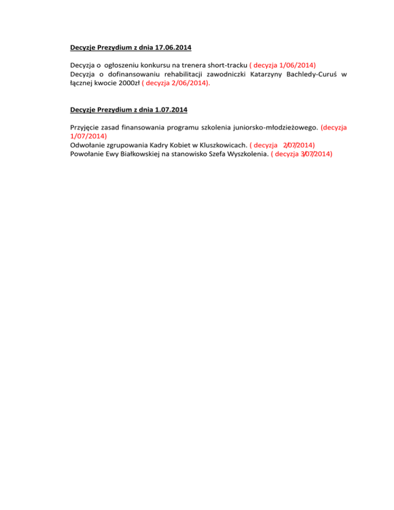 Decyzje Prezydium z dnia 17.06.2014 Decyzja o ogłoszeniu konkursu na trenera short-tracku ( decyzja 1/06/2014) Decyzja o dofinansowaniu rehabilitacji zawodniczki Katarzyny Bachledy-Curuś w łącznej kwocie 2000zł ( decyzja 2/06/2014). Decyzje Prezydium z dnia 1.07.2014 Przyjęcie zasad finansowania programu szkolenia juniorsko-młodzieżowego. (decyzja 1/07/2014) Odwołanie zgrupowania Kadry Kobiet w Kluszkowicach. ( decyzja 2/07/2014) Powołanie Ewy Białkowskiej na stanowisko Szefa Wyszkolenia. ( decyzja 3/07/2014)