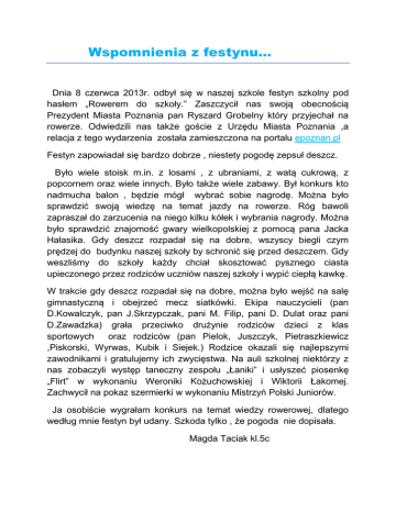 Wspomnienia z festynu… Dnia 8 czerwca 2013r. odbył się w naszej szkole festyn szkolny pod hasłem „Rowerem do szkoły.” Zaszczycił nas swoją obecnością Prezydent Miasta Poznania pan Ryszard Grobelny który przyjechał na rowerze. Odwiedzili nas także goście z Urzędu Miasta Poznania ,a relacja z tego wydarzenia została zamieszczona na portalu epoznan.pl Festyn zapowiadał się bardzo dobrze , niestety pogodę zepsuł deszcz. Było wiele stoisk m.in. z losami , z ubraniami, z watą cukrową, z popcornem oraz wiele innych. Było także wiele zabawy. Był konkurs kto nadmucha balon , będzie mógł wybrać sobie nagrodę. Można było sprawdzić swoją wiedzę na temat jazdy na rowerze. Róg bawoli zapraszał do zarzucenia na niego kilku kółek i wybrania nagrody. Można było sprawdzić znajomość gwary wielkopolskiej z pomocą pana Jacka Hałasika. Gdy deszcz rozpadał się na dobre, wszyscy biegli czym prędzej do budynku naszej szkoły by schronić się przed deszczem. Gdy weszliśmy do szkoły każdy chciał skosztować pysznego ciasta upieczonego przez rodziców uczniów naszej szkoły i wypić ciepłą kawkę. W trakcie gdy deszcz rozpadał się na dobre, można było wejść na salę gimnastyczną i obejrzeć mecz siatkówki. Ekipa nauczycieli (pan D.Kowalczyk, pan J.Skrzypczak, pani M. Filip, pani D. Dulat oraz pani D.Zawadzka) grała przeciwko drużynie rodziców dzieci z klas sportowych oraz rodziców (pan Pielok, Juszczyk, Pietraszkiewicz ,Piskorski, Wyrwas, Kubik i Siejek.) Rodzice okazali się najlepszymi zawodnikami i gratulujemy ich zwycięstwa. Na auli szkolnej niektórzy z nas zobaczyli występ taneczny zespołu „Łaniki” i usłyszeć piosenkę „Flirt” w wykonaniu Weroniki Kożuchowskiej i Wiktorii Łakomej. Zachwycił na pokaz szermierki w wykonaniu Mistrzyń Polski Juniorów. Ja osobiście wygrałam konkurs na temat wiedzy rowerowej, dlatego według mnie festyn był udany. Szkoda tylko , że pogoda nie dopisała. Magda Taciak kl.5c
