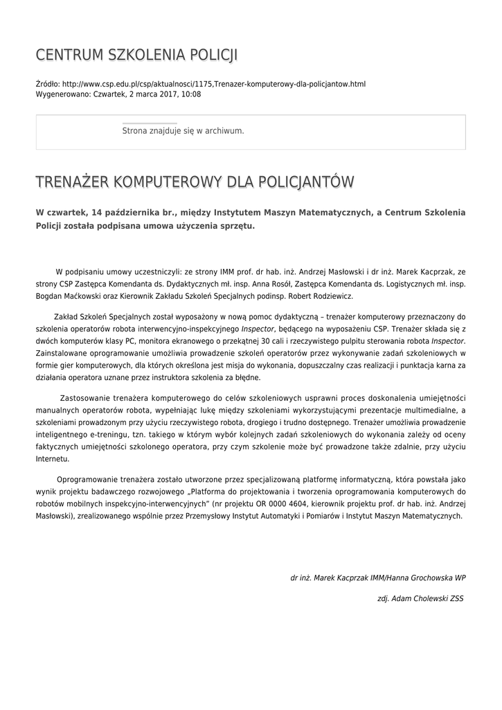 CENTRUM SZKOLENIA POLICJI Źródło: http://www.csp.edu.pl/csp/aktualnosci/1175,Trenazer-komputerowy-dla-policjantow.html Wygenerowano: Czwartek, 2 marca 2017, 10:08 Strona znajduje się w archiwum. TRENAŻER KOMPUTEROWY DLA POLICJANTÓW W czwartek, 14 października br., między Instytutem Maszyn Matematycznych, a Centrum Szkolenia Policji została podpisana umowa użyczenia sprzętu. W podpisaniu umowy uczestniczyli: ze strony IMM prof. dr hab. inż. Andrzej Masłowski i dr inż. Marek Kacprzak, ze strony CSP Zastępca Komendanta ds. Dydaktycznych mł. insp. Anna Rosół, Zastępca Komendanta ds. Logistycznych mł. insp. Bogdan Maćkowski oraz Kierownik Zakładu Szkoleń Specjalnych podinsp. Robert Rodziewicz. Zakład Szkoleń Specjalnych został wyposażony w nową pomoc dydaktyczną – trenażer komputerowy przeznaczony do szkolenia operatorów robota interwencyjno-inspekcyjnego Inspector, będącego na wyposażeniu CSP. Trenażer składa się z dwóch komputerów klasy PC, monitora ekranowego o przekątnej 30 cali i rzeczywistego pulpitu sterowania robota Inspector. Zainstalowane oprogramowanie umożliwia prowadzenie szkoleń operatorów przez wykonywanie zadań szkoleniowych w formie gier komputerowych, dla których określona jest misja do wykonania, dopuszczalny czas realizacji i punktacja karna za działania operatora uznane przez instruktora szkolenia za błędne. Zastosowanie trenażera komputerowego do celów szkoleniowych usprawni proces doskonalenia umiejętności manualnych operatorów robota, wypełniając lukę między szkoleniami wykorzystującymi prezentacje multimedialne, a szkoleniami prowadzonym przy użyciu rzeczywistego robota, drogiego i trudno dostępnego. Trenażer umożliwia prowadzenie inteligentnego e-treningu, tzn. takiego w którym wybór kolejnych zadań szkoleniowych do wykonania zależy od oceny faktycznych umiejętności szkolonego operatora, przy czym szkolenie może być prowadzone także zdalnie, przy użyciu Internetu. Oprogramowanie trenażera zostało utworzone przez specjalizowaną platformę informatyczną, która powstała jako wynik projektu badawczego rozwojowego „Platforma do projektowania i tworzenia oprogramowania komputerowych do robotów mobilnych inspekcyjno-interwencyjnych” (nr projektu OR 0000 4604, kierownik projektu prof. dr hab. inż. Andrzej Masłowski), zrealizowanego wspólnie przez Przemysłowy Instytut Automatyki i Pomiarów i Instytut Maszyn Matematycznych. dr inż. Marek Kacprzak IMM/Hanna Grochowska WP zdj. Adam Cholewski ZSS Ocena: 0/5 (0) Tweetnij