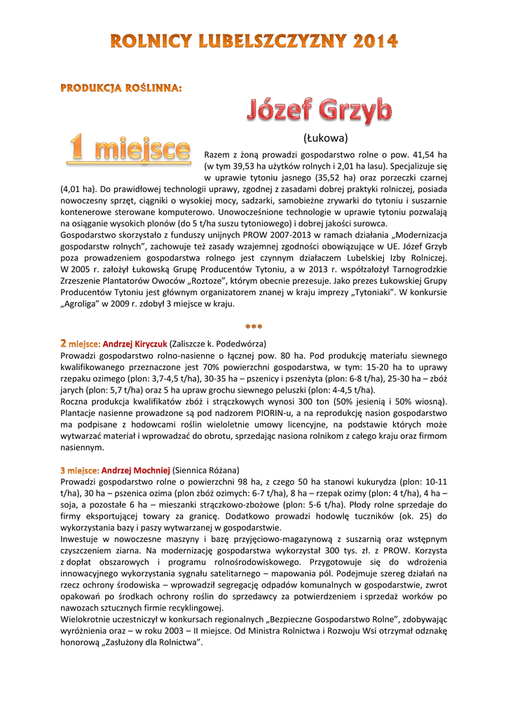 (Łukowa) Razem z żoną prowadzi gospodarstwo rolne o pow. 41,54 ha (w tym 39,53 ha użytków rolnych i 2,01 ha lasu). Specjalizuje się w uprawie tytoniu jasnego (35,52 ha) oraz porzeczki czarnej (4,01 ha). Do prawidłowej technologii uprawy, zgodnej z zasadami dobrej praktyki rolniczej, posiada nowoczesny sprzęt, ciągniki o wysokiej mocy, sadzarki, samobieżne zrywarki do tytoniu i suszarnie kontenerowe sterowane komputerowo. Unowocześnione technologie w uprawie tytoniu pozwalają na osiąganie wysokich plonów (do 5 t/ha suszu tytoniowego) i dobrej jakości surowca. Gospodarstwo skorzystało z funduszy unijnych PROW 2007-2013 w ramach działania „Modernizacja gospodarstw rolnych”, zachowuje też zasady wzajemnej zgodności obowiązujące w UE. Józef Grzyb poza prowadzeniem gospodarstwa rolnego jest czynnym działaczem Lubelskiej Izby Rolniczej. W 2005 r. założył Łukowską Grupę Producentów Tytoniu, a w 2013 r. współzałożył Tarnogrodzkie Zrzeszenie Plantatorów Owoców „Roztoze”, którym obecnie prezesuje. Jako prezes Łukowskiej Grupy Producentów Tytoniu jest głównym organizatorem znanej w kraju imprezy „Tytoniaki”. W konkursie „Agroliga” w 2009 r. zdobył 3 miejsce w kraju. Andrzej Kiryczuk (Zaliszcze k. Podedwórza) Prowadzi gospodarstwo rolno-nasienne o łącznej pow. 80 ha. Pod produkcję materiału siewnego kwalifikowanego przeznaczone jest 70% powierzchni gospodarstwa, w tym: 15-20 ha to uprawy rzepaku ozimego (plon: 3,7-4,5 t/ha), 30-35 ha – pszenicy i pszenżyta (plon: 6-8 t/ha), 25-30 ha – zbóż jarych (plon: 5,7 t/ha) oraz 5 ha upraw grochu siewnego peluszki (plon: 4-4,5 t/ha). Roczna produkcja kwalifikatów zbóż i strączkowych wynosi 300 ton (50% jesienią i 50% wiosną). Plantacje nasienne prowadzone są pod nadzorem PIORIN-u, a na reprodukcję nasion gospodarstwo ma podpisane z hodowcami roślin wieloletnie umowy licencyjne, na podstawie których może wytwarzać materiał i wprowadzać do obrotu, sprzedając nasiona rolnikom z całego kraju oraz firmom nasiennym. Andrzej Mochniej (Siennica Różana) Prowadzi gospodarstwo rolne o powierzchni 98 ha, z czego 50 ha stanowi kukurydza (plon: 10-11 t/ha), 30 ha – pszenica ozima (plon zbóż ozimych: 6-7 t/ha), 8 ha – rzepak ozimy (plon: 4 t/ha), 4 ha – soja, a pozostałe 6 ha – mieszanki strączkowo-zbożowe (plon: 5-6 t/ha). Płody rolne sprzedaje do firmy eksportującej towary za granicę. Dodatkowo prowadzi hodowlę tuczników (ok. 25) do wykorzystania bazy i paszy wytwarzanej w gospodarstwie. Inwestuje w nowoczesne maszyny i bazę przyjęciowo-magazynową z suszarnią oraz wstępnym czyszczeniem ziarna. Na modernizację gospodarstwa wykorzystał 300 tys. zł. z PROW. Korzysta z dopłat obszarowych i programu rolnośrodowiskowego. Przygotowuje się do wdrożenia innowacyjnego wykorzystania sygnału satelitarnego – mapowania pól. Podejmuje szereg działań na rzecz ochrony środowiska – wprowadził segregację odpadów komunalnych w gospodarstwie, zwrot opakowań po środkach ochrony roślin do sprzedawcy za potwierdzeniem i sprzedaż worków po nawozach sztucznych firmie recyklingowej. Wielokrotnie uczestniczył w konkursach regionalnych „Bezpieczne Gospodarstwo Rolne”, zdobywając wyróżnienia oraz – w roku 2003 – II miejsce. Od Ministra Rolnictwa i Rozwoju Wsi otrzymał odznakę honorową „Zasłużony dla Rolnictwa”. (Dębica k. Ostrówka) Prowadzi gospodarstwo o pow. 34 ha, z czego 31 ha to grunty orne, a 1 ha – trwałe użytki zielone. Zajmuje się produkcją tuczników. Stan zwierząt to obecnie: 30 loch i 1 knur. Roczna sprzedaż tuczników wynosi 521 sztuk. Gospodarstwo objęte jest kontrolą użytkowości loch rasy puławskiej przez POLSUS. W gospodarstwie realizowany jest plan działalności rolnośrodowiskowej, pakiety „Rolnictwo zrównoważone”, „Ochrona zagrożonych gatunków ptaków”, „Zachowanie zagrożonych zasobów genetycznych zwierząt w rolnictwie – rasa puławska”, „Ochrona gleb i wód”. W 2013 roku rolnik zajął VI miejsce w ogólnopolskim konkursie „Producent i hodowca trzody chlewnej”. Stanisław Wiąckiewicz (Anonin k. Stanina) Prowadzi gospodarstwo rolne o pow. 27 ha, które przynależy do grupy producentów trzody chlewnej. Uprawiane tu zboża służą do przygotowania pasz dla zwierząt. Stan trzody to: 45 loch w cyklu zamkniętym. Łączna liczba sprzedaży tuczników w ciągu roku wynosi ok. 900 sztuk. Hodowca uzyskuje bardzo dobre wyniki mięsności tuczników. Gospodarstwo jest wyposażone w nowy park maszynowy oraz urządzenia służące do produkcji pasz, przechowywania zboża i utrzymania zwierząt w dobrych warunkach. Gospodarstwo dobrze wykorzystuje środki zewnętrzne z UE. Grzegorz Domański (Krzymowskie k. Białej Podlaskiej) Prowadzi gospodarstwo o powierzchni 50 ha, na której uprawiane są: pszenżyto (plon: 5 t/ha), jęczmień (5 t/ha) i kukurydza (9 t/ha). Wielkość produkcji wynosi 7 tys. tuczników rocznie, w jednym rzucie ok. 2400 szt. Prosięta o wadze 20-25 kg pochodzą z zakupu. Rolnik dobrze wykorzystuje środki unijne. Na zakup maszyn otrzymał 550 tys. zł z programów: SAPARD, RPO i PROW. (Lisikierz k. Woli Mysłowskiej) Prowadzi gospodarstwo rolne o pow. 70 ha. Główny dochód pochodzi ze sprzedaży mleka do SM Ryki. Od 2005 r. hodowca sam rozlicza się z podatku VAT. Stado liczy 72 krów (o wydajności 9453 kg mleka) oraz 70 jałówek. Rekordzistką jest 13-letnia krowa, która w 2013 r. przekroczyła życiową wydajność 100 tys. kg mleka (jako jedna z 6 w województwie lubelskim). Krowy znajdują się pod oceną wartości użytkowej Polskiej Federacji Hodowców Bydła i Producentów Mleka (PFHBiPM). Od kilku lat hodowca bierze udział w wystawie zwierząt hodowlanych w Sitnie. W 2013 r. jedna z jego krów zdobyła tytuł czempiona w kategorii „jałowice 14-17 m-cy odmiany RW”. Od 2004 r. rolnik korzysta z programów unijnych oraz jest objęty pakietem rolnośrodowiskow