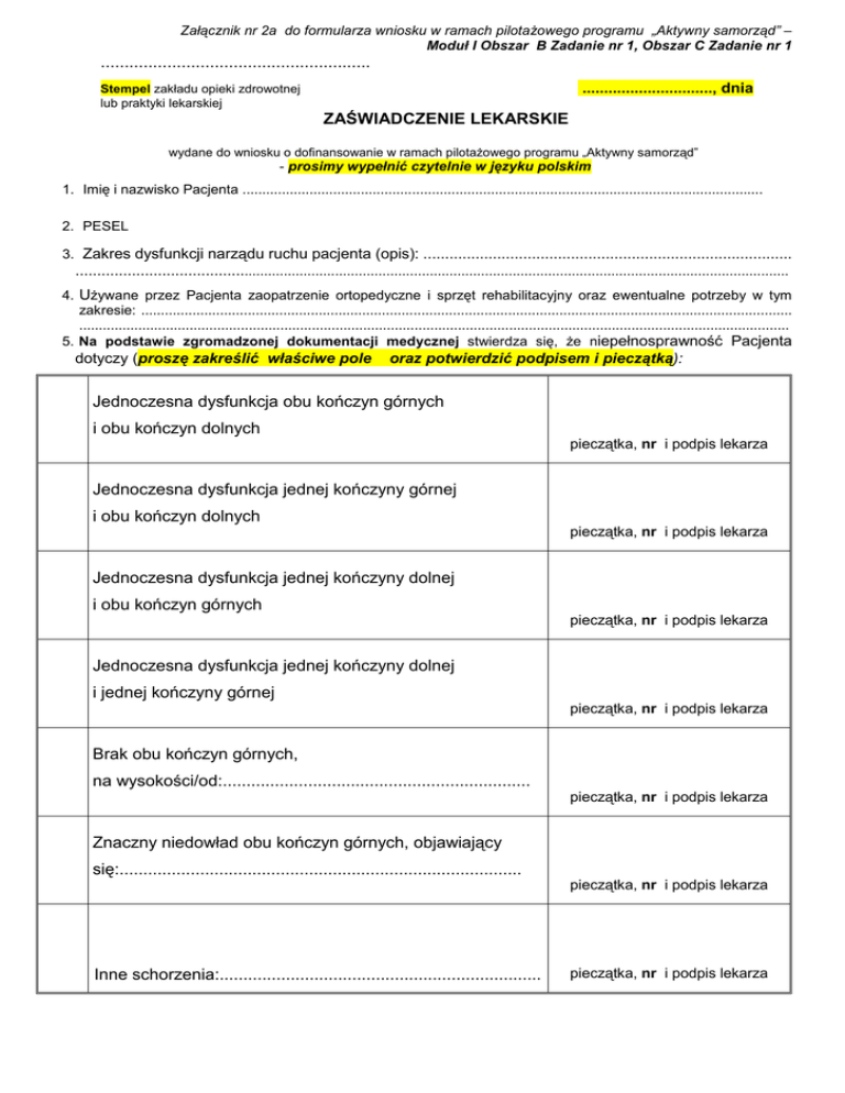 Załącznik nr 2a do formularza wniosku w ramach pilotażowego programu „Aktywny samorząd” – Moduł I Obszar B Zadanie nr 1, Obszar C Zadanie nr 1 ......................................................... .............................., dnia Stempel zakładu opieki zdrowotnej lub praktyki lekarskiej ZAŚWIADCZENIE LEKARSKIE wydane do wniosku o dofinansowanie w ramach pilotażowego programu „Aktywny samorząd” - prosimy wypełnić czytelnie w języku polskim 1. Imię i nazwisko Pacjenta .................................................................................................................................... 2. PESEL 3. Zakres dysfunkcji narządu ruchu pacjenta (opis): ..................................................................................... ................................................................................................................................................................................. 4. Używane przez Pacjenta zaopatrzenie ortopedyczne i sprzęt rehabilitacyjny oraz ewentualne potrzeby w tym zakresie: ..................................................................................................................................................................... .................................................................................................................................................................................... 5. Na podstawie zgromadzonej dokumentacji medycznej stwierdza się, że niepełnosprawność Pacjenta dotyczy (proszę zakreślić właściwe pole oraz potwierdzić podpisem i pieczątką): Jednoczesna dysfunkcja obu kończyn górnych i obu kończyn dolnych pieczątka, nr i podpis lekarza Jednoczesna dysfunkcja jednej kończyny górnej i obu kończyn dolnych pieczątka, nr i podpis lekarza Jednoczesna dysfunkcja jednej kończyny dolnej i obu kończyn górnych pieczątka, nr i podpis lekarza Jednoczesna dysfunkcja jednej kończyny dolnej i jednej kończyny górnej pieczątka, nr i podpis lekarza Brak obu kończyn górnych, na wysokości/od:................................................................. pieczątka, nr i podpis lekarza Znaczny niedowład obu kończyn górnych, objawiający się:..................................................................................... pieczątka, nr i podpis lekarza Inne schorzenia:.................................................................... pieczątka, nr i podpis lekarza Str. 2 załącznika nr 2a do formularza wniosku – dotyczy formularzy wniosków – Moduł I Obszar C Zadanie nr 1 6. Ponadto (pole obowiązkowe w przypadku Pacjenta ubiegającego się o dofinansowanie w ramach obszaru C programu) - na podstawie zgromadzonej dokumentacji medycznej stwierdza się, że: proszę zakreślić właściwe pola 1. Pacjent może poruszać się na wózku inwalidzkim o napędzie ręcznym: tak nie 2. Korzystanie z wózka o napędzie elektrycznym jest niewskazane, gdyż może spowodować wstrzymanie lub pogorszenie procesu rehabilitacji lub wpłynie niekorzystnie na sprawność kończyn górnych: tak nie 3. Przeciwwskazania do korzystania z wózka o napędzie elektrycznym (np. utraty przytomności, epilepsja): .................................................................. ............................................................................................................................ brak przeciwwskazań ............................................ ............................... pieczątka, nr i podpis lekarza Dotyczy wyłącznie Wnioskodawców ubiegających się o zwiększenie kwoty dofinansowania na zakup wózka inwalidzkiego o napędzie elektrycznym Pacjent z uwagi na ograniczenia funkcjonalne, stan i zakres dysfunkcji narządu ruchu powodującej niepełnosprawność wymaga zakupu wózka inwalidzkiego o napędzie elektrycznym z ponadstandardowym wyposażeniem, w tym: (proszę zakreślić właściwe pola ) niestandardowe sterowniki umożliwiające sterowanie wózkiem za pomocą jedynie władnych części ciała jak np.: ręki, palca, brody, stopy, warg lub wdechu i wydechu powietrza itp. urządzenia umożliwiające prowadzenie wózka także przez osobę towarzyszącą (hamulec, sterownik itp.) niestandardowe siedzisko (np. z windą podnoszącą, rehabilitacyjne, zapewniające maksymalną stabilizację, przeciwodleżynowe, itp.) specjalne, regulowane (w tym elektrycznie i w różnych płaszczyznach): podnóżki, podłokietniki lub oparcia nadgarstków kliny zapobiegające zsuwaniu się Pacjenta z wózka lub podpórki boczne, peloty piersiowe zagłówek stabilizujący głowę i szyję (w kształcie litery U) specjalne pasy bezpieczeństwa (np. dwupunktowe zapinane na biodrach, czteropunktowe) taki sposób, aby wózek był indywidualnie dopasowany do sylwetki Pacjenta (np. w przypadku niestandardowego wzrostu czy wagi Pacjenta) inne elementy i urządzenia (np. umożliwiające podłączenia joysticka wózka do komputera i posługiwanie się nim jak myszką), jakie: ........................................, dnia .............. (miejscowość ) (data) ............................................... pieczątka, nr i podpis lekarza Str. 3 załącznika nr 2a do formularza wniosku – dotyczy formularzy wniosków – Moduł I Obszar C Zadanie nr 3 i 4 ......................................................... .............................., dnia Stempel zakładu opieki zdrowotnej lub praktyki lekarskiej ZAŚWIADCZENIE LEKARSKIE wydane do wniosku o dofinansowanie w ramach pilotażowego programu „Aktywny samorząd” - prosimy wypełnić czytelnie w języku polskim 1. Imię i nazwisko Pacjenta ................................................................................................................................. 2. PESEL 3. Stwierdza się, że niepełnosprawność Pacjenta dotyczy (proszę zakreślić właściwe pole oraz potwierdzić podpisem i pieczątką): Amputacja w zakresie ręki pieczątka, nr i podpis lekarza Amputacja w z