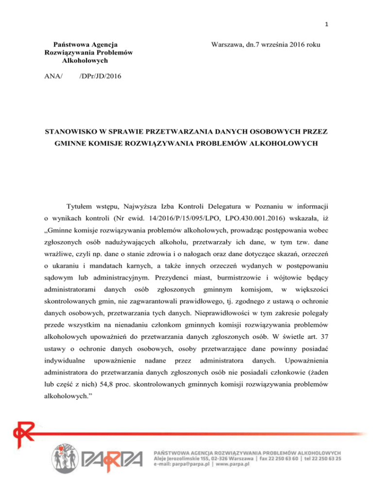1 Państwowa Agencja Rozwiązywania Problemów Alkoholowych ANA/ Warszawa, dn.7 września 2016 roku /DPr/JD/2016 STANOWISKO W SPRAWIE PRZETWARZANIA DANYCH OSOBOWYCH PRZEZ GMINNE KOMISJE ROZWIĄZYWANIA PROBLEMÓW ALKOHOLOWYCH Tytułem wstępu, Najwyższa Izba Kontroli Delegatura w Poznaniu w informacji o wynikach kontroli (Nr ewid. 14/2016/P/15/095/LPO, LPO.430.001.2016) wskazała, iż „Gminne komisje rozwiązywania problemów alkoholowych, prowadząc postępowania wobec zgłoszonych osób nadużywających alkoholu, przetwarzały ich dane, w tym tzw. dane wrażliwe, czyli np. dane o stanie zdrowia i o nałogach oraz dane dotyczące skazań, orzeczeń o ukaraniu i mandatach karnych, a także innych orzeczeń wydanych w postępowaniu sądowym lub administracyjnym. Prezydenci miast, burmistrzowie i wójtowie będący administratorami danych osób zgłoszonych gminnym komisjom, w większości skontrolowanych gmin, nie zagwarantowali prawidłowego, tj. zgodnego z ustawą o ochronie danych osobowych, przetwarzania tych danych. Nieprawidłowości w tym zakresie polegały przede wszystkim na nienadaniu członkom gminnych komisji rozwiązywania problemów alkoholowych upoważnień do przetwarzania danych zgłoszonych osób. W świetle art. 37 ustawy o ochronie danych osobowych, osoby przetwarzające dane powinny posiadać indywidualne upoważnienie nadane przez administratora danych. Upoważnienia administratora do przetwarzania danych zgłoszonych osób nie posiadali członkowie (żaden lub część z nich) 54,8 proc. skontrolowanych gminnych komisji rozwiązywania problemów alkoholowych.” 2 Warto w tym miejscu wskazać również na stwierdzenie Najwyższej Izby Kontroli Delegatury w Poznaniu w informacji o wynikach kontroli (P/15/095, P-15-095-LPO-12-01) „Wójt Gminy, będący administratorem danych osób zgłoszonych gminnej komisji rozwiązywania problemów alkoholowych, nie zagwarantował prawidłowego ich przetwarzania w świetle przepisów ustawy o ochronie danych osobowych. Dowodzą tego następujące okoliczności: Wójt nie nadał żadnemu z członków gminnej komisji, upoważnienia do przetwarzania tzw. danych wrażliwych, o których mowa w art. 27 ust. 1 ustawy o ochronie danych osobowych. Tym samym, nie zabezpieczył tych danych przed przetwarzaniem z naruszeniem ustawy o ochronie danych osobowych, do czego zobowiązywał go art. 36 ust. 1 tej ustawy. Do przetwarzania danych, w myśl art. 37 ustawy o ochronie danych osobowych, mogą być bowiem dopuszczone wyłącznie osoby posiadające upoważnienie nadane przez administratora danych. Dopiero 15 października 2015 r., Wójt Gminy nadał członkom gminnej komisji stosowne upoważnienia do przetwarzania danych zgłoszonych osób.” Należy tym samym podkreślić, iż w obu wyżej cytowanych dokumentach NIK podnosił , iż naruszenia w przedmiocie przetwarzania danych osobowych osób zgłoszonych do gminnych komisji wynikały z niestosowania przepisów ustawy z dnia 29 sierpnia 1997 roku o ochronie danych osobowych (Dz. U. z 2016 r. poz. 922, ze zm.) w zakresie przetwarzania tych danych (także danych wrażliwych), a tym samym niezapewnienia należytej ochrony prawnej nad danymi przetwarzanymi przez gminne komisje w przedmiocie procedury zobowiązania do leczenia odwykowego osób uzależnionych od alkoholu, nie zaś braku podstawy przetwarzania tych danych przez gminne komisje rozwiązywania problemów alkoholowych. Z uwagi na powyższe, należy podkreślić, iż zbiory danych osobowych znajdujące się w zasobach gminnych komisji rozwiązywania problemów alkoholowych podlegają przepisom ustawy o ochronie danych osobowych. Zgodnie z treścią przepisu art. 27 ust. 1 ww. ustawy „zabrania się przetwarzania danych m.in. o stanie zdrowia i nałogach”. W myśl ust. 2 pkt.2 cytowanego przepisu przetwarzanie danych,o których mowa w ust. 1, jest jednak dopuszczalne, jeżeli przepis szczególny innej ustawy zezwala na przetwarzanie takich danych bez zgody osoby, której dane dotyczą, i stwarza pełne gwarancje ich ochrony. Dlatego też dane te powinny być dostępne wyłącznie dla osób posiadających uprawnienie do przetwarzania ww. danych osobowych. 3 W obecnym brzmieniu ustawy z dnia 26 października 1982 r. o wychowaniu w trzeźwości i przeciwdziałaniu alkoholizmowi (Dz. U. z 2016 r. poz. 487, ze zm.). dyspozycja art. 41 ust. 3 wskazuje, iż gminne komisje rozwiązywania problemów alkoholowych w ramach swoich kompetencji nadanych niniejszą ustawą podejmują także czynności zmierzające do orzeczenia przez właściwy miejscowo sąd o zastosowaniu wobec osoby uzależnionej od alkoholu obowiązku poddania się leczeniu w zakładzie lecznictwa odwykowego. Przepis art. 26 ust. 3 ww. ustawy wskazuje, iż „Sąd wszczyna postępowanie na wniosek gminnej komisji rozwiązywania problemów alkoholowych lub prokuratora. Do wniosku dołącza się zebraną dokumentację wraz z opinią biegłego, jeżeli badanie przez biegłego zostało przeprowadzone.” Tym samym, osobami upoważnionymi do przetwarzania ww. danych osobowych są tylko członkowie gminnych komisji rozwiązywania problemów alkoholowych na potrzeby postępowania dotyczącego zobowiązania do poddania się leczeniu odwykowemu. Działania gminnych komisji rozwiązywania problemów alkoholowych podlegają przepisom obowiązek zgłoszenia ustawy bazy o danych ochronie gminnej danych komisji osobowych, rozwiązywania stąd też problemów alkoholowych do Generalnego Inspektora Ochrony Danych Osobowych. W myśl przepisu art. 40 ustawy o ochronie danych osobowych „administrator danych jest obowiązany zgłosić zbiór danych do rejestracji Generalnemu Inspektorowi, z wyjątkiem przypadków, o których mowa w art. 43 ust. 1. Wskazany przepis art. 43 ust. 1 zawiera zamknięty katalog danych nie podlegających rejestracji. Wobec faktu zaś, iż baza danych gminnej komisji nie zawiera danych wskazanych w powyższym przepisie, należy stwierdzić, że podlegają one obowią