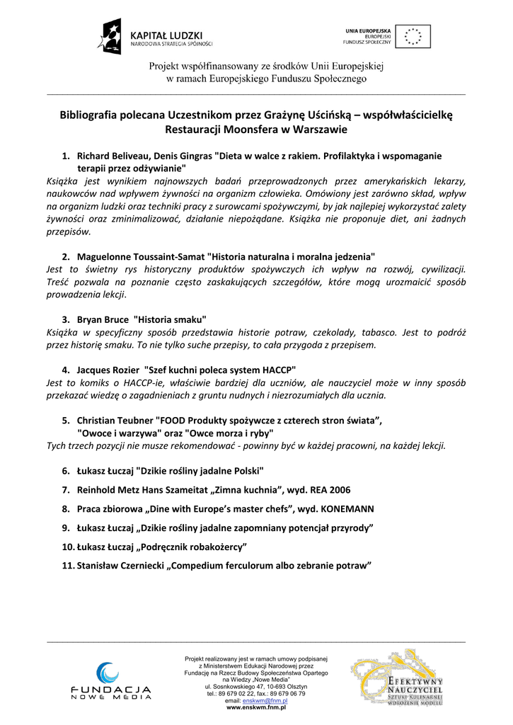 _________________________________________________________________________________ Bibliografia polecana Uczestnikom przez Grażynę Uścioską – współwłaścicielkę Restauracji Moonsfera w Warszawie 1. Richard Beliveau, Denis Gingras "Dieta w walce z rakiem. Profilaktyka i wspomaganie terapii przez odżywianie" Książka jest wynikiem najnowszych badao przeprowadzonych przez amerykaoskich lekarzy, naukowców nad wpływem żywności na organizm człowieka. Omówiony jest zarówno skład, wpływ na organizm ludzki oraz techniki pracy z surowcami spożywczymi, by jak najlepiej wykorzystad zalety żywności oraz zminimalizowad, działanie niepożądane. Książka nie proponuje diet, ani żadnych przepisów. 2. Maguelonne Toussaint-Samat "Historia naturalna i moralna jedzenia" Jest to świetny rys historyczny produktów spożywczych ich wpływ na rozwój, cywilizacji. Treśd pozwala na poznanie często zaskakujących szczegółów, które mogą urozmaicid sposób prowadzenia lekcji. 3. Bryan Bruce "Historia smaku" Książka w specyficzny sposób przedstawia historie potraw, czekolady, tabasco. Jest to podróż przez historię smaku. To nie tylko suche przepisy, to cała przygoda z przepisem. 4. Jacques Rozier "Szef kuchni poleca system HACCP" Jest to komiks o HACCP-ie, właściwie bardziej dla uczniów, ale nauczyciel może w inny sposób przekazad wiedzę o zagadnieniach z gruntu nudnych i niezrozumiałych dla ucznia. 5. Christian Teubner "FOOD Produkty spożywcze z czterech stron świata”, "Owoce i warzywa" oraz "Owce morza i ryby" Tych trzech pozycji nie musze rekomendowad - powinny byd w każdej pracowni, na każdej lekcji. 6. Łukasz Łuczaj "Dzikie rośliny jadalne Polski" 7. Reinhold Metz Hans Szameitat „Zimna kuchnia”, wyd. REA 2006 8. Praca zbiorowa „Dine with Europe’s master chefs”, wyd. KONEMANN 9. Łukasz Łuczaj „Dzikie rośliny jadalne zapomniany potencjał przyrody” 10. Łukasz Łuczaj „Podręcznik robakożercy” 11. Stanisław Czerniecki „Compedium ferculorum albo zebranie potraw” _________________________________________________________________________________ Projekt realizowany jest w ramach umowy podpisanej z Ministerstwem Edukacji Narodowej przez Fundację na Rzecz Budowy Społeczeństwa Opartego na Wiedzy „Nowe Media” ul. Sosnkowskiego 47, 10-693 Olsztyn tel.: 89 679 02 22, fax.: 89 679 06 79 email: [email protected] www.enskwm.fnm.pl