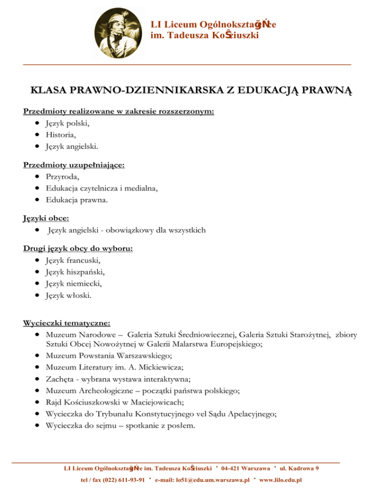 LI Liceum Ogólnokształcące im. Tadeusza Kościuszki KLASA PRAWNO-DZIENNIKARSKA Z EDUKACJĄ PRAWNĄ Przedmioty realizowane w zakresie rozszerzonym: · Język polski, · Historia, · Język angielski. Przedmioty uzupełniające: · Przyroda, · Edukacja czytelnicza i medialna, · Edukacja prawna. Języki obce: · Język angielski - obowiązkowy dla wszystkich Drugi język obcy do wyboru: · Język francuski, · Język hiszpański, · Język niemiecki, · Język włoski. Wycieczki tematyczne: · Muzeum Narodowe – Galeria Sztuki Średniowiecznej, Galeria Sztuki Starożytnej, zbiory Sztuki Obcej Nowożytnej w Galerii Malarstwa Europejskiego; · Muzeum Powstania Warszawskiego; · Muzeum Literatury im. A. Mickiewicza; · Zachęta - wybrana wystawa interaktywna; · Muzeum Archeologiczne – początki państwa polskiego; · Rajd Kościuszkowski w Maciejowicach; · Wycieczka do Trybunału Konstytucyjnego vel Sądu Apelacyjnego; · Wycieczka do sejmu – spotkanie z posłem. · 04-421 Warszawa · ul. Kadrowa 9 tel / fax (022) 611-93-91 · e-mail: [email protected] · www.lilo.edu.pl LI Liceum Ogólnokształcące im. Tadeusza Kościuszki LI Liceum Ogólnokształcące im. Tadeusza Kościuszki Współpraca z wyższymi uczelniami: · Uniwersytet Kardynała Stefana Wyszyńskiego – udział w otwartych wykładach, w projektach edukacyjnych i olimpiadach i konkursach organizowanych przez wyższe uczelnie; spotkania z absolwentami; · Uniwersytet Warszawski; · Akademia Pedagogiki Specjalnej; · Wyższa Szkoła Turystyki i Języków Obcych – możliwość zdobycia certyfikatu B2. Lekcje, warsztaty, projekty: · Współpraca z Domem Kultury Rembertów; · Projekt Edukacji Filmowej; · Uczestnictwo w projektach edukacyjnych: „Po gimnazjum”, „Połowa drogi”, „Matura próbna”; · Izba Pamięci w Rembertowie - współpraca ze środowiskiem kombatantów; · Warsztaty samorządowe w ramach projektu edukacji samorządowej „Nastolatek w samorządzie” realizowanego przez Centrum Komunikacji Społecznej Urzędu m. st. Warszawy; · Spotkanie z prawnikiem (sędzia lub prokurator); · Drama rozprawy sądowej; · Teatr Wielki, Filharmonia Narodowa i Teatr Polski - spotkania tematyczne, przedstawienia; · Warsztaty językowe i kulturowe organizowane przez Europejski Program Edukacyjny "Nauka bez granic"; · Międzynarodowy obóz językowy "EuroWeek" w ramach projektu europejskiego "Szkoła Liderów"; · Wyjścia na spektakle anglojęzyczne; · Udział w projekcie międzynarodowym "Makutano Junction”. Wybór studiów wyższych: · Uniwersytet Warszawski, kierunki: prawo, historia, dziennikarstwo i komunikacja społeczna, stosunki międzynarodowe, politologia, europeistyka, socjologia, pedagogika, bezpieczeństwo wewnętrzne, filozofia, filologia polska, kulturoznawstwo, historia sztuki, muzykologia; · Uniwersytet Kardynała Stefana Wyszyńskiego, kierunki: prawo, dziennikarstwo i komunikacja społeczna, administracja, stosunki międzynarodowe, historia, filologia polska, kulturoznawstwo, historia sztuki, socjologia, religioznawstwo, teologia; · 04-421 Warszawa · ul. Kadrowa 9 tel / fax (022) 611-93-91 · e-mail: [email protected] · www.lilo.edu.pl LI Liceum Ogólnokształcące im. Tadeusza Kościuszki LI Liceum Ogólnokształcące im. Tadeusza Kościuszki · Szkoła Główna Gospodarstwa Wiejskiego, kierunki: socjologia, ekonomia, · · · · · · · pedagogika; Akademia Leona Koźmińskiego, kierunki: prawo, administracja, socjologia, europeistyka, ekonomia; Akademia Pedagogiki Specjalnej im. M. Grzegorzewskiej, kierunki: edukacja artystyczna w zakresie sztuk plastycznych, pedagogika, pedagogika specjalna, praca socjalna, psychologia, socjologia; Wyższa Szkoła Dziennikarstwa im. Melchiora Wańkowicza, kierunki: dziennikarstwo i komunikacja społeczna; Wyższa Szkoła Psychologii Społecznej, kierunki: prawo, dziennikarstwo i komunikacja społeczna, stosunki międzynarodowe, filologia polska, kulturoznawstwo, bezpieczeństwo wewnętrzne, politologia, socjologia, cross-cultural management, international business relations; Europejska Wyższa Szkoła Prawa i Administracji, kierunki: prawo, administracja, stosunki międzynarodowe; Wyższa Szkoła Artystyczna, kierunki: malarstwo; Akademia Obrony Narodowej, kierunki: administracja, historia, stosunki międzynarodowe, zarządzanie. Twój przyszły zawód: · prawnik, dziennikarz, nauczyciel, ekonomista, socjolog, politolog, psycholog, filozof, teolog, religioznawca, fotograf, historyk sztuki, konserwator zabytków, dekorator wnętrz, projektant ubioru, charakteryzator, specjalista rzemiosła artystycznego, strateg reklamy, reżyser, scenarzysta, montażysta, kierownik produkcji, realizator dźwięku, doradca podatkowy. · 04-421 Warszawa · ul. Kadrowa 9 tel / fax (022) 611-93-91 · e-mail: [email protected] · www.lilo.edu.pl LI Liceum Ogólnokształcące im. Tadeusza Kościuszki