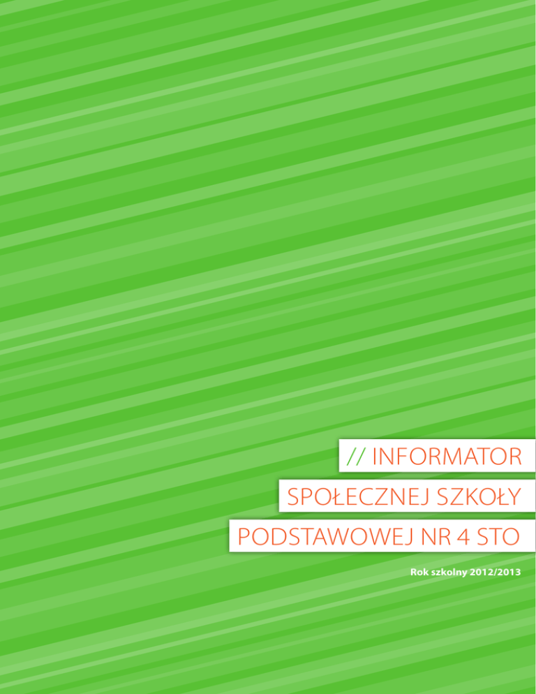 // INFORMATOR SPOŁECZNEJ SZKOŁY PODSTAWOWEJ NR 4 STO Rok szkolny 2012/2013 1 2 Ideały szkoły i jej historia // SŁOWO WSTĘPNE PANI PREZES STO DR ANNY OKOŃSKIEJ-WALKOWICZ „Jaka to szkoła?” Szkoła powstała w 1990 roku z marzeń rodziców o dobrej edukacji dla swych dzieci oraz ich gotowości do działań na rzecz dobra wspólnego. Jej starannie przemyślany program obejmuje edukację dzieci i młodzieży od sześciu do dziewiętnastu lat. Osoby, które mają możliwość trzynastoletniej nauki w szkole, mają zapewnioną biegłą znajomość dwóch języków obcych, są rzetelnie przygotowane do studiów w kraju i za granicą oraz do pełnienia ważnych ról społecznych. Dzięki organizowanym obozom i dobrej pracy wychowawczej mają przyjaciół, z którymi łatwiej iść przez życie, zaś dzięki wymianom i projektom międzynarodowym, zyskują dobrych znajomych w wielu krajach Europy. Program szkoły dość tradycyjnie łączy kształcenie ducha z kształceniem ciała. Z taką samą starannością uczniowie przygotowani są do egzaminów zewnętrznych, jak i do zawodów sportowych czy wernisaży prac plastycznych. Bogactwo programu szkoły sprawia, że mogą się w niej rozwijać różnorodne zainteresowania. Każdy uczeń ma dziesiątki okazji, aby doświadczać wzrostu swoich kompetencji, a tym samym budować pozytywny obraz samego siebie. Ocena zachowania, która w znacznym stopniu wystawiana jest na podstawie samooceny, zachęca do autorefleksji i pracy nad samym sobą. Idei tej służą także kontrakty, które nauczyciele wychowawcy zawierają z uczniami prowadzonych przez siebie klas. W kontraktach tych uczniowie deklarują gotowość do pokonywania różnych trudności w realizowaniu swoich celów osobistych, związanych z nauką szkolną i osobistą karierą, a nauczyciele zobowiązują się do wspierania zadeklarowanych wysiłków. Dochowując wierności swym obywatelskim korzeniom, szkoła stwarza wiele okazji do kształcenia postaw obywatelskich u swoich uczniów. Odpowiedzialna praca w poważnie przez dorosłych traktowa- nym samorządzie uczniowskim, badanie potrzeb społecznych w różnych częściach kraju w czasie obozów naukowo - badawczych oraz spotkania z potrzebującymi w czasie akcji charytatywnych to tylko niektóre działania szkoły na rzecz budowania przyszłego społeczeństwa obywateli. Aranżowanie różnorodnych okazji do opiekowania się przez starszych młodszymi służy tworzeniu wspólnoty uczniowskiej, co znakomicie przeciwdziała agresji względem młodszych i słabszych. Nowatorska metoda asystencka, stosowana przez nauczycieli gimnazjum, pozwala zdolnym uczniom dzielić się swoją wiedzą z młodszymi kolegami, a wspólne wyjazdy wymuszają współpracę i opiekę. Młodsi uczniowie naszej szkoły mogą brać przykład ze starszych, a starsi - z absolwentów współpracujących ze szkołą i nauczycieli, którzy dobierani są bardzo starannie. Najwyższe od lat miejsca we wszelkich rankingach szkół, pomimo małej selekcji uczniów, dowodzą dużej efektywności dydaktycznej, czyli kompetentnych nauczycieli, którzy potrafią motywować swoich uczniów do pracy. Atrakcyjność i skuteczność szkoły, jej wierność korzeniom możliwa jest tylko przy współpracy z rodzicami. Wielu z nich z dużym oddaniem wspiera nauczycieli w pracy dydaktyczno- wychowawczej, uczestniczy w piknikach, zawodach, konkursach, sponsoruje wyposażenie i różnorodne oryginalne działania szkoły. Kilkunastu najbardziej oddanych sprawie szkoły, dzięki mandatowi zaufania okazanemu przez Walne Zebranie Członków Koła, kieruje organem prowadzącym naszą szkołę, troszcząc się o jej codzienność i przyszłość. Rodzice dbają o jej dobrą opinię w naszym mieście, co sprawia, że na każde zwalniające się miejsce jest kilku oczekujących. To jest dobra szkoła i może być jeszcze lepsza dzięki naszym wspólnym staraniom. Gorąco o nie proszę. dr Anna Okońska-Walkowicz Prezes ZG STO 3 Ideały szkoły i jej historia // SPOŁECZNE TOWARZYSTWO OŚWIATOWE „PAMIĘTAJMY O NASZYCH KORZENIACH”. „Wszyscy narzekają na szkołę: nauczyciele, uczniowie, rodzice. Brakuje budynków szkolnych i nowoczesnych pomocy naukowych, brakuje nauczycieli i podręczników… Dramatyczna sytuacja, w jakiej znalazła się polska szkoła, omawiana jest w publikacjach fachowych, środkach masowego przekazu, dyskutowana w Sejmie. I wszyscy właściwie rozkładają ręce. Władze oświatowe, które są za szkołę odpowiedzialne, potwierdzają opinię, że szkoła jest w fatalnym stanie i nie ma na to żadnej rady.” GWIAZDA MORZA (MAJ 1988) „…ogólna oświata działa na 2,5 lub nawet 3 zmiany, gdzie nie ma świetlicy i sali gimnastycznej ani żadnej możliwości zjedzenie obiadu. Gdzie przeładowane do granic możliwości klasy źle wpływają na kondycję nauczyciela i ucznia, tam gdzie w budynkach przeznaczonych dla kilkuset – przebywa prawie dwa tysiące dzieci…” DZIENNIK BAŁTYCKI ( KWIECIEŃ 1988 ) „…Ale przecież bywa i tak, jak w jednej z warszawskich podstawówek, gdzie powieszono ogłoszenie: RODZICOM WSTĘP NA SZKOLNE KORYTARZE WZBRONIONY Szkoła państwowa, choć też przecież nasza, jest zazdrosna o swoje wpływy.” SŁOWO POLSKIE ( KWIECIEŃ 1988 ) Te kilka fragmentów z prasy polskiej końca lat osiemdziesiątych pokazuje nam, dlaczego wśród rodziców i działaczy społecznych zrodził się pomysł na stworzenie innej szkoły. Idea zakładania nowych, legalnych szkół o społecznym charakterze zrodziła się latem 1987 roku, a ich pomysłodawcami byli: Wojciech Starzyński, Andrzej Witwicki i Marek Zieliński. Byli oni również pomysłodawcami i twórcami Społecznego Towarzystwa Oświatowego, które miało rozpocząć działania inicjujące powstawanie szkół społecznych. Zanim do tego doszło rozegrała się wielomiesięczna batalia o rejestrację Stowarzyszenia 1. Moment ten stał się przełomowy dla polskiej oświaty niepublic