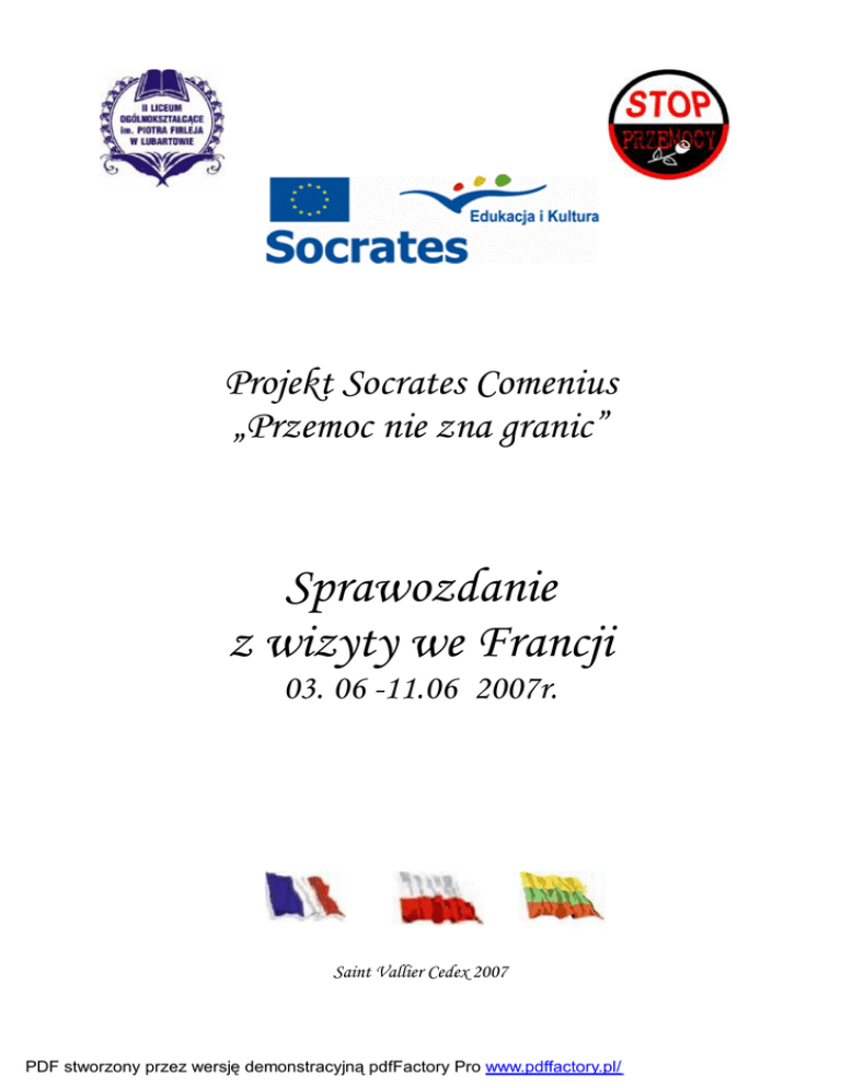 Projekt Socrates Comenius „Przemoc nie zna granic” Sprawozdanie z wizyty we Francji 03. 06 -11.06 2007r. Saint Vallier Cedex 2007 PDF stworzony przez wersję demonstracyjną pdfFactory Pro www.pdffactory.pl/ Niedziela, 03.06. 2007 My, nauczyciele II LO im. Piotra Firleja, wyruszamy w podróż. Zasiadają w aucie: Przemysław Oniszczuk, Urszula Jedut, Agnieszka Budzyńska oraz Radosław Borzęcki. Ustawiamy azymut na Zgorzelec, tam będziemy przekraczać granicę. Czeka nas około 2 tys. km do przejechania. Nasz cel to Saint Vallier Cedex. Droga dłuży się najbardziej po stronie polskiej, choć mamy jeszcze dużo siły i cierpliwości. Pierwszy poważny postój, dla zaczerpnięcia sił, dopiero w Strasburgu. Tu czuje się już Francję /jakże różna od Niemiec/, czuje się swobodę i luz, jakiś taki zakamuflowany artystyczny nieład. Główną atrakcją miasta jest katedra gotycka. Co uderza, to kamień, my jesteśmy przyzwyczajeni do czerwonej, palonej cegły, nigdy nie mieliśmy tyle kamiennego budulca. Katedra w Strasburgu należy do najświetniejszych we Francji obok Senlis, Tours, Noyon, Lyon, Amiens i Bourges. Witraże modulują światło, a gregoriański śpiew ciszę. W tym mieście mieszczą się też instytucje unijne, m.in. Trybunał Praw Człowieka, czasu jednak brak, widzimy je tylko od zewnątrz. Późnym wieczorem docieramy na miejsce. Poniedziałek, 04.06.2007 O godz. 10.00 przyjeżdżają Francuzi i zabierają nas do szkoły. Najpierw zwiedzanie. Na szczęście nie wszystkie szkoły we Francji tak wyglądają, bo czekałaby nas praca kilku pokoleń, aby dojść do takiego stanu. Ta jest nowa i świetnie zarządzana, poza tym do programów europejskich wchodzą tylko najlepsze szkoły Francji. 2 PDF stworzony przez wersję demonstracyjną pdfFactory Pro www.pdffactory.pl/ Następnie jesteśmy przedstawieni dyrektorowi naczelnemu. Jakież jest nasze zdziwienie, kiedy widzimy nie menagera w drogim garniturze ale zabieganą kobietę, której biurko jest pełne dokumentów /skąd my to znamy/. Lunch /delikatne jedzenie w stołówce/ popijany winem, to standard wśród dorosłych. Naszych partnerów z Litwy jeszcze nie ma, przylecą samolotem do Lyonu. Nie wszystkim chce się jechać kilkadziesiąt godzin busem. Dzięki temu jednak, korzystając z wolnego czasu, możemy pojechać do Vienne, odwiedzić gotycką katedrę, gdzie zapadł wyrok w głośnym procesie Templariuszy, który miał swój finał 18 marca 1314 roku na stosie. Naszym przewodnikiem jest Gijon Baduf, prowadzi nas do wspaniałego amfiteatru rzymskiego, w którym za kilka tygodni odbędzie się festiwal jazzowy. 3 PDF stworzony przez wersję demonstracyjną pdfFactory Pro www.pdffactory.pl/ Mamy także okazję ze wzgórza obserwować dolinę Rodanu, rzeki, która przecina miasto na dwie części. Wije się w malowniczym krajobrazie, czuje się niemal namacalnie jej wilgotną skórę. Wtorek, 05.06.2007 Rozpoczynamy śniadaniem, tzw. kontynentalnym, czyli takim, którym w żaden sposób nie da się najeść, wina tym razem nie ma. Pierwszy dzień dotyczy omówienia ankiet związanych z przemocą, które zostały przeprowadzone wśród nauczycieli, uczniów i rodziców, po to, aby zidentyfikować problem w poszczególnych szkołach. Żadnych ciasteczek, tylko praca. Przedstawiamy wyniki ankiet, analizujemy je wspólnie i tak do 12. O tej porze jest bowiem lunch. Znów typowe, francuskie jedzenie - zupełnie inne niż u nas. Bez pośpiechu. Widać, że tradycja jedzenia we Francji jest dużo bogatsza niż w Polsce. Nawet takie na stołówce traktuje się jak rytuał, koncelebruje każdy ruch. Po jedzeniu znów do pracy, znów pełne skupienie, koncentracja nad problemem, kilka godzin dyskusji i są wreszcie wnioski. Atmosfera sympatyczna, jedynie francuski taki niezrozumiały. Wieczorem mamy zaproszenie do Jamila - wicedyrektora szkoły w Saint Vallier. Dowiadujemy się przy przednim winie /już się na nim znamy/, że Jamil pochodzi z Algierii i wie co to znaczy bieda /może nawet głód/. Ma dzięki temu dystans, luksus kosztował go zbyt drogo. Ulubione zajęcie Jamila w czasie wolnym to dzikie rajdy na motocyklu po 4 PDF stworzony przez wersję demonstracyjną pdfFactory Pro www.pdffactory.pl/ bezdrożach Ardech, rejonu po drugiej stronie rzeki, gdzie z relacji Francuzów - ludzie żyją w stanie pierwotnym. Teraz rozumiemy, dlaczego tak bardzo podobała się naszym gościom w Polsce wizyta w Dąbrówce „u Słomy”. W deszczu wracamy na kwaterę. Jutro czeka nas długi dzień. Środa, 06.06.2007 Dzisiaj wyjazd do Marsylii. Marzenie. Daleko to wprawdzie, ale warto posiedzieć w samochodzie kilka godzin, żeby zobaczyć Lazurowe Wybrzeże. Najpierw jednak Prowansja z jej małymi, niebieskimi okiennicami, czerwoną dachówką i spokojem krajobrazu. Pagórki pokryte winnicami, od czasu do czasu mały zamek, trochę zaniedbany, bo rodziny nie stać już na utrzymanie obiektu w dawnej świetności. W tym jednak właśnie, że nie stać, cały urok tych miejsc. Pierwszy postój w drodze robimy w Las Bourges de Provance. Początek czerwca, turystów mało i deszcz. Miasteczko z kamienia przykute do ruin wielkiego zamczyska, którego właścicielem był kiedyś Książę Monaco. Kwintesencja tego rejonu, same kawiarnie, sklepy z pamiątkami i przepiękny widok na górzystą okolicę. Lunch w plenerze, jemy potrawy przygotowane przez naszych gospodarzy i znów wino, bo jakże można inaczej. Opiekują się nami teraz we troje, chce się rzec: francuska gościnność. Nasz tłumacz odzyskuje wiarę w ludzi … Francuzów. Następnie udajemy się do przeuroczego małego portu, wyjętego z powieści Dumasa. Port nazywa się Cassis, kilka jachtów przygotowanych do wypłynięcia w morze, nad nimi najwyższy fiord w Europie. Krótka wycieczka w morze, niebo zachmurzone, więc lazuru brak, ale i tak jest uroczo. Po rejsie zasiadamy na chwilę w jednej z miliona chyba kawiarenek przyklejonych do portu. Szerokie ulice