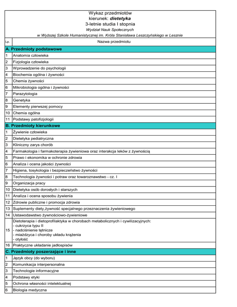 Wykaz przedmiotów kierunek: dietetyka 3-letnie studia I stopnia Wydział Nauk Społecznych w Wyższej Szkole Humanistycznej im. Króla Stanisława Leszczyńskiego w Lesznie Nazwa przedmiotu Lp. A. Przedmioty podstawowe 1 Anatomia człowieka 2 Fizjologia człowieka 3 Wprowadzenie do psychologii 4 Biochemia ogólna i żywności 5 Chemia żywności 6 Mikrobiologia ogólna i żywności 7 Parazytologia 8 Genetyka 9 Elementy pierwszej pomocy 10 Chemia ogólna 11 Podstawy patofizjologii B. Przedmioty kierunkowe 1 Żywienie człowieka 2 Dietetyka pediatryczna 3 Kliniczny zarys chorób 4 Farmakologia i farmakoterapia żywieniowa oraz interakcja leków z żywnością 5 Prawo i ekonomika w ochronie zdrowia 6 Analiza i ocena jakości żywności 7 Higiena, tosykologia i bezpieczeństwo żywności 8 Technologia żywności i potraw oraz towaroznawstwo - cz. I 9 Organizacja pracy 10 Dietetyka osób dorosłych i starszych 11 Analiza i ocena sposobu żywienia 12 Zdrowie publiczne i promocja zdrowia 13 Suplementy diety,żywność specjalnego przeznaczenia żywieniowego 14 Ustawodawstwo żywnościowo-żywieniowe Dietoterapia i dietoprofilaktyka w chorobach metabolicznych i cywilizacyjnych: - cukrzyca typu II 15 - nadciśnienie tętnicze - miażdzyca i choroby układu krążenia - otyłość 16 Praktyczne układanie jadłospisów C. Przedmioty poszerzające i inne 1 Język obcy (do wyboru) 2 Komunikacja interpersonalna 3 Technologie informacyjne 4 Podstawy etyki 5 Ochrona własności intelektualnej 6 Biologia medyczna 7 Podstawy bezpieczeństwa i higieny pracy 8 Wychowanie fizyczne 9 Seminarium dyplomowe D. Przedmioty specjalnościowe D1. Specjalność: Specjalno Poradnictwo dietetyczne i żywienie zbiorowe 1 Edukacja żywieniowa i poradnictwo żywieniowe 2 Żywienie w wybranych chorobach układu pokarmowego (tutaj też wątroba) 3 Żywienie kobiet ciężarnych i karmiących 4 Zaburzenia odżywiania 5 Diety niekonwencjonalne 6 Żywość funkcjonalna 7 Substancje dodatkowe w żywności 8 Surowce i leki pochodzenia naturalnego w dietetyce 9 Technologia żywności i potraw oraz towaroznawstwo - cz. I 10 Organizacja żywienia zbiorowego i cateringu 11 Podstawy rachunkowości i kosztorysowania jadłospisów 12 System HACCP w żywieniu zbiorowym D2. Specjalność: Specjalno Dietetetyka kliniczna 1 Edukacja żywieniowa i poradnictwo żywieniowe 2 Żywienie w wybranych chorobach układu pokarmowego (tutaj też wątroba) 3 Żywienie kobiet ciężarnych i karmiących 4 Zaburzenia odżywiania 5 Diety niekonwencjonalne 6 Żywość funkcjonalna 7 Substancje dodatkowe w żywności 8 Surowce i leki pochodzenia naturalnego w dietetyce 9 Żywienie w chorobach nerek 10 Żywienie w chorobach nowotworowych 11 Żywienie w chorobach skóry 12 Żywienie w alergiach i nietolerancjach pokarmowych 13 Dietoterapia i dietoprofilaktyka w osteoporozie 14 Postępowanie dietetyczne w niedożywieniu D3 Specjalność: Psychodietetyka 1 Edukacja żywieniowa i poradnictwo żywieniowe 2 Żywienie w wybranych chorobach układu pokarmowego (tutaj też wątroba) 3 Żywienie kobiet ciężarnych i karmiących 4 Zaburzenia odżywiania 5 Diety niekonwencjonalne 6 Żywość funkcjonalna 7 Substancje dodatkowe w żywności 8 Surowce i leki pochodzenia naturalnego w dietetyce 9 Psychologia rozwojowa, osobowości i motywacji 10 Nadwaga i otyłość - skutki psychologiczne i społeczne 11 Elementy psychoterapii 12 Psychoterapia osób z zaburzeniami odżywiania 13 Metodologia praktyki psychodietetycznej 14 Postępowanie dietetyczne w niedożywieniu 15 Kształtowanie prawidłowych nawyków żywieniowych E. Praktyki zawodowe 1 Praktyki zawodowe