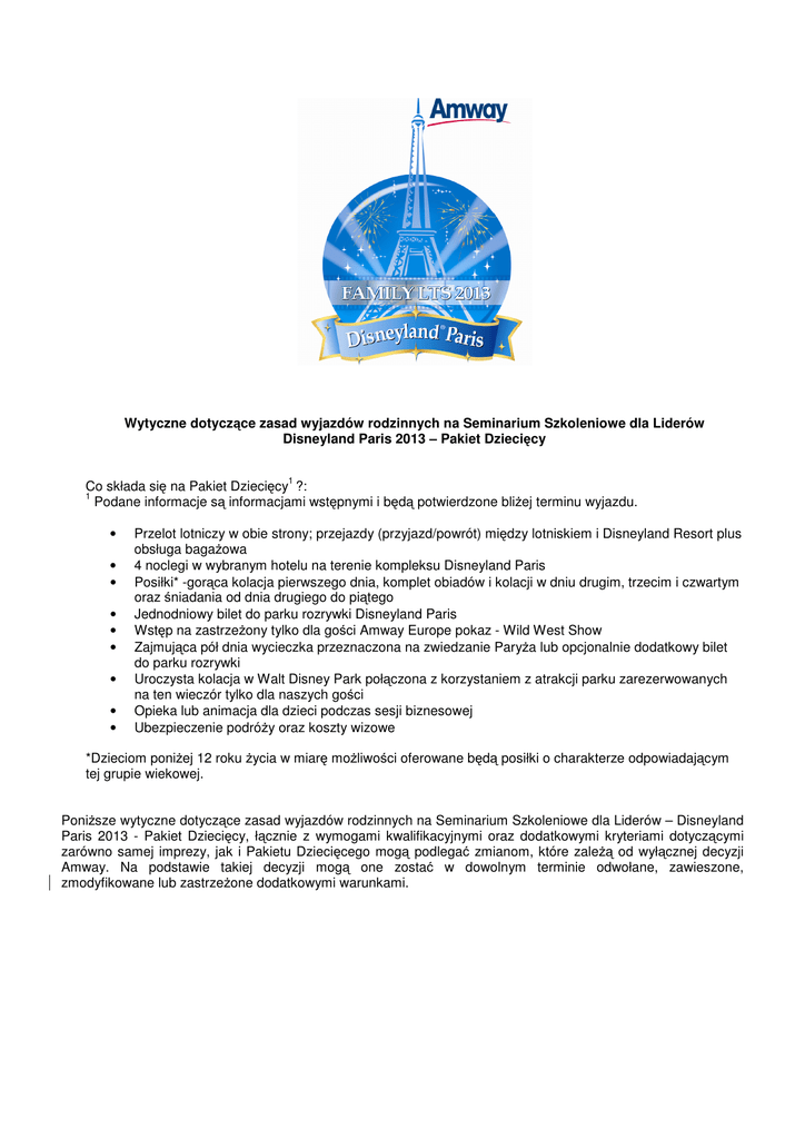 Wytyczne dotyczące zasad wyjazdów rodzinnych na Seminarium Szkoleniowe dla Liderów Disneyland Paris 2013 – Pakiet Dziecięcy 1 Co składa się na Pakiet Dziecięcy ?: 1 Podane informacje są informacjami wstępnymi i będą potwierdzone bliżej terminu wyjazdu. • • • • • • • • • Przelot lotniczy w obie strony; przejazdy (przyjazd/powrót) między lotniskiem i Disneyland Resort plus obsługa bagażowa 4 noclegi w wybranym hotelu na terenie kompleksu Disneyland Paris Posiłki* -gorąca kolacja pierwszego dnia, komplet obiadów i kolacji w dniu drugim, trzecim i czwartym oraz śniadania od dnia drugiego do piątego Jednodniowy bilet do parku rozrywki Disneyland Paris Wstęp na zastrzeżony tylko dla gości Amway Europe pokaz - Wild West Show Zajmująca pół dnia wycieczka przeznaczona na zwiedzanie Paryża lub opcjonalnie dodatkowy bilet do parku rozrywki Uroczysta kolacja w Walt Disney Park połączona z korzystaniem z atrakcji parku zarezerwowanych na ten wieczór tylko dla naszych gości Opieka lub animacja dla dzieci podczas sesji biznesowej Ubezpieczenie podróży oraz koszty wizowe *Dzieciom poniżej 12 roku życia w miarę możliwości oferowane będą posiłki o charakterze odpowiadającym tej grupie wiekowej. Poniższe wytyczne dotyczące zasad wyjazdów rodzinnych na Seminarium Szkoleniowe dla Liderów – Disneyland Paris 2013 - Pakiet Dziecięcy, łącznie z wymogami kwalifikacyjnymi oraz dodatkowymi kryteriami dotyczącymi zarówno samej imprezy, jak i Pakietu Dziecięcego mogą podlegać zmianom, które zależą od wyłącznej decyzji Amway. Na podstawie takiej decyzji mogą one zostać w dowolnym terminie odwołane, zawieszone, zmodyfikowane lub zastrzeżone dodatkowymi warunkami. Warunki uczestnictwa dzieci do lat 18 w wyjeździe rodzinnym na imprezę w Disneyland 1. Dzieci muszą być prawnie uznanymi dziećmi lub wnukami zakwalifikowanych PA. Nie będą brane pod uwagę żadne inne rodzaje pokrewieństwa – np. kuzyn/bratanica(wynika to z kwestii ubezpieczeniowych). 2. Aby kwalifikować się do zniżek dziecięcych każde dziecko musi mieć od 2 do 11 lat w dniu 23 lipca 2013 r. Dzieci w grupie powyżej 12 roku życia nie mogą mieć więcej niż 18 lat (ich 19-te urodziny nie mogą wypadać wcześniej niż 23 lipca 2013 r.). Wszystkie dzieci poniżej 18 roku życia muszą mieszkać w tym samym pokoju, co ich opiekun prawny, który musi im także towarzyszyć w czasie przelotów. 3. Rodzice dzieci poniżej 5 roku życia powinni wziąć pod uwagę poniżej wymienione względy: Pory (i czas trwania) przelotów/dojazdów na imprezę, Nie możemy zaoferować opieki nad dziećmi poniżej 5 roku życia w czasie sesji biznesowej, Przyjęcia wieczorne kończyć będą się o późnych porach – dodatkowa opieka odbywać będzie się na koszt własny opiekuna, Wiele atrakcji w parku rozrywki posiada ograniczenia wiekowe lub dotyczące wzrostu, Oferowane menu nie może zostać dostosowane do wymogów niemowląt, Żadne dodatkowe zniżki nie są przewidziane dla dzieci w wieku od 0-2 lat. 4. Specjalne wyróżnienie – Diamentowi PA mogą zabrać odpłatnie na imprezę swoje dzieci w wieku do 21 roku życia pod warunkiem, że będą one dzielić pokój ze swoimi rodzicami. 5. Nie możemy zagwarantować przelotów bezpośrednich. Możemy wykorzystywać tanie linie lotnicze z myślą o maksymalnych oszczędnościach na przelotach dzieci. Dla Rosji, Ukrainy, Rumunii oraz Turcji wszystkie przeloty międzynarodowe obsługiwane będą przez samoloty czarterowe. 6. Na cenę biletu składa się cena za dojazd i cena pakietu pobytowego. W przypadku, gdy zdecydujecie się Państwo dojechać na na imprezę własnym samochodem/pociągiem to otrzymacie ryczałt w wysokości 200 euro od osoby lub 400 euro od pary (parking na terenie kompleksu Disneyland Paris będzie bezpłatny). Ceny pakietu pobytowego za dzieci (po uwzględnieniu wszystkich wymienionych wyżej dodatków) będą ustalone następująco: Dzieci od 2 do 11 lat: 350 euro za dziecko dzielące pokój z opiekunami, korzystające z menu dziecięcego w restauracjach plus bilet do parku rozrywki. Dzieci od 12 do 18 lat: 500 euro za dziecko dzielące pokój z opiekunami, korzystające z menu dla dorosłych w restauracjach plus bilet bez zniżki do parku rozrywki. PA, którzy chcą samodzielnie dojechać na imprezę muszą taką decyzję zdeklarować w chwili rejestracji uczestnictwa w imprezie. Jeśli zostaną zarejestrowani, jako osoby przybywające na imprezę własnym transportem, nie mogą już powrócić do opcji z przelotem samolotowym. 7. Ze względów zdrowotnych oraz dotyczących bezpieczeństwa (regulacja hotelowa) maksymalnie 4 osoby (łącznie z niemowlętami) mogą zamieszkać w jednym pokoju (pokoje posiadają wyłącznie 2 łóżka rozmiaru „queen”). 8. Dodatkowe pokoje mogą zostać zarezerwowane (w miarę dostępności) jedynie podczas rejestracji oraz na koszt PA. 9. Prosimy pamiętać, że aby przekroczyć granicę wszystkie dzieci muszą posiadać dokument identyfikacyjny (paszport lub dowód osobisty). 10. Żadne dzieci (niezależnie od wieku) nie będą wpuszczane na sesję biznesową. Podczas sesji biznesowej zostanie zorganizowana opieka / animacja dla dzieci w wieku 5-18 lat. 11. Opłata za wyjazd dzieci (bilet lotniczy i pobyt) powinna zostać wniesiona do Amway podczas rejestracji uczestnictwa w imprezie. Wówczas potwierdzone zostaną też warunki rezerwacji. Rezerwacje hotelowe oraz lotnicze dotyczące dzieci zostaną potwierdzone po otrzymaniu opłat przez Amway. Wszelkie zmiany lub rezygnacje dokonane po tym terminie mogą narażać na opłaty sięgające równowartości biletu lotniczego i obciążać będą rodziców. O wszelkich nieoczekiwanych, a pozostających poza kontrolą Amway dodatkowych kosztach będziemy powiadamiać oraz przenosić je na rodziców. 12. Wszystkie Pakiety Dziecięce muszą zostać opłacone do 21 grudnia 2012 r. Nieopłacone w tym terminie pakiety będ