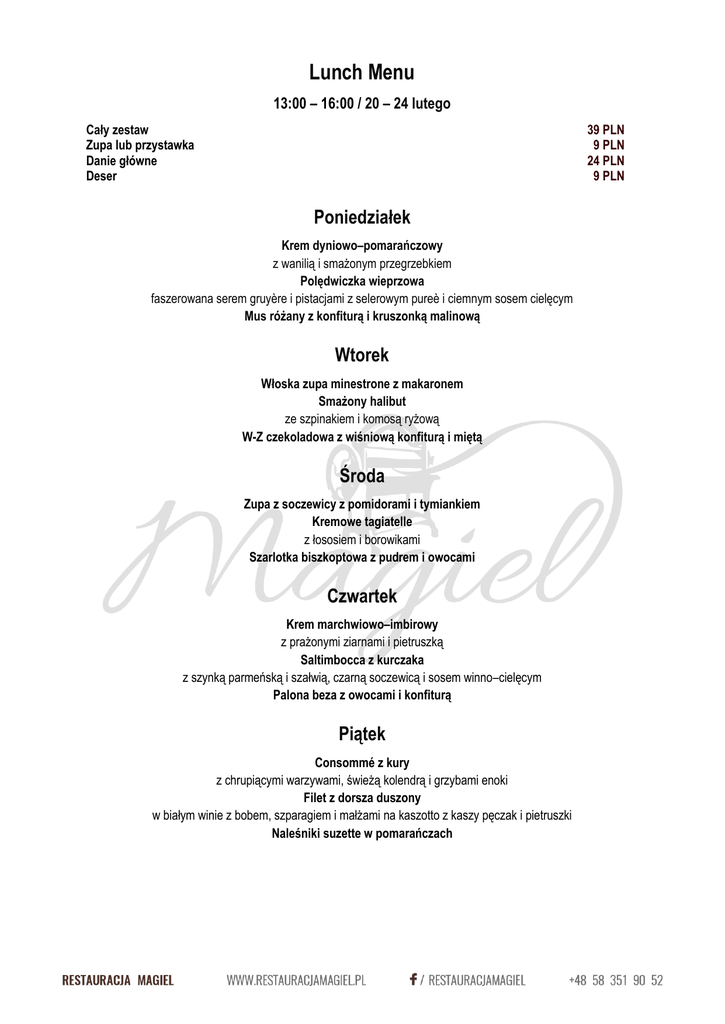 Lunch Menu 13:00 – 16:00 / 20 – 24 lutego Cały zestaw Zupa lub przystawka Danie główne Deser 39 PLN 9 PLN 24 PLN 9 PLN Poniedziałek Krem dyniowo–pomarańczowy z wanilią i smażonym przegrzebkiem Polędwiczka wieprzowa faszerowana serem gruyère i pistacjami z selerowym pureè i ciemnym sosem cielęcym Mus różany z konfiturą i kruszonką malinową Wtorek Włoska zupa minestrone z makaronem Smażony halibut ze szpinakiem i komosą ryżową W-Z czekoladowa z wiśniową konfiturą i miętą Środa Zupa z soczewicy z pomidorami i tymiankiem Kremowe tagiatelle z łososiem i borowikami Szarlotka biszkoptowa z pudrem i owocami Czwartek Krem marchwiowo–imbirowy z prażonymi ziarnami i pietruszką Saltimbocca z kurczaka z szynką parmeńską i szałwią, czarną soczewicą i sosem winno–cielęcym Palona beza z owocami i konfiturą Piątek Consommé z kury z chrupiącymi warzywami, świeżą kolendrą i grzybami enoki Filet z dorsza duszony w białym winie z bobem, szparagiem i małżami na kaszotto z kaszy pęczak i pietruszki Naleśniki suzette w pomarańczach Dodatkowe Lunch Menu 13:00 – 16:00 / 20 – 24 lutego Tost Włoskie salami, hiszpańskie chorizo z jajem sadzonym, serem i frytkami domowymi 20 PLN Bajgiel 22 PLN Wieprzowina, czosnek, mięta, salsa pomidorowo-paprykowa, papryka jalapeno, seler naciowy, słodkie frytki Bajgiel Wędzony łosoś, bordowa cebula, rukola, mięta, awokado, frytki z cukinii 23 PLN