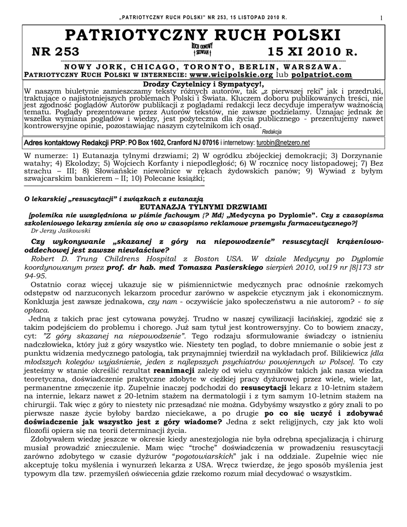 „PATRIOTYCZNY RUCH POLSKI” NR 253, 15 LISTOPAD 2010 R. 1 PATRIOTYCZNY RUCH POLSKI NR 253 15 XI 2010 R . ----------------------------------------------------------------------------------------------------------------------------------------------------------------- NOWY JORK, CHICAGO, TORONTO, BERLIN, WARSZAWA. P ATRIOTYCZNY RUCH P OLSKI W INTERNECIE : www.wicipolskie.org lub polpatriot.com Drodzy Czytelnicy i Sympatycy!, W naszym biuletynie zamieszczamy teksty różnych autorów, tak „z pierwszej ręki” jak i przedruki, traktujące o najistotniejszych problemach Polski i Świata. Kluczem doboru publikowanych treści, nie jest zgodność poglądów Autorów publikacji z poglądami redakcji lecz decyduje imperatyw ważnością tematu. Poglądy prezentowane przez Autorów tekstów, nie zawsze podzielamy. Uznając jednak że wszelka wymiana poglądów i wiedzy, jest pożyteczna dla życia publicznego - prezentujemy nawet kontrowersyjne opinie, pozostawiając naszym czytelnikom ich osąd. Redakcja Adres kontaktowy Redakcji PRP: PO Box 1602, Cranford NJ 07016 i internetowy: [email protected] W numerze: 1) Eutanazja tylnymi drzwiami; 2) W ogródku zbójeckiej demokracji; 3) Dorzynanie watahy; 4) Ekolodzy; 5) Wojciech Korfanty i niepodległość; 6) W rocznicę nocy listopadowej; 7) Bez strachu – III; 8) Słowiańskie niewolnice w rękach żydowskich panów; 9) Wywiad z byłym szwajcarskim bankierem – II; 10) Polecane książki; -------------------------------------------------------------------------------------------------------------------------------------------------------------------------------------------------------------------------------------------------------------------------------------------------------------------------------------------------------------------------------------------------------------------------------------------------------------------------------------------------------------------------------------------------------------------------------------------------------------------------------------------------------------------------------------------------------------------------------------------------------------------------------------------------� � � � � � � � � � � � � � � � � � � � � � O lekarskiej „resuscytacji” i związkach z eutanazją EUTANAZJA TYLNYMI DRZWIAMI [polemika nie uwzględniona w piśmie fachowym {? Md} „Medycyna po Dyplomie”. Czy z czasopisma szkoleniowego lekarzy zmienia się ono w czasopismo reklamowe przemysłu farmaceutycznego?] Dr Jerzy Jaśkowski Czy wykonywanie „skazanej z góry na niepowodzenie” resuscytacji krążeniowooddechowej jest zawsze niewłaściwe? Robert D. Trung Childrens Hospital z Boston USA. W dziale Medycyny po Dyplomie koordynowanym przez prof. dr hab. med Tomasza Pasierskiego sierpień 2010, vol19 nr [8]173 str 94-95. Ostatnio coraz więcej ukazuje się w piśmiennictwie medycznych prac odnośnie rzekomych odstępstw od narzuconych lekarzom procedur zarówno w aspekcie etycznym jak i ekonomicznym. Konkluzja jest zawsze jednakowa, czy nam - oczywiście jako społeczeństwu a nie autorom? - to się opłaca. Jedną z takich prac jest cytowana powyżej. Trudno w naszej cywilizacji łacińskiej, zgodzić się z takim podejściem do problemu i chorego. Już sam tytuł jest kontrowersyjny. Co to bowiem znaczy, cyt: ”Z góry skazanej na niepowodzenie”. Tego rodzaju sformułowanie świadczy o istnieniu nadczłowieka, który już z góry wszystko wie. Niestety ten pogląd, to dobre mniemanie o sobie jest z punktu widzenia medycznego patologią, tak przynajmniej twierdził na wykładach prof. Bilikiewicz [dla młodszych kolegów wyjaśnienie, jeden z najlepszych psychiatrów powojennych w Polsce]. To czy jesteśmy w stanie określić rezultat reanimacji zależy od wielu czynników takich jak nasza wiedza teoretyczna, doświadczenie praktyczne zdobyte w ciężkiej pracy dyżurowej przez wiele, wiele lat, permanentne zmęczenie itp. Zupełnie inaczej podchodzi do resuscytacji lekarz z 10-letnim stażem na internie, lekarz nawet z 20-letnim stażem na dermatologii i z tym samym 10-letnim stażem na chirurgii. Tak więc z góry to niestety nic przesądzać nie można. Gdybyśmy wszystko z góry znali to po pierwsze nasze życie byłoby bardzo nieciekawe, a po drugie po co się uczyć i zdobywać doświadczenie jak wszystko jest z góry wiadome? Jedna z sekt religijnych, czy jak kto woli filozofii opiera się na teorii determinacji życia. Zdobywałem wiedzę jeszcze w okresie kiedy anestezjologia nie była odrębną specjalizacją i chirurg musiał prowadzić znieczulenie. Mam więc “trochę” doświadczenia w prowadzeniu resuscytacji zarówno zdobytego w czasie dyżurów “pogotowiarskich” jak i na oddziale. Zupełnie więc nie akceptuję toku myślenia i wynurzeń lekarza z USA. Wręcz twierdzę, że jego sposób myślenia jest typowym dla tzw. przemyśleń oświecenia gdzie rzekomo rozum miał decydować o wszystkim. 2 „PATRIOTYCZNY RUCH POLSKI” NR 253, 15 LISTOPAD 2010 R. Takie myślenie, np. w Holandii doprowadza do ok 15 zgonów dziennie, na życzenie... A ludzie starsi boją się udawać do szpitali państwowych i protestanckich, natomiast katolickie są przepełnione. Nie mogę się zgodzić ze stwierdzeniami takimi jak cyt: “w niektórych sytuacjach doświadczeni lekarze mogą być pewni, że próby podejmowania resuscytacji będą nieskuteczne”. Pamiętam wiele sytuacji, gdzie starszy lekarz prowadzący dyżur odstępował od prowadzenia czynności, ale młodzi nie chcieli się poddawać i reanimacja została zakończona sukcesem. Pamiętam pielęgniarkę z wypadku samochodowego pod Elblągiem, którą przywieziono w stanie beznadziejnym, dwukrotnie reanimowana, 3 miesiące śpiączki i po 2 latach wróciła do zawodu. Tak więc właśnie upór i niestosowanie zasady - „już wszystko wiem”, pozwalało na utrzymanie życia. Co to z