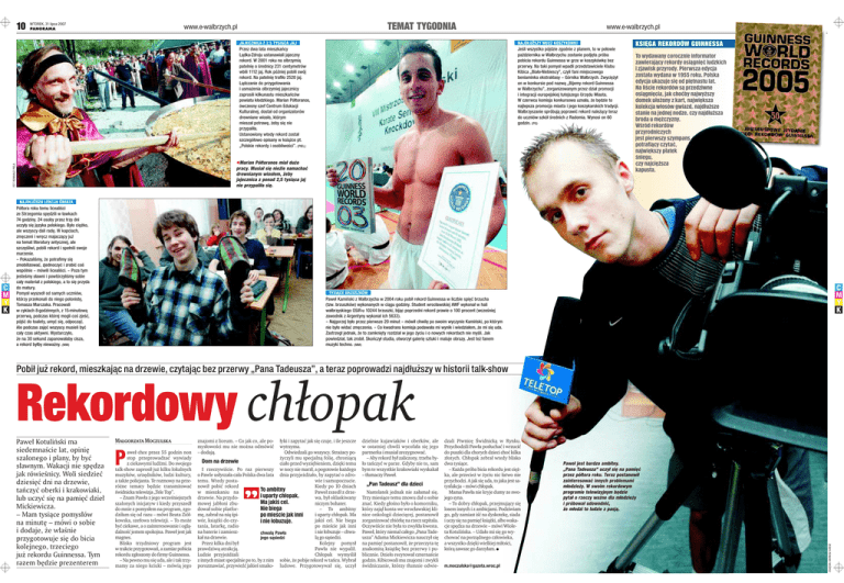 10 WTOREK, 31 lipca 2007 PANORAMA TEMAT TYGODNIA www.e-walbrzych.pl www.e-walbrzych.pl JAJECZNICA Z 2,5 TYSIĄCA JAJ NAJDŁUŻSZY MECZ KOSZYKÓWKI Przez dwa lata mieszkańcy Lądka-Zdroju ustanawiali jajeczny rekord. W 2001 roku na olbrzymią patelnię o średnicy 231 centymetrów wbili 1112 jaj. Rok później pobili swój rekord. Na patelnię trafiło 2520 jaj. Lądczanie do przygotowania i usmażenia olbrzymiej jajecznicy zaprosili kilkunastu mieszkańców powiatu kłodzkiego. Marian Półtoranos, ówczesny szef Centrum Edukacji Kulturalnej, dostał od organizatorów drewniane wiosło, którym mieszał potrawę, żeby się nie przypaliła. Ustanowiony wtedy rekord został szczegółowo opisany w książce pt. „Polskie rekordy i osobliwości”. (PIEL) Jeśli wszystko pójdzie zgodnie z planem, to w połowie października w Wałbrzychu zostanie podjęta próba pobicia rekordu Guinnessa w grze w koszykówkę bez przerwy. Na taki pomysł wpadli przedstawiciele Klubu Kibica „Biało-Niebiescy”, czyli fani miejscowego beniaminka ekstraklasy – Górnika Wałbrzych. Zwyciężył on w konkursie pod nazwą „Bijemy rekord Guinnessa w Wałbrzychu”, zorganizowanym przez dział promocji i integracji europejskiej tutejszego Urzędu Miasta. W czerwcu komisja konkursowa uznała, że będzie to najlepsza promocja miasta i jego koszykarskich tradycji. Wałbrzyszanie spróbują poprawić rekord należący teraz do uczniów szkół średnich z Radomia. Wynosi on 60 godzin. (PG) FOT. ROMUALD PIELA iMarian Półtoranos miał dużo pracy. Musiał się nieźle namachać drewnianym wiosłem, żeby jajecznica z ponad 2,5 tysiąca jaj nie przypaliła się. KSIĘGA REKORDÓW GUINNESSA To wydawany corocznie informator zawierający rekordy osiągnięć ludzkich i zjawisk przyrody. Pierwsza edycja została wydana w 1955 roku. Polska edycja ukazuje się od piętnastu lat. Na liście rekordów są przedziwne osiągnięcia, jak choćby najwyższy domek ułożony z kart, największa kolekcja włosów gwiazd, najdłuższe stanie na jednej nodze, czy najdłuższa broda u mężczyzny. Wśród rekordów przyrodniczych jest pierwszy szympans potrafiący czytać, największy płatek śniegu, czy najcięższa kapusta. NAJDŁUŻSZA LEKCJA ŚWIATA Półtora roku temu licealiści ze Strzegomia spędzili w ławkach 74 godziny. 24 osoby przez trzy dni uczyły się języka polskiego. Było ciężko, ale wszyscy dali radę. W kapciach, zmęczeni i wręcz majaczący już na temat literatury antycznej, ale szczęśliwi, pobili rekord i spełnili swoje marzenie. – Pokazaliśmy, że potrafimy się zmobilizować, zjednoczyć i zrobić coś wspólnie – mówili licealiści. – Poza tym jesteśmy sławni i powtórzyliśmy sobie cały materiał z polskiego, a to się przyda do matury. Pomysł wyszedł od samych uczniów, którzy przekonali do niego polonistę, Tomasza Marczaka. Pracowali w cyklach 8-godzinnych, z 15-minutową przerwą, podczas której mogli coś zjeść, pójść do toalety, umyć się, odpocząć. Ale podczas zajęć wszyscy musieli być cały czas aktywni. Wystarczyło, że na 30 sekund zapanowałaby cisza, a rekord byłby nieważny. (MM) TYSIĄCE BRZUSZKÓW Paweł Kamiński z Wałbrzycha w 2004 roku pobił rekord Guinnessa w liczbie spięć brzucha (tzw. brzuszków) wykonanych w ciągu godziny. Student wrocławskiej AWF wykonał w hali wałbrzyskiego OSiR-u 10244 brzuszki, bijąc poprzedni rekord prawie o 100 procent (wcześniej zawodnik z Argentyny wykonał ich 5633). – Najgorzej było przez pierwsze 20 minut – mówił chwilę po swoim wyczynie Kamiński, po którym nie było widać zmęczenia. – Co kwadrans komisja podawała mi wynik i wiedziałem, że mi się uda. Zastrzegł jednak, że to zamknięty rozdział w jego życiu i o nowych rekordach nie myśli. Jak powiedział, tak zrobił. Skończył studia, otworzył galerię sztuki i maluje obrazy. Jest też fanem muzyki techno. (MM) Pobił już rekord, mieszkając na drzewie, czytając bez przerwy „Pana Tadeusza”, a teraz poprowadzi najdłuższy w historii talk-show Rekordowy chłopak Małgorzata Moczulska aweł chce przez 55 godzin non stop przeprowadzać wywiady z ciekawymi ludźmi. Do swojego talk-show zaprosił już kilku lokalnych muzyków, urzędników, ludzi kultury, a także policjanta. Te rozmowy na przeróżne tematy będzie transmitować świdnicka telewizja „Tele Top”. – Znam Pawła z jego wcześniejszych szalonych inicjatyw i kiedy przyszedł do mnie z pomysłem na program, zgodziłam się od razu – mówi Beata Ziółkowska, szefowa telewizji. – To może być ciekawe, a o zainteresowanie i oglądalność jestem spokojna. Paweł jest jak magnes. Blisko trzydniowy program jest w trakcie przygotowań, a zamiar pobicia rekordu zgłoszony do firmy Guinnessa. – Na pewno mu się uda, ale i tak trzymamy za niego kciuki – mówią jego P znajomi z liceum. – Co jak co, ale pomysłowości mu nie można odmówić – dodają. łyki i zapytać jak się czuje, i ile jeszcze wytrzyma. Odwiedzali go wszyscy. Strażacy pożyczyli mu specjalną folię, chroniącą Dom na drzewie ciało przed wyziębieniem, dzięki temu I rzeczywiście. Po raz pierwszy w nocy nie marzł, a pogotowie każdego o Pawle usłyszała cała Polska dwa lata dnia przyjeżdżało, by zapytać o zdrowie i samopoczucie. temu. Wtedy postaKiedy po 10 dniach nowił pobić rekord To ambitny Paweł zszedł z drzew mieszkaniu na i uparty chłopak. wa, był oklaskiwany drzewie. Na przydoMa jakiś cel. niczym bohater. mowej jabłoni zbuNie biega – To ambitny dował sobie platfori uparty chłopak. Ma mę, zabrał na nią śpipo mieście jak inni jakiś cel. Nie biega wór, książki do czyi nie łobuzuje. po mieście jak inni tania, latarkę, radio i nie łobuzuje – chwana baterie i zamieszchwalą Pawła lą go sąsiedzi. kał na drzewie. jego sąsiedzi Kolejny pomysł Przez kilka dni był Pawła nie wypalił. prawdziwą atrakcją. Chłopak wymyślił Ludzie przyjeżdża