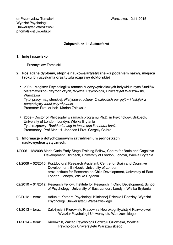 dr Przemysław Tomalski Wydział Psychologii Uniwersytet Warszawski [email protected] Warszawa, 12.11.2015 Załącznik nr 1 - Autoreferat 1. Imię i nazwisko Przemysław Tomalski 2. Posiadane dyplomy, stopnie naukowe/artystyczne – z podaniem nazwy, miejsca i roku ich uzyskania oraz tytułu rozprawy doktorskiej • 2005 - Magister Psychologii w ramach Międzywydziałowych Indywidualnych Studiów Matematyczno-Przyrodniczych, Wydział Psychologii, Uniwersytet Warszawski, Warszawa Tytuł pracy magisterskiej: Nietypowe rodziny. O dzieciach par gejów i lesbijek z perspektywy teorii przywiązania Promotor: Prof. dr hab. Marina Zalewska • 2009 - Doctor of Philosophy w ramach programu Ph.D. in Psychology, Birkbeck, University of London, Londyn, Wielka Brytania Tytuł rozprawy: Rapid orienting to faces and its neural basis Promotorzy: Prof Mark H. Johnson i Prof. Gergely Csibra 3. Informacje o dotychczasowym zatrudnieniu w jednostkach naukowych/artystycznych. 1/2006 - 12/2008 Marie Curie Early Stage Training Fellow, Centre for Brain and Cognitive Development, Birkbeck, University of London, Londyn, Wielka Brytania 01/2009 – 02/2010 Postdoctoral Research Assistant, Centre for Brain and Cognitive Development, Birkbeck, University of London oraz Institute for Research on Child Development, University of East London, Londyn, Wielka Brytania 02/2010 – 01/2012 Research Fellow, Institute for Research in Child Development, School of Psychology, University of East London, Londyn, Wielka Brytania 02/2012 – teraz Adiunkt, Katedra Psychologii Klinicznej Dziecka i Rodziny, Wydział Psychologii Uniwersytetu Warszawskiego 01/2013 – teraz Założyciel i Kierownik, Pracownia Neurokognitywistyki Rozwojowej, Wydział Psychologii Uniwersytetu Warszawskiego 11/2014 – teraz Kierownik, Zakład Psychologii Rozwoju Człowieka, Wydział Psychologii Uniwersytetu Warszawskiego 2 4. Wskazanie osiągnięcia wynikającego z art 16. ust. 2 ustawy z dnia 14 marca 2003 r. o stopniach naukowych i tytule naukowym oraz o stopniach i tytule w zakresie sztuki (Dz. U. nr 65, poz 595 ze zm.) a) Tytuł osiągnięcia naukowego/artystycznego Cykl publikacji powiązanych tematycznie pt. Poznawcze i mózgowe mechanizmy audiowizualnej percepcji dźwięków mowy. Poszukiwania predyktorów rozwoju językowego b) Publikacje składające się na osiągnięcie naukowe/artystyczne A1. Tomalski P., Ribeiro, H., Ballieux, H., Axelsson, E., Murphy, E., Moore, D.G. and Kushnerenko, E. (2013). Exploring early developmental changes in face scanning patterns during the perception of audio-visual mismatch of speech cues. European Journal of Developmental Psychology, 10(5), 611-624. A2. Kushnerenko E*., Tomalski P*., Ballieux H., Ribeiro H., Potton A., Axelsson E.L., Murphy E. and Moore D.G. (2013). Brain responses to audiovisual speech mismatch in infants are associated with individual differences in looking behavior, European Journal of Neuroscience, 38(9), 3363-3369. (* dzielone pierwsze autorstwo) A3. Kushnerenko EV, Tomalski P, Ballieux H, Potton A, Birtles D, Frostick C and Moore DG (2013). Brain responses and looking behaviour during audiovisual speech integration in infants predict auditory speech comprehension in the second year of life. Frontiers in Psychology, 4:432. A4. Tomalski P. (2015). Audiovisual speech integration and mismatch detection in early infancy. A review of recent studies using the McGurk paradigm. Psychology of Language and Communication, 19(2), 77-100. A5. Tomalski P., Moore D.G., Ribeiro H., Axelsson E., Murphy E., Karmiloff-Smith A., Johnson M.H. and Kushnerenko E. (2013). Socio-economic status and functional brain development – associations in early infancy. Developmental Science, 16(5), 676-687. c) omówienie celu naukowego/artystycznego ww. prac i osiągniętych wyników wraz z omówieniem ich ewentualnego wykorzystania Opisany tutaj cykl publikacji przedstawia badania nad wybranymi mechanizmami wczesnego rozwoju poznawczego. Głównym celem badań było opisanie nowych mózgowych oraz behawioralnych markerów typowego i nietypowego rozwoju językowego u niemowląt i małych dzieci. Zaprezentowane publikacje dotyczą dwóch głównych zagadnień: roli integracji audiowizualnej (AW) w percepcji mowy oraz roli wczesnej stymulacji środowiskowej w rozwoju językowym w pierwszych osiemnastu miesiącach życia dziecka. 3 Pierwsze trzy publikacje (A1, A2 oraz A3) dotyczą badań nad rolą percepcji konfliktu audiowizualnego w zakresie informacji o głoskach w rozwoju językowym, które wykorzystywały klasyczny paradygmat eksperymentalny autorstwa McGurka i MacDonalda (McGurk & MacDonald, 1976). Obejmują badania nad skanowaniem wzrokowym twarzy artykułujących głoski u 6-9 miesięcznych niemowląt (A1), związkiem pomiędzy skanowaniem artykułujących twarzy a mózgowymi korelatami percepcji konfliktu audiowizualnego (A2) oraz podłużną zależnością pomiędzy percepcją artykułujących twarzy w 6-9 miesiącu życia a rozwojem językowym w wieku 14-18 miesięcy. Kolejna publikacja (A4) jest przeglądem aktualnej wiedzy na temat percepcji audiowizualnej mowy u niemowląt oraz zawiera dyskusję i interpretację uzyskanych uprzednio wyników (A1-A3) w kontekście różnych perspektyw teoretycznych. Wreszcie, ostatnia publikacja (A5) stanowi pierwsze doniesienie naukowe na temat zróżnicowanego rozwoju funkcjonalnego mózgu u niemowląt z rodzin doświadczających ubóstwa. Te różnice wskazują na bardzo wczesne (poniżej 9 miesiąca) pojawienie się zwiększonego ryzyka trudności językowych u niemowląt, które wzrastają w nieoptymalnych warunkach. Praca A5 jest zatem komplementarna z pozostałymi elementami cyklu, bowiem wskazuje, jak inne rodzaje aktywności mózgowej w zapisie niemowlęcego EEG mogą służyć do opracowania markerów wczesnego ryzyka rozwoju. Przedstawiony cykl publikacji dokumentuje spójną linię badań przeprowadzonych przeze mnie razem ze współautorami w zakresie wczesnych pr
