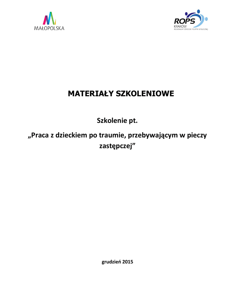 MATERIAŁY SZKOLENIOWE Szkolenie pt. „Praca z dzieckiem po traumie, przebywającym w pieczy zastępczej” grudzień 2015 I dzień 1. Trauma jako doświadczenie zdarzenia skrajnie urazowego. Rodzaje zdarzeń traumatycznych. Czynniki wywołujące traumę. Katastrofy Definicje katastrof Światowa Organizacja Zdrowia Czerwony Krzyż i Czerwony Półksiężyc Definicja medyczna Definicja socjologiczna Definicje psychologiczne Zdarzenia masowe i katastrofy wg medycyny katastrof katastrofy wypadek masowy wypadek mnogi wypadek jednostkowy Zadaniem medycyny katastrof jest wypracowanie takich procedur by wypadek mnogi nie przeobrażał się niepotrzebnie w masowy, a wypadek masowy w katastrofę dla lokalnego systemu ochrony zdrowia. Podział katastrof ze względu na ich przyczyn wg WHO Naturalne, wywołane silami przyrody – powodzie, susze, upały, mrozy, huraganowe wiatry, śnieżyce, trzęsienia ziemi, itd. Spowodowane przez człowieka – techniczne i społeczne – katastrofy budowlane, pożary w budynkach publicznych, masowe wypadki komunikacyjne, skutki zamieszek społecznych czy paniki podczas dużych zgromadzeń. Wśród katastrof spowodowanych przez człowieka rozróżniamy katastrofy te które wywołane są jego błędem czy zaniechaniem bądź nieuwagą i te które spowodowane są intencjonalnie. Do zdarzeń katastrofalnych intencjonalnych należeć będą konflikty zbrojne, zamachy terrorystyczne z użyciem materiałów wybuchowych i materiałów niebezpiecznych(biologicznych, chemicznych, radiacyjnych). 2 Psychologiczne definicje zdarzenia traumatycznego DSM 4 Sytuacja zagrażająca życie i dodatkowo wywołująca silne reakcje emocjonalne R. Janoff Bullmann, naruszenie podstawowych przekonań o świecie, o nienaruszalności własnej osoby, o przewidywalności świata, o własnej wartości R. Lifton, sytuacja w której człowiek doświadcza naruszenia ciągłości życia M. Horovitz, każde nieoczekiwane doświadczenie niemożliwe do zasymilowania przez dany system Gurris, Fischer, Riedesser, przeżycie dramatycznej różnicy pomiędzy sytuacją zagrożenia a możliwością sprostanie jej z równoczesnym odczuciem bezradności i opuszczenia, które skutkuje zmianą postrzegania własnej osoby i obrazu świata Zjawisko potencjalnie urazowe (PTE) Wg. Ronnie Janoff-Bullman, jest to zdarzenie niezwykłe oraz spostrzegane wprost jako niosące zagrożenie dla życia i ochrony siebie samego. Podczas zajścia takiego zdarzenia człowiek nosi w sobie przekonanie, że on sam lub ktoś mu bliski zmierza ku śmierci. Trauma dotyka wszystkich wymiarów człowieka: jego ciała, umysłu i ducha. Zdarzenie traumatyczne zachodzi na poziomie fizjologicznym, emocjonalnym i poznawczym, ma również głęboki wpływ na duchowość człowieka. Nagłość i niespodziewaność Spostrzegana utrata kontroli Niezwykłość zdarzeń Długotrwałe następstwa i problemy Samoobwinianie Wpływ kryzysu a wiek rozwojowy/etap życia Trauma interpersonalna Trauma w biskich relacjach wczesnodziecięca trauma , teoria przywiązania Bowlby`ego jako teoria traumy zespoły zaburzeń więzi chroniczne doświadczenie traumatyczne – zaniedbanie przemoc fizyczna i emocjonalna bycie świadkiem przemocy wobec osób znaczących psychopatologiczne zaburzenia u rodziców/opeknów wykorzystanie seksualne alkoholizm lub inne uzależnienie w rodzinie traumatyczne utraty 3 Trauma ze strony obcych napaść, pobicie porwanie molestowanie, nadużycie seksualne gwałt przemoc rówieśnicza, doświadczanie bullingu inne niespodziewane, porażające, wywołujące wstrząs wydarzenia 2. Charakterystyka traumy dziecięcej. Formy rekcji na uraz - fizjologiczne mechanizmy regulacyjne i ich skutki. Ogólny zespół adaptacyjny: Faza alarmowa – fizjologia Faza odporności – zróżnicowanie indywidualne Faza wyczerpania – zróżnicowanie indywidualne Reakcja na stres traumatyczny, a upływ czasu Pierwsze 8 godzin do 2 dni naturalna reakcja- stres incydentu krytycznego 2 – 28 – 30 ostra reakcja na stres lub ostre zaburzenie stresu traumatycznego 1 – 3 miesiące, ostry zespół stresu pourazowego Powyżej 3 miesięcy – przewlekły zespół stresu pourazowego Pierwsze objawy po upływie 6 miesięcy – odroczony zespół stresu pourazowego Trwała zmiana osobowości wg ICD - złożony zespół stresu pourazowego (stwierdzone cechy osobowości nie występowały przed wydarzeniem stresowym i utrzymują się co najmniej 2 lata) Ostra reakcja stresowa (stres incydentu krytycznego) CIS Szok , dezorientacja i odrętwienie psychiczne Zaprzeczenie Automatyzacja działań 4 Kryteria diagnostyczne zespołu ostrego stresu (ASD) Doświadczenie zdarzenia, istotnie dystresującego dla każdej osoby oraz zawierało śmieć lub zagrożenie śmiercią lub poważnym zranieniem, lub też zagrożeniem fizycznej spójności siebie oraz innych. Wynikiem tego doświadczenia były doznania intensywnego strachu, porażenia lub bezradności. Stwierdzenie występowanie czterech szerokich kategorii objawów: Objawy dysocjacyjne Objawy lękowe Objawy ponownego przeżywania traumatycznego zdarzenia Objawy unikania wspomnień o zdarzeniu Proces adaptacji do traumy wg. Everstine Fazy wydarzenia traumatycznego I. Przed wydarzeniem Kontekst życia Świadomość zagrożenia Nieuchronność II. Wydarzenie III. Bezpośrednio po wydarzeniu krytycznym 3. Konsekwencje urazów psychicznych i fizycznych na rozwój dziecka. Trauma powoduje istotne i trwałe szkody w psychicznym i fizycznym rozwoju dziecka utratę zdrowia i sprawności fizycznej, okaleczenie, niepełnosprawność poczucie bezradności utratę bezpieczeństwa bezbronność utratę panowania nad sytuacją objawy-zaburzeń psychopatologicznych reaktywne zaburzenia przywiązania problemy w kontaktach społecznych kłopoty z nauką i zachowaniem zachowania autodestrukcyjne poważne trudności w funkcjonowaniu w życiu dorosłym szansa na pozytywne zmiany na skutek negatywnego zdarzenia urazowego 5 4. Objawy typow