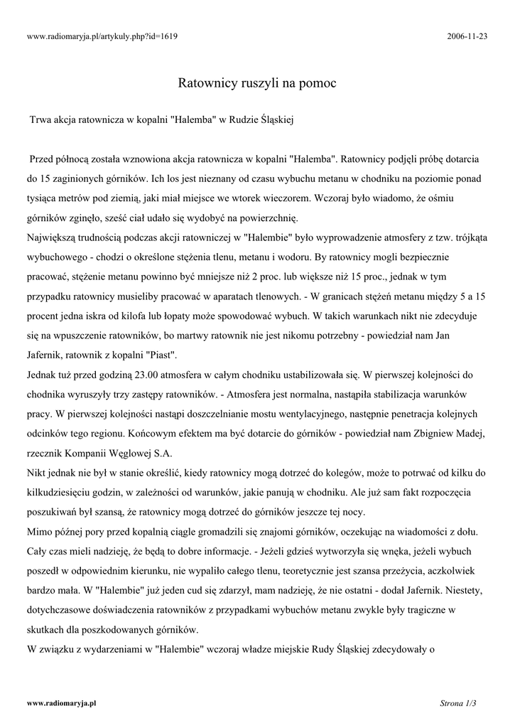 www.radiomaryja.pl/artykuly.php?id=1619 2006-11-23 Ratownicy ruszyli na pomoc Trwa akcja ratownicza w kopalni "Halemba" w Rudzie Śląskiej Przed północą została wznowiona akcja ratownicza w kopalni "Halemba". Ratownicy podjęli próbę dotarcia do 15 zaginionych górników. Ich los jest nieznany od czasu wybuchu metanu w chodniku na poziomie ponad tysiąca metrów pod ziemią, jaki miał miejsce we wtorek wieczorem. Wczoraj było wiadomo, że ośmiu górników zginęło, sześć ciał udało się wydobyć na powierzchnię. Największą trudnością podczas akcji ratowniczej w "Halembie" było wyprowadzenie atmosfery z tzw. trójkąta wybuchowego - chodzi o określone stężenia tlenu, metanu i wodoru. By ratownicy mogli bezpiecznie pracować, stężenie metanu powinno być mniejsze niż 2 proc. lub większe niż 15 proc., jednak w tym przypadku ratownicy musieliby pracować w aparatach tlenowych. - W granicach stężeń metanu między 5 a 15 procent jedna iskra od kilofa lub łopaty może spowodować wybuch. W takich warunkach nikt nie zdecyduje się na wpuszczenie ratowników, bo martwy ratownik nie jest nikomu potrzebny - powiedział nam Jan Jafernik, ratownik z kopalni "Piast". Jednak tuż przed godziną 23.00 atmosfera w całym chodniku ustabilizowała się. W pierwszej kolejności do chodnika wyruszyły trzy zastępy ratowników. - Atmosfera jest normalna, nastąpiła stabilizacja warunków pracy. W pierwszej kolejności nastąpi doszczelnianie mostu wentylacyjnego, następnie penetracja kolejnych odcinków tego regionu. Końcowym efektem ma być dotarcie do górników - powiedział nam Zbigniew Madej, rzecznik Kompanii Węglowej S.A. Nikt jednak nie był w stanie określić, kiedy ratownicy mogą dotrzeć do kolegów, może to potrwać od kilku do kilkudziesięciu godzin, w zależności od warunków, jakie panują w chodniku. Ale już sam fakt rozpoczęcia poszukiwań był szansą, że ratownicy mogą dotrzeć do górników jeszcze tej nocy. Mimo późnej pory przed kopalnią ciągle gromadzili się znajomi górników, oczekując na wiadomości z dołu. Cały czas mieli nadzieję, że będą to dobre informacje. - Jeżeli gdzieś wytworzyła się wnęka, jeżeli wybuch poszedł w odpowiednim kierunku, nie wypaliło całego tlenu, teoretycznie jest szansa przeżycia, aczkolwiek bardzo mała. W "Halembie" już jeden cud się zdarzył, mam nadzieję, że nie ostatni - dodał Jafernik. Niestety, dotychczasowe doświadczenia ratowników z przypadkami wybuchów metanu zwykle były tragiczne w skutkach dla poszkodowanych górników. W związku z wydarzeniami w "Halembie" wczoraj władze miejskie Rudy Śląskiej zdecydowały o www.radiomaryja.pl Strona 1/3 wprowadzeniu tygodniowej żałoby. W całym kraju trwały modlitwy w intencji ofiar katastrofy. Wczoraj w "Halembie" z ratownikami oraz rodzinami górników spotkali się prezydent Lech Kaczyński oraz minister zdrowia Zbigniew Religa. Nie usłyszeli dobrych wiadomości. Wietrzenie chodnika nie przynosiło efektu. Wręcz przeciwnie, z czasem rosła zawartość metanu i tlenku węgla w powietrzu. - Nie jest wykluczone, że w centrum wybuchu metanu ciągle jeszcze tli się pożar, co zwiększa możliwość wybuchu powiedział Lech Kaczyński, relacjonując spotkanie z przedstawicielami kopalni. Jak zapewnił, ratownicy pozostają w ciągłej gotowości i jeśli tylko warunki na to pozwolą, wkroczą do akcji. - Trzeba mieć iskierkę nadziei. Dlatego mówimy o ośmiu ofiarach, choć sytuacja jest bardzo zła - dodał prezydent. Około godziny 19.00, po kolejnych odczytach składu gazów w chodniku, sztab dowodzący akcją zdecydował, że ratownicy zjadą na dół i będą w gotowości, oczekując na sygnał do rozpoczęcia poszukiwań zaginionych górników. Mimo przewietrzania stężenie metanu utrzymywało się na poziomie 5 procent. Ratownicy mogliby ryzykować wejście do strefy wybuchu, jeśli ten parametr obniżyłby się do poziomu 2 procent. Na dole do akcji gotowych było 11 zastępów ratowników. Do przeszukania 300-metrowego chodnika potrzebowaliby kilkunastu minut. Z zebranych dotąd informacji nie wynikało bowiem, by chodnik był zasypany. Spośród ośmiu ofiar dwie osoby będzie bardzo trudno zidentyfikować. Konieczne staną się badania DNA, które zostaną wykonane we Wrocławiu. Na wyniki trzeba będzie poczekać około 4-5 dni. Pozostałe ciała zostały odwiezione do Zakładu Medycyny Sądowej Akademii Śląskiej. Rodziny ofiar tragedii nie pozostaną bez pomocy. Rząd zadeklarował wsparcie finansowe w wysokości 30 tys. zł dla każdej rodziny. Wczoraj prezydent zapewnił, że z budżetu jego kancelarii najbliżsi ofiar otrzymają po 10-12 tys. zł, w zależności od liczebności rodziny. Dotąd wydobyte ofiary katastrofy to osoby w wieku od 21 do około 60 lat. Z 23 górników aż 15 było pracownikami zewnętrznej firmy, pracującymi przy demontowaniu urządzeń wydobywczych. Zdaniem prezydenta, istnieje obawa, że 21-letnie osoby, nie mające dużego doświadczenia w pracy pod ziemią, mogły nie posiadać odpowiedniego przygotowania. Prezydent zaznaczył, że apelował do marszałka Sejmu Marka Jurka, by przyspieszyć prace nad prezydenckimi projektami ustaw dotyczących funkcjonowania inspekcji pracy, przestrzegania praw pracowniczych oraz powołania funduszu dla ofiar katastrof. Obecnie projekty są w komisjach. Prezydent Kaczyński zapowiedział także, iż ogłosi w kraju żałobę narodową. Stanie się to jednak dopiero wówczas, gdy znany będzie końcowy bilans akcji ratowniczej. W całym kraju odprawiane są Msze św. w intencji ofiar katastrofy i uratowania tych, którzy zdołali ją przeżyć. Rano została odprawiona Msza św. w oddalonym o kilkaset metrów od kopalni "Halemba" kościele pw. Bożego Narodzenia. Za górników i ich bliskich modlili się również przed Obrazem Matki Bożej Częstochowskiej biskupi uczestniczący w rekolekcjach na Jasnej Górze. www.radiomaryja.pl Strona 2/3 Do 