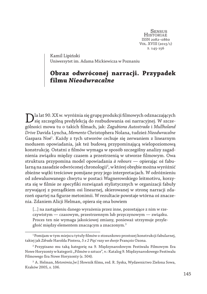 Sensus Historiae ISSN 2082–0860 Vol. XVIII (2015/1) s. 145-156 Kamil Lipiński Uniwersytet im. Adama Mickiewicza w Poznaniu Obraz odwróconej narracji. Przypadek filmu Nieodwracalne D la lat 90. XX w. wyróżnia się grupę produkcji filmowych odznaczających się szczególną predylekcją do rozbudowania osi narracyjnej. W szczególności mowa tu o takich filmach, jak: Zagubiona Autostrada i Mullholand Drive Davida Lyncha, Memento Christophera Nolana, tudzież Nieodwracalne Gaspara Noé1. Każdy z tych utworów cechuje się zerwaniem z linearnym modusem opowiadania, jak też budową przypominającą wielopoziomową konstrukcję. Ostatni z filmów wymaga w sposób szczególny analizy zagadnienia związku między czasem a przestrzenią w utworze filmowym. Owa struktura przypomina model opowiadania à rebours — opierając oś fabularną na zasadzie odwróconej chronologii2, w której obrębie można wyróżnić zbieżne wątki treściowe pomijane przy jego interpretacjach. W odróżnieniu od zdewaluowanego chwytu w postaci Wagnerowskiego leitmotivu, korzysta się w filmie ze specyfiki rozwiązań stylistycznych w organizacji fabuły zrywającej z porządkiem osi linearnej, skierowanej w stronę narracji zdarzeń opartej na figurze metonimii. W rezultacie powstaje wtórna oś znaczenia. Zdaniem Alicji Helman, opiera się ona bowiem […] na zastąpieniu danego wyrażenia przez inne, pozostające z nim w rzeczywistym — czasowym, przestrzennym lub przyczynowym — związku. Proces ten nie wymaga jakościowej zmiany, ponieważ utrzymuje przyległość między elementem znaczącym a znaczonym.3 1 Pomijam w tym miejscu tytuły filmów o stosunkowo prostszej konstrukcji fabularnej, takiej jak Zdrada Harolda Pintera, 5 x 2 Pięć razy we dwoje François Ozona. Przypisano mu taką kategorię na 9. Międzynarodowym Festiwalu Filmowym Era Nowe Horyzonty w kategorii „Filmów o sztuce”, v.: Katalog 9. Międzynarodowego Festiwalu Filmowego Era Nowe Horyzonty (s. 504). 2 A. Helman, Metonimia,[w:] Słownik filmu, red. R. Syska, Wydawnictwo Zielona Sowa, Kraków 2005, s. 106. 3 145 Kamil Lipiński W przypadku tej figury relacja między signifiant a signifié lokuje się „w układzie intersubiektywnie istniejącej zależności semantycznej”4. Roman Jakobson zauważa, iż […] proces metonimizacji obrazów rzeczywistości w filmie leży u podstaw wszelkich zabiegów semantycznych, w efekcie których rzecz (resp. obraz rzeczy) przeobraża się w znak filmowy kreowany na podstawie — typowej dla jednej z odmian metonimii zwanej synekdochą — zasady pars pro toto (część zamiast całości) realizowaną poprzez kadrowanie, montaż, zbliżenie itp.5 Metonimia ukazuje perspektywę teoretyczną w filmie pod postacią formy „krzywego” zwierciadła rzeczywistości, w którym […] stosuje […] w nich środki filmowego wyrazu, (takie jak: kadrowanie czy montaż) obrazujące daną rzecz na zasadzie pars pro toto. Synekdochę odzwierciedlamy natomiast za pośrednictwem form montażu i kadrowania jako jeden z elementów relacji metonimicznej.6 Okazuje się, biorąc pod uwagę perspektywę narracyjnych gier z czasem, że w filmie Nieodwracalne wykorzystano grupę metonimii temporalnych, których odmienna forma ufundowana jest na wiązaniu określonych tropów rozłożonych horyzontalnie w tekście kulturowym. Opierając się na wertykalnej relacji rzeczywistość — tekst, mamy do czynienia w tym przypadku z osią horyzontalną w postaci relacji dwustronnej. Efektem tych zdarzeń, jak zauważa Jakobson w przywołanym szkicu, jest to, iż podobnie jak metonimia, tak i metafora stanowią „dwa podstawowe rodzaje konstrukcji filmowej”, powiązane w filmie na zmianie proporcji i konfrontacji różnych co do wielkości fragmentów przedmiotów, różnych pod względem wielkości fragmentów przestrzeni i czasu, według podobieństwa i kontrastu7. Jakobson ukazuje metonimię jako trop stylistyczny w tekście poetyckim, usytuowany „w przestrzeni i w czasie” między zestawem kategorii szczególnie istotnych dla narracji w opowiadaniu filmowym. Omawianą figurę, zdaniem Jakobsona, szczególnie wyróżnia opozycyjność, zaś podobieństwo i kontrast opisuje nierozłącznie jej domenę. Jako znamienny przykład wyłonienia metonimii uznaje Jakobson pytanie „Czym jest śmierć?”, które występuje w wierszu Borysa Pasternaka The Safe Conduct po zestawie sentencji: „Gdybym rzucił okiem na twoją twarz / Mógłbym przestraszyć się na śmierć”. 4 M. Hendrykowski, Słownik terminów filmoznawczych, Wydawnictwo ARS NOVA, Poznań 1994, s. 174. 5 Ibidem, s. 174. 6 Ibidem. R. Jakobson, Upadek filmu, [w:] Estetyka i film, red. A. Helman, Wydawnictwo Artystyczne i Filmowe, Warszawa 1972, s. 94. 7 146 Obraz odwróconej narracji. Przypadek Nieodwracalne W odpowiedzi na zadane pytanie poeta pisze: „Śmierć jest niczym innym / jak duszą oddzieloną od ciała”. Nawiązując do natury śmierci, koreluje on tym samym z „osobą, formą, wyglądem” wprowadzanych przez poetę w łańcuch metonimicznych obrazów, takich, jak „zapach gnijących zwłok — ciała — przykład śmierci”. Gdzie indziej oświadcza rosyjski językoznawca, iż w świecie poezji rządzonej przez metonimie kontury rzeczy są zamazane i różne aspekty jednego obiektu przekształcają się w niezależne obiekty w sobie8. W efekcie zamazywania i przekształcania konturów danych rzeczy zmianie ulega pole semantyczne całego utworu. W dalszym fragmencie wiersza pokazuje on relację metonimiczną ujmowaną jako „dekompozycję i wzajemne przenikanie się obiektów” z aspiracjami w konstrukcji do kompozycji właściwej dla malarzy kubistycznych. Zarazem „przyległości i dystanse pomiędzy rzeczami zmieniają się, jak też ich wymiary”9, gdzie mamy do czynienia z nieustannym formatowaniem się relacji pozycji między rzeczami, jak ich wzajemnym przenikaniem. Dominująca funkcja języka krystalizuje się na poziomie 