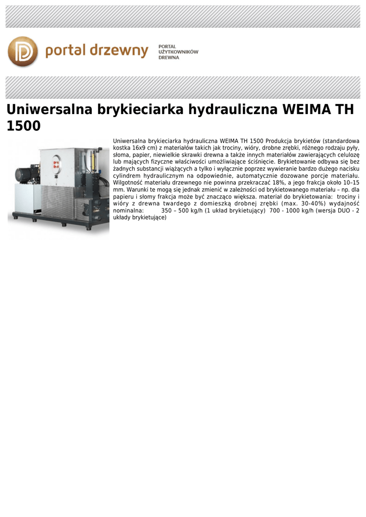 Uniwersalna brykieciarka hydrauliczna WEIMA TH 1500 Uniwersalna brykieciarka hydrauliczna WEIMA TH 1500 Produkcja brykietów (standardowa kostka 16x9 cm) z materiałów takich jak trociny, wióry, drobne zrębki, różnego rodzaju pyły, słoma, papier, niewielkie skrawki drewna a także innych materiałów zawierających celulozę lub mających fizyczne właściwości umożliwiające ściśnięcie. Brykietowanie odbywa się bez żadnych substancji wiążących a tylko i wyłącznie poprzez wywieranie bardzo dużego nacisku cylindrem hydraulicznym na odpowiednie, automatycznie dozowane porcje materiału. Wilgotność materiału drzewnego nie powinna przekraczać 18%, a jego frakcja około 10–15 mm. Warunki te mogą się jednak zmienić w zależności od brykietowanego materiału – np. dla papieru i słomy frakcja może być znacząco większa. materiał do brykietowania: trociny i wióry z drewna twardego z domieszką drobnej zrębki (max. 30-40%) wydajność nominalna: 350 – 500 kg/h (1 układ brykietujący) 700 - 1000 kg/h (wersja DUO - 2 układy brykietujące)