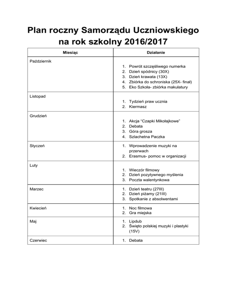 Plan roczny Samorządu Uczniowskiego na rok szkolny 2016/2017 Miesiąc Działanie Październik 1. 2. 3. 4. 5. Powrót szczęśliwego numerka Dzień spódnicy (30X) Dzień krawata (13X) Zbiórka do schroniska (25X- finał) Eko Szkoła- zbiórka makulatury Listopad 1. Tydzień praw ucznia 2. Kiermasz Grudzień 1. 2. 3. 4. Styczeń Akcja “Czapki Mikołajkowe” Debata Góra grosza Szlachetna Paczka 1. Wprowadzenie muzyki na przerwach 2. Erasmus- pomoc w organizacji Luty 1. Wieczór filmowy 2. Dzień pozytywnego myślenia 3. Poczta walentynkowa Marzec 1. Dzień teatru (27III) 2. Dzień piżamy (21III) 3. Spotkanie z absolwentami Kwiecień 1. Noc filmowa 2. Gra miejska Maj 1. Lipdub 2. Święto polskiej muzyki i plastyki (15V) Czerwiec 1. Debata