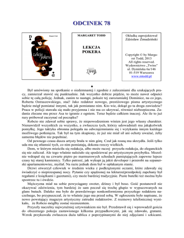 ODCINEK 78 MARGARET TODD Okładkę zaprojektował Zdzisław Żmudziński LEKCJA POKERA Copyright © by Margaret Todd, 2013 All rights reserved. Wydawnictwo „Twins” ul. Dymińska 6a/146 01-519 Warszawa www.mtodd.pl ♠ Był umówiony na spotkanie o siedemnastej i zgodnie z zaleceniami dla szukających pracy, zamierzał stawić się punktualnie. Jak wszystko dobrze pójdzie, to może nawet odpuści sobie tę całą policję. Jednak, zanim to nastąpi, pokaże tej zarozumiałej Dominice, na co jego, Roberta Ostraszewskiego, stać! Jako redaktor nowego, prestiżowego pisma artystycznego będzie mógł pomiatać innymi, tak jak pomiatano nim. Kto wie, dokąd go ta droga zawiedzie? Praca w policji stawała się mało przyjemna i nie ma co ukrywać, również niebezpieczna. Zadania zlecane mu przez Asa to igranie z ogniem. Teraz będzie całkiem inaczej. Ale ile to już razy próbował zaczynać od początku? Robcio nie zdawał sobie sprawy, że niepowodzeniom winien jest jego własny charakter. Nienawidził wszystkich za wszystko, a zwłaszcza tych, którzy udowadniali mu jakąkolwiek pomyłkę. Jego taktyka obronna polegała na odwzajemnianiu się i wytykaniu innym każdego możliwego potknięcia. Tak był na tym skupiony, że już nie miał sił ani ochoty uważać, żeby samemu błędów nie popełniać. Od pewnego czasu dusza artysty brała w nim górę. Czuł jak rosną mu skrzydła. Jeśli tylko uda mu się stłamsić tych, co nim pomiatają, dokona rzeczy wielkich. Dom, w którym mieściła się redakcja, albo może raczej przyszła redakcja, do eleganckich się nie zaliczał. Ale tego właśnie należało się spodziewać po artystycznym przybytku. Mozolnie wdrapał się na czwarte piętro po marmurowych schodach pamiętających zapewne lepsze czasy tej starej kamienicy. Tylko patrzeć, jak wykupi ją jakiś developer i przerobi na szpanerski apartamentowiec, myślał. Na razie jednak dom był w opłakanym stanie. Drzwi otworzył człowiek w średnim wieku z podkrążonymi oczami, które zdawały się świadczyć o nieprzespanej nocy. Pytanie czy spędzonej na lekturze(przedpokój zapchany był regałami z książkami i gazetami), czy może bardziej tradycyjnie. Puste butelki też można było spostrzec tu i ówdzie. Mężczyzna miał na sobie powyciągany sweter, dżinsy i był boso. Gość postanowił nie okazywać zdziwienia, tym bardziej że sam poczuł się trochę głupio w wypucowanych na glans butach. Daleko mu było do prawdziwego nonkonformizmu przyszłego redaktora naczelnego, bo przypuszczał, że to właśnie jego ma przed sobą. W ogłoszeniu było napisane, że nowo powstający magazyn artystyczny zatrudni redaktorów. Z rozmowy telefonicznej wynikało, że Robcio mógłby zostać recenzentem. Przyszły naczelny najwyraźniej sztywniakiem nie był. Przedstawił się i wprowadził gościa do obszernego pokoju zastawionego kilkoma przypadkowymi, jak się zdawało, gratami. Wzrok przykuwała zwłaszcza duża tablica z poprzypinanymi do niej zdjęciami i szkicami. Wszystkie zdawały się przedstawiać jakieś doczesne szczątki ofiar wypadków, ze szczególnym uwzględnieniem intymnych części ciała. – Rozgość się – powiedział gospodarz, uprzątając z gazet jedno z krzeseł i włączając odtwarzanie kasety wideo. – Doradzisz mi, czy zamieścić w pierwszym numerze wywiad z Arnoldem? – To mamy kontakty z Hollywood? – Nie słyszałeś o Arnoldzie Adamskim? – Każdy o nim słyszał. Mam pół tuzina podkoszulek z jego logo. – A widzisz. Na ekranie ukazał się mężczyzna około czterdziestki w nienagannie skrojonym garniturze i eleganckim krawacie. Nawet uczesanie niczym nie nasuwało przypuszczenia, że ma się do czynienia ze znanym artystą. – Inaczej go sobie wyobrażałem – powiedział Robcio. Gospodarz nie skomentował tej wypowiedzi, pozwalając dojść do głosu osobom nagrywającym wywiad. – Jakie były początki pańskiej kariery? – spytała dziennikarka prowadząca wywiad. – Projektowałem kostiumy dla cyrku. – Splajtował? – spytała domyślnie. – Ja się do tego nie przyczyniłem – zastrzegł się projektant. – Przeciwnie, moje kostiumy dla klaunów cieszyły się takim powodzeniem, że zaproponowano mi projektowanie mody męskiej. – Pan oczywiście żartuje. – Ani trochę. Zobaczy pani w lecie, ilu panów będzie paradowało po ulicach w kalesonach w kwiatki. – Jakoś trudno mi wyobrazić sobie pana samego w takim stroju. – Mnie również. Ale nie jestem pierwszym artystą, który zakpił sobie z publiki. – Kogo ma pan na myśli? – Nie mogę powiedzieć... No, chyba że obieca pani tego nie publikować. – Ciężko złożyć taką deklarację, ale trudno – westchnęła dziennikarka. – Zaspokoję chociaż własną ciekawość. – Pablo Picasso. – Potrafi pan to jakoś uzasadnić? – A co tu jest do uzasadniania? Był prekursorem Sztuk Szpetnych, które całkiem wyparły Sztuki Piękne. – I jak? Publikować? – spytał naczelny, wyłączając nagranie. – Dziennikarka słowa dotrzymała. Nagranie nigdy na antenie się nie ukazało. – Ja bym nie ryzykował – odparł szczerze Robcio. – Ja chyba też nie zaryzykuję. Wiem, że jesteś poetą, zajmiesz się więc działem poetyckim. Będziesz kreował nowe gwiazdy – przeszedł do sedna sprawy bez zbędnych wstępów. – No, nie wiem... – zaczął niepewnie kandydat na recenzenta. – Ale ja wiem. Na początek wykreujemy nową poetkę. Jej ojciec będzie naszym sponsorem. Robcio zamierzał powiedzieć, że się zastanowi, ale nie chciał robić wrażenia człowieka mało stanowczego, więc na razie milczał. – Gdybyś nie chciał występować pod własnym nazwiskiem, mam dla ciebie pseudonim. – Jaki? – Wyrzucimy z twojego nazwiska tylko jedną literkę „t” – mężczyzna z podkrążonymi oczami uśmiechał się przebiegle. – W moim nazwisku tylko jedno „t” występuje. – Właśnie! Zamiast Ostraszewski będziesz Osraszews