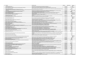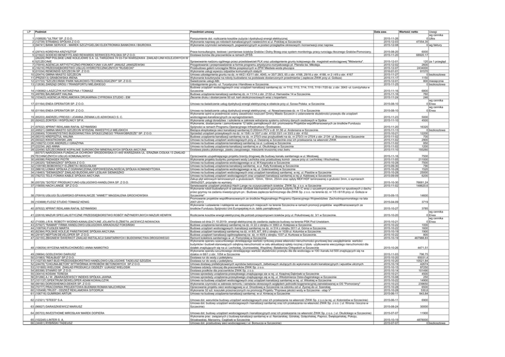 Podmiot Porozumienie dot. rozliczania kosztów zużycia i dystrybucji energii elektrycznej Wykonanie naprawy po robotach kanalizacyjnych nawierzchni w ul. Polickiej w Szczecinie Wykonanie czynności serwisowych, pogwarancyjnych w postaci przeglądów okresowych i konserwacji oraz napraw. 2015-11-26 2015-12-03 2015-12-08 Prace konsultacyjne, testowe i pomiarowe ścieków Grabów i Dolny Brzeg oraz system monitoringu pracy rurociągu tłocznego Grabów-Pomorzany. Dostawa bonów dla pracowników w ramach ZFŚŚ. 2015-08-20 2015-11-20 6000 68920,17 2015-12-01 2015-12-02 2015-12-07 2016-01-01 2015-11-27 2015-11-17 2015-12-01 2015-11-25 120 2600 2434000 81570 0 1150 800 0 14 (106982) LASZCZYK KATARZYNA I TOMASZ 15 (49789) BAUMGART HALINA 16 (103423) AGENCJA REKLAMOWA DRUKARNIA CYFROWA STUDIO - EM Sprawowanie nadzoru ogólnego przez przedstawicieli PLK oraz udostępnienie gruntu kolejowego dla magistrali wodociągowej "Midwianka". Przygotowanie i przeprowadzenie w formie programu artystyczno-rozrywkowego pt. Planeta św. Mikołaja. Przebudowa galerii rurociągów filtrów pospiesznych w ZPW Miedwie-woda płucząca Wykonanie usługi wywozu odpadów komunalnych stałych Umowa udostępnienia gruntu na dz. nr 44/2 i 43/11 obr, 4045, nr 35/7 28/3, 65 z obr. 4168, 29/16 z obr. 4188, nr 2 i 4/9 z obr. 4167 Wykonanie kosztorysów na roboty budowlane na podstawie dostarczonych przedmiarów ( zaplecze ZWiK przy ul. Golisza) Świadczenie usługi ABI. Udostępnienie gruntu -ul. Turystyczna i Handlowa w Szczecinie. Budowa urządzeń wodociągowych oraz urządzeń kanalizacji sanitarnej dz. nr 7/12, 7/13, 7/14, 7/15, 7/19 i 7/20 dz. z obr. 3043 -ul. Łomżyńska w Szczecinie Budowa urządzenia kanalizacji sanitarnej dz. nr 11/14 z obr. 2132-ul. Harnasiów 14 w Szczecinie. Zlecenie druku i dostarczenie 50 szt. kart okolicznosciowych wraz z kopertami. 2015-11-16 2015-11-16 2015-11-24 6800 760 246 17 (01164) ENEA OPERATOR SP. Z O.O. Umowa na świadczenie usług dystrybucji energii elektrycznej w obiekcie przy ul. Szosa Polska w Szczecinie 2015-08-10 18 (01164) ENEA OPERATOR SP. Z O.O. Umowa na świadczenie usług dystrybucji energii elektrycznej - ul. Nowa/owocowa dz. nr 13 w Szczecinie Wykonanie opinii w przedmiocie oceny zasadności roszczeń Gminy Miasto Szczecin o ustanowienie służebności przesyłu dla urządzeń wodociągowo-kanalizacyjnych za wynagrodzeniem. Wykonanie usługi doradztwa i szkolenia w zakresie wdrażania systemu ochrony danych osobowych w Spółce Wykonanie, dostarczenie i zamontowanie 12 tablic pamiątkowych dot. promowania Projektów współfinansowanych ze środków Funduszu Spójności w ramach Programu Operacyjnego Infrastruktura i Środowisko. Bieżąca eksploatacja sieci kanalizacji sanitarnej O 200mm PCV o dł. 91,56 ul. Andersena w Szczecinie. Sprzedaż urządzeń przesyłowych na dz. nr 15/6 i nr 33/7 z obr. 4152i 33/1 i nr 33/3 z obr. 4152. Budowa urządzenia kanalizacji sanitarnej na dz. nr 270/3 oraz przybudówki na dz. nr 270/3 i nr 270/4 z obr. 2134- ul. Brzozowa w Szczecinie Umowa na budowę urządzeń wodociagowych przy ul. Owsianej w Szczecinie oraz ich przekazania na własność ZWiK Umowa na budowe urządzenia kanalizacji sanitarnej na ul. Ludowej w Szczecinie Umowa na budowę urządzenia kanalizacji sanitarnej w ul. Okulickiego w Szczecinie Dostawa piasku płukanego, piasku zasypowego, mieszanki kruszonej oraz żwiru 2015-08-10 2015-11-20 2015-11-13 2015-10-21 2015-11-02 2015-11-02 2015-11-02 2015-11-02 2015-11-10 16320 0 bezkosztowa 12200 700 2900 850 1200 193260 2015-11-16 2015-11-05 2015-10-28 2015-09-30 2015-10-28 2015-10-28 2015-09-09 7500 211000 7500 790 1520 25000 6200 2015-10-30 2015-11-02 76681,24 148620,6 2015-09-15 14600 2015-04-09 3719 40 (97632) XPRINT REKLAMA RAFAŁ SZYMAŃSKI Opracowanie uzupełniającego projektu branży drogowej dla budowy kanału sanitarnego w ul. Miodowej. Wykonanie projektu budynku pompowni wody Lechicka oraz przebudowy komór zasuw przy ul. Lechickiej i Wschodniej. Umowa na budowę urządzenia wodociągowego w ul. M Kasprzaka w Szczecinie Umowa na budowę urządzenia kanalizacji sanitarnej w ul. Rafy Koralowej w Szczecinie Umowa na budowę urządzenia wodociągowego w rej. ul. Goleniowskiej w Szczecinie Umowa na budowę urządzeń wodociagowych oraz urządzeń kanalizacji sanitarnej w rej. ul. Piastów w Szczecinie Umowa na budowę urządzeń wodociągowych oraz urządzeń kanalizacji sanitarnej w rej ul. Kablowej w Szczecinie Zakup płyt wiórowych laminowanych o grubościach: 10mm, 18mm, 25mm oraz opłyty MDF/HDF laminowanej o grubości 3mm, o wymiarach 2800x2027, przycięte na wymiary. Serwisowanie urządzeń produkcji Hach Lange na oczyszczalniach ścieków ZWIK Sp. z o.o. w Szczecinie Wykonanie robót budowlanych w zakresie obróbek blacharskich gzymzów budynku A,B i C wraz z szczelnymi przejściami rur spustowych z dachu przez gzymsy na zadaniu inwestycyjnym pn.: Budowa zaplecza technicznego dla ZWiK Sp. z o.o. na terenie dz. nr 1/5 i 8/1/8 przy ul. Golisza w Szczecinie" Promowanie projektów współfinansowanych ze środków Regionalnego Programu Operacyjnego Województwa Zachodniopomorskiego na lata 2007-2013 Wykonanie i ustawienie i naklejenie we wskazanych miejscach na terenie Szczecina w ramach promocji projektów współfinansowanych ze środków Funduszu Spójności Unii Europejskiej m.in. tablic pamiątkowych 2015-10-27 3785 41 (22618) MAZUR SPECJALISTYCZNE PRZEDSIĘBIORSTWO ROBÓT INŻYNIERYJNYCH MAZUR HENRYK Rozliczenie kosztów energii elektrycznej dla potrzeb przepompowni ścieków przy ul. Południowej dz. 3/1 w Szczecinie. 2015-10-20 Dostawa od dnia 21.10.2015r. energii elektrycznej do zasilania zaplecza budowy na terenie PSK Pod Urwiskiem. Budowa urządzenia kanalizacji sanitarnej na dz. nr 22 z obrębu nr 3063 ul. Kolejowa w Szczecinie. Budowa urządzeń wodociągowych i kanalizacji sanitarnej na dz. nr 514 z obrębu 3011 ul. Górna w Szczecinie. Budowa urządzeń kanalizacji sanitarnej na dz. nr 8/5, 8/7, 