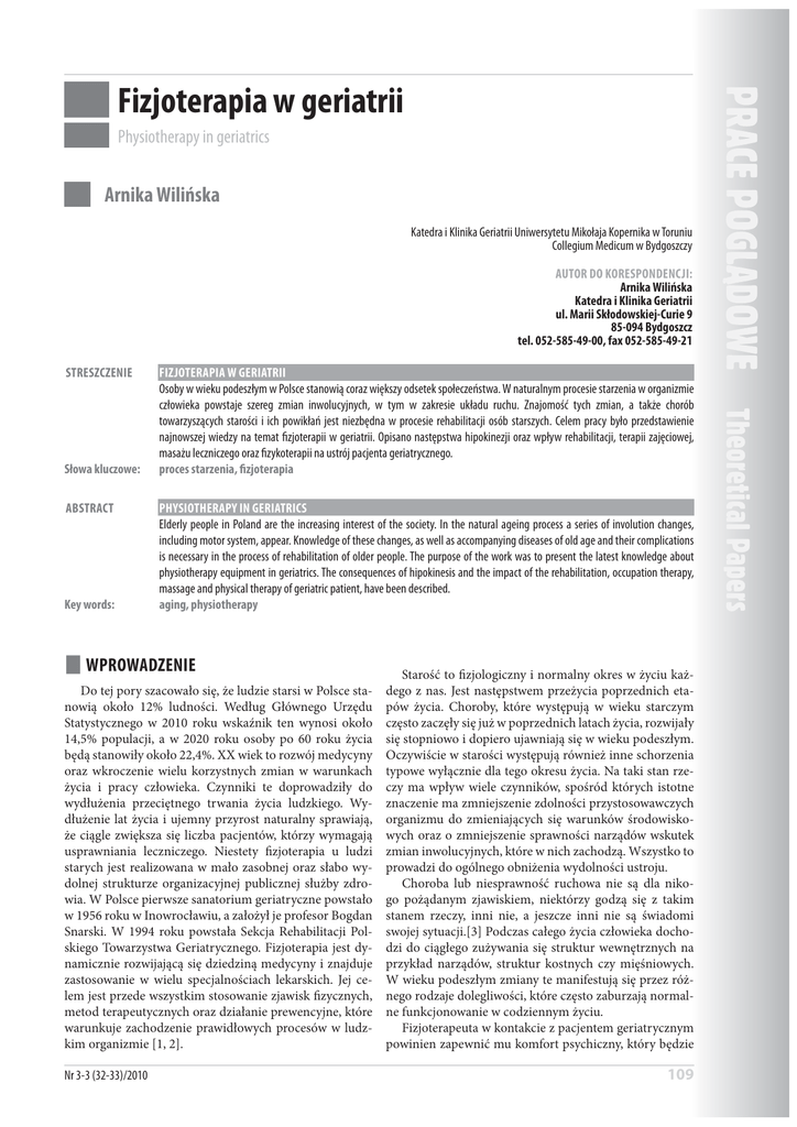 Arnika Wilińska Fizjoterapia w geriatrii Physiotherapy in geriatrics Arnika Wilińska Katedra i Klinika Geriatrii Uniwersytetu Mikołaja Kopernika w Toruniu Collegium Medicum w Bydgoszczy AUTOR DO KORESPONDENCJI: Arnika Wilińska Katedra i Klinika Geriatrii ul. Marii Skłodowskiej-Curie 9 85-094 Bydgoszcz tel. 052-585-49-00, fax 052-585-49-21 STRESZCZENIE Słowa kluczowe: ABSTRACT Key words: FIZJOTERAPIA W GERIATRII Osoby w wieku podeszłym w Polsce stanowią coraz większy odsetek społeczeństwa. W naturalnym procesie starzenia w organizmie człowieka powstaje szereg zmian inwolucyjnych, w tym w zakresie układu ruchu. Znajomość tych zmian, a także chorób towarzyszących starości i ich powikłań jest niezbędna w procesie rehabilitacji osób starszych. Celem pracy było przedstawienie najnowszej wiedzy na temat fizjoterapii w geriatrii. Opisano następstwa hipokinezji oraz wpływ rehabilitacji, terapii zajęciowej, masażu leczniczego oraz fizykoterapii na ustrój pacjenta geriatrycznego. proces starzenia, fizjoterapia PHYSIOTHERAPY IN GERIATRICS Elderly people in Poland are the increasing interest of the society. In the natural ageing process a series of involution changes, including motor system, appear. Knowledge of these changes, as well as accompanying diseases of old age and their complications is necessary in the process of rehabilitation of older people. The purpose of the work was to present the latest knowledge about physiotherapy equipment in geriatrics. The consequences of hipokinesis and the impact of the rehabilitation, occupation therapy, massage and physical therapy of geriatric patient, have been described. aging, physiotherapy WPROWADZENIE Do tej pory szacowało się, że ludzie starsi w Polsce stanowią około 12% ludności. Według Głównego Urzędu Statystycznego w 2010 roku wskaźnik ten wynosi około 14,5% populacji, a w 2020 roku osoby po 60 roku życia będą stanowiły około 22,4%. XX wiek to rozwój medycyny oraz wkroczenie wielu korzystnych zmian w warunkach życia i pracy człowieka. Czynniki te doprowadziły do wydłużenia przeciętnego trwania życia ludzkiego. Wydłużenie lat życia i ujemny przyrost naturalny sprawiają, że ciągle zwiększa się liczba pacjentów, którzy wymagają usprawniania leczniczego. Niestety fizjoterapia u ludzi starych jest realizowana w mało zasobnej oraz słabo wydolnej strukturze organizacyjnej publicznej służby zdrowia. W Polsce pierwsze sanatorium geriatryczne powstało w 1956 roku w Inowrocławiu, a założył je profesor Bogdan Snarski. W 1994 roku powstała Sekcja Rehabilitacji Polskiego Towarzystwa Geriatrycznego. Fizjoterapia jest dynamicznie rozwijającą się dziedziną medycyny i znajduje zastosowanie w wielu specjalnościach lekarskich. Jej celem jest przede wszystkim stosowanie zjawisk fizycznych, metod terapeutycznych oraz działanie prewencyjne, które warunkuje zachodzenie prawidłowych procesów w ludzkim organizmie [1, 2]. Nr 3-3 (32-33)/2010 Starość to fizjologiczny i normalny okres w życiu każdego z nas. Jest następstwem przeżycia poprzednich etapów życia. Choroby, które występują w wieku starczym często zaczęły się już w poprzednich latach życia, rozwijały się stopniowo i dopiero ujawniają się w wieku podeszłym. Oczywiście w starości występują również inne schorzenia typowe wyłącznie dla tego okresu życia. Na taki stan rzeczy ma wpływ wiele czynników, spośród których istotne znaczenie ma zmniejszenie zdolności przystosowawczych organizmu do zmieniających się warunków środowiskowych oraz o zmniejszenie sprawności narządów wskutek zmian inwolucyjnych, które w nich zachodzą. Wszystko to prowadzi do ogólnego obniżenia wydolności ustroju. Choroba lub niesprawność ruchowa nie są dla nikogo pożądanym zjawiskiem, niektórzy godzą się z takim stanem rzeczy, inni nie, a jeszcze inni nie są świadomi swojej sytuacji.[3] Podczas całego życia człowieka dochodzi do ciągłego zużywania się struktur wewnętrznych na przykład narządów, struktur kostnych czy mięśniowych. W wieku podeszłym zmiany te manifestują się przez różnego rodzaje dolegliwości, które często zaburzają normalne funkcjonowanie w codziennym życiu. Fizjoterapeuta w kontakcie z pacjentem geriatrycznym powinien zapewnić mu komfort psychiczny, który będzie 109 Fizjoterapia w geriatrii Hipokinezja nieodzownie łączy się z procesem starzenia. Brak ruchu powoduje wielkie szkody w organizmie w aspekcie klinicznym, społecznym i ekonomicznym. Powrót funkcji następuje powoli, a wydolność fizyczna pogarsza się stosunkowo szybko. Główne następstwa bezruchu to między innymi: x spadek maksymalnej objętości minutowej i wyrzutowej serca, x spadek maksymalnego pochłaniania tlenu o 20-40%, x zmniejszenie tolerancji węglowodanów, x zmniejszenie liczby erytrocytów, x spadek wrażliwości tkanek na insulinę, x odwapnienie układu kostnego, x upośledzenie perystaltyki jelit, x spadek odporności komórkowej i humoralnej, x obniżenie poziomu przemian energetycznych organizmu, co wyraża się poprzez zwiększenie katabolizmu, x zaburzenia termoregulacji, x zaburzenia w sferze psychicznej. x skłonność do tworzenia się złogów w układzie moczowym. [1] U osób z hipokinezją, która trwa już dłuższy czas często występują powikłania zakrzepowo-zatorowe. Tacy pacjenci powinni otrzymywać antykoagulanty, ponieważ rzadkie ich stosowanie wydłuża czas pobytu w szpitalu i ma niekorzystny wpływ na umieralność. Inną przyczyną, która zaburza przebieg rehabilitacji jest hipotonia ortostatyczna. Pacjenci z zaburzoną regulacją ciśnienia tętniczego muszą pamiętać o tym, aby pozycję pionową po długim leżeniu lub siedzeniu przyjmować powoli. Przed zmianą ZMIANY INWOLUCYJNE W UKŁADZIE RUCHU pozycji na stojącą należy wykonać ćwiczenia zginania i prostowania stóp. W głębokiej hipotonii ortostatycznej Starzenie się człowieka powoduje morfolo