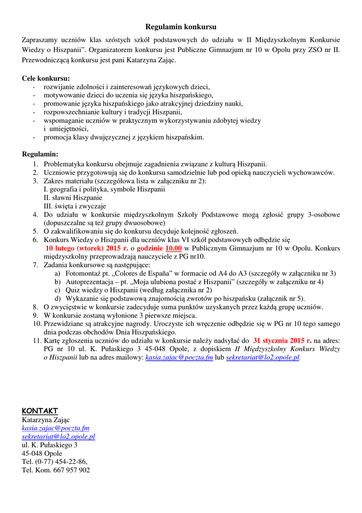 Regulamin konkursu Zapraszamy uczniów klas szóstych szkół podstawowych do udziału w II Międzyszkolnym Konkursie Wiedzy o Hiszpanii”. Organizatorem konkursu jest Publiczne Gimnazjum nr 10 w Opolu przy ZSO nr II. Przewodniczącą konkursu jest pani Katarzyna Zając. Cele konkursu: - rozwijanie zdolności i zainteresowań językowych dzieci, - motywowanie dzieci do uczenia się języka hiszpańskiego, - promowanie języka hiszpańskiego jako atrakcyjnej dziedziny nauki, - rozpowszechnianie kultury i tradycji Hiszpanii, - wspomaganie uczniów w praktycznym wykorzystywaniu zdobytej wiedzy i umiejętności, - promocja klasy dwujęzycznej z językiem hiszpańskim. Regulamin: 1. Problematyka konkursu obejmuje zagadnienia związane z kulturą Hiszpanii. 2. Uczniowie przygotowują się do konkursu samodzielnie lub pod opieką nauczycieli wychowawców. 3. Zakres materiału (szczegółowa lista w załączniku nr 2): I. geografia i polityka, symbole Hiszpanii II. sławni Hiszpanie III. święta i zwyczaje 4. Do udziału w konkursie międzyszkolnym Szkoły Podstawowe mogą zgłosić grupy 3-osobowe (dopuszczalne są też grupy dwuosobowe) 5. O zakwalifikowaniu się do konkursu decyduje kolejność zgłoszeń. 6. Konkurs Wiedzy o Hiszpanii dla uczniów klas VI szkół podstawowych odbędzie się 10 lutego (wtorek) 2015 r. o godzinie 10.00 w Publicznym Gimnazjum nr 10 w Opolu. Konkurs międzyszkolny przeprowadzają nauczyciele z PG nr10. 7. Zadania konkursowe są następujące: a) Fotomontaż pt. „Colores de España” w formacie od A4 do A3 (szczegóły w załączniku nr 3) b) Autoprezentacja – pt. „Moja ulubiona postać z Hiszpanii” (szczegóły w załączniku nr 4) c) Quiz wiedzy o Hiszpanii (według załącznika nr 2) d) Wykazanie się podstawową znajomością zwrotów po hiszpańsku (załącznik nr 5). 8. O zwycięstwie w konkursie zadecyduje suma punktów uzyskanych przez każdą grupę uczniów. 9. W konkursie zostaną wyłonione 3 pierwsze miejsca. 10. Przewidziane są atrakcyjne nagrody. Uroczyste ich wręczenie odbędzie się w PG nr 10 tego samego dnia podczas obchodów Dnia Hiszpańskiego. 11. Kartę zgłoszenia uczniów do udziału w konkursie należy nadsyłać do 31 stycznia 2015 r. na adres: PG nr 10 ul. K. Pułaskiego 3 45-048 Opole, z dopiskiem II Międzyszkolny Konkurs Wiedzy o Hiszpanii lub na adres mailowy: [email protected] lub [email protected]. KONTAKT Katarzyna Zając [email protected] [email protected] ul. K. Pułaskiego 3 45-048 Opole Tel. (0-77) 454-22-86, Tel. Kom. 667 957 902 ZGŁOSZENIE udziału w II Międzyszkolnym Konkursie Wiedzy o Hiszpanii dla klas VI szkół podstawowych Zgłaszamy udział ………………………………..…………………. nazwa szkoły w II Międzyszkolnym Konkursie Wiedzy o Hiszpanii. REPREZENTANTAMI SZKOŁY BĘDĄ: KLASY SZÓSTE Imię i nazwisko ucznia Imię, nazwisko telefon lub adres mailowy Nauczyciela, z którym można kontaktować się w sprawach konkursu …………………………………….. . Dane Szkoły: Adres ………………. Kod ………………... Tel. ………………… e-mail ……………… Załącznik nr 2: I. Geografia i polityka, symbole 1. ustrój polityczny Hiszpanii, 2. rodzina królewska 3. flaga, herb, hymn, stolica 4. symbole Hiszpanii: • Toros • Molinos (wiatraki) • El oso y el madroño (miś i drzewko truskawkowe – herb Madrytu) 5. języki urzędowe w Hiszpanii 6. położenie Hiszpanii w Europie, z jakim państwami graniczy, wyspy Hiszpanii, jakie morza, oceany otaczają Hiszpanię, nazwy i położenie gór w Hiszpanii podział administracyjny i najważniejsze miasta (Madryt, Barcelona, Santiago de Compostela, Santander, Bilbao, Zaragoza, Valencia, Granada, Toledo, Salamanca – z czego słyną, umiejętność rozpoznania miasta ze zdjęcia) II. Sławni Hiszpanie: 1. pisarze: Miguel de Cervantes, Carlos Ruiz Zafon, Federico García Lorca 2. podróżnicy: Krzysztof Kolumb 3. aktorzy: Penelope Cruiz, Antonio Banderas, Javier Bardem, 4. piosenkarze: Julio Iglesias, Enrique Iglesias, Jose Carreras, Los Del Rio (Macarena), Gipsy Kings (Bomboleo), El Chato (Loco loco) 5. artyści: Salvador Dali, Francisco Goya, Pablo Picasso, Antonio Gaudi 6. najpopularniejsze sporty w Hiszpanii; sportowcy: Rafael Nadal, Arantxa Sánchez Vicario, Fernando Alonso, Alberto Contador, Pau Gasol, Miguel Indurain, Gemma Mengual, piłka nożna w Hiszpanii – Real Madryt, FC Barcelona – mistrzowie świata; Olimpiada – Barceolna ‘92) III. Święta i zwyczaje 1. fiestas: a) Los Reyes Magos (Trzech Króli) b) Carnaval (Santa Cruz na Teneryfie) c) Fallas de Valencia (Święto Ognia) d) Semana Santa (Wielki tydzień, procesja w Sewilli)) e) Feria de Abril w Sewilli (Święto wiosny) f) San Fermin (przepędzanie i walki byków e Pampelunie) g) Święto patrona Hiszpanii – św. Jakuba w Santiago de Compostela h) el día de Sant Jordi – dzień św. Jerzego – patrona Katalonii i) Tomatina 2. taniec tradycyjny – flamenco, paso doble, salsa, sevillana, sardana, jota de Aragón 3. potrawy – paella, gaspacho, tortilla de patatas, gambas a la plancha, churros, fabada, tapas, turrón. Załącznik nr 3: Fotomontaż – „Colores de España” polega na wykonaniu fotomontażu w dowolnym programie graficznym. Może to być kolaż ze zdjęć bądź jedno zdjęcie modyfikowane w dowolny sposób, można ozdabiać je, zmieniać, łączyć. Temat „Kolory Hiszpanii” można potraktować w dowolny sposób – pokazując różnorodność kultury, przyrody, symboli Hiszpanii. Format pracy A4 do A2. Wykonany fotomontaż należy przynieść wydrukowany oraz w formie elektronicznej na pendrive lub przesłać (najpóźniej dzień przed konkursem) na adres mailowy: [email protected]. Załącznik nr 3: Autoprezentacja – Moja ulubiona postać z Hiszpanii. Należy wybrać sobie jedną ze znanych postaci hiszpańskich, może to być osoba współczesna lub z przeszłości, może to być również postać z litera