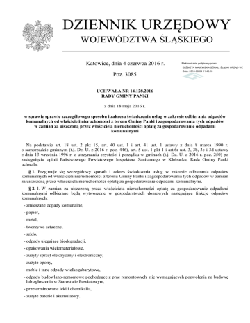 DZIENNIK URZĘDOWY WOJEWÓDZTWA ŚLĄSKIEGO Katowice, dnia 4 czerwca 2016 r. Elektronicznie podpisany przez: ELŻBIETA MAJEWSKA-GÓRAL; ŚLĄSKI URZĄD WOJEWÓ Poz. 3085 Data: 2016-06-04 11:40:16 UCHWAŁA NR 14.128.2016 RADY GMINY PANKI z dnia 18 maja 2016 r. w sprawie sprawie szczegółowego sposobu i zakresu świadczenia usług w zakresie odbierania odpadów komunalnych od właścicieli nieruchomości z terenu Gminy Panki i zagospodarowania tych odpadów w zamian za uiszczoną przez właściciela nieruchomości opłatę za gospodarowanie odpadami komunalnymi Na podstawie art. 18 ust. 2 pkt 15, art. 40 ust. 1 i art. 41 ust. 1 ustawy z dnia 8 marca 1990 r. o samorządzie gminnym (t.j. Dz. U. z 2016 r. poz. 446), art. 5 ust. 1 pkt 1 i art.6r ust. 3, 3b, 3c i 3d ustawy z dnia 13 września 1996 r. o utrzymaniu czystości i porządku w gminach (t.j. Dz. U. z 2016 r. poz. 250) po zasięgnięciu opinii Państwowego Powiatowego Inspektora Sanitarnego w Kłobucku, Rada Gminy Panki uchwala: § 1. Przyjmuje się szczegółowy sposób i zakres świadczenia usług w zakresie odbierania odpadów komunalnych od właścicieli nieruchomości z terenu Gminy Panki i zagospodarowania tych odpadów w zamian za uiszczoną przez właściciela nieruchomości opłatę za gospodarowanie odpadami komunalnymi. § 2. 1. W zamian za uiszczoną przez właściciela nieruchomości opłatę za gospodarowanie odpadami komunalnymi odbierane będą wytworzone w gospodarstwach domowych następujące frakcje odpadów komunalnych: - zmieszane odpady komunalne, - papier, - metal, - tworzywa sztuczne, - szkło, - odpady ulegające biodegradacji, - opakowania wielomateriałowe, - zużyty sprzęt elektryczny i elektroniczny, - zużyte opony, - meble i inne odpady wielkogabarytowe, - odpady budowlano-remontowe pochodzące z prac remontowych nie wymagających pozwolenia na budowę lub zgłoszenia w Starostwie Powiatowym, - przeterminowane leki i chemikalia, - zużyte baterie i akumulatory. Dziennik Urzędowy Województwa Śląskiego –2– Poz. 3085 2. Odpady wymienione w ust. 1 odbierane będą w każdej ilości zebranej przez właściciela nieruchomości. 3. Odpady komunalne zmieszane gromadzone będą w pojemnikach, natomiast odpady segregowane tj. tworzywa sztuczne, szkło, papier i tektura, metal oraz odpady ulegające biodegradacji w workach z foli LDPE. 4. Odpady wymienione w ust. 3 będą odbierane z nieruchomości zgodnie z harmonogramem odbioru opracowanym przez przedsiębiorcę wyłonionym w drodze przetargu na odbiór odpadów komunalnych, natomiast pozostałe frakcje odpadów będą dostarczane przez właścicieli nieruchomości do Punktu Selektywnej Zbiórki Odpadów Komunalnych. 5. Harmonogram wywozu odpadów komunalnych zostanie dostarczony mieszkańcom oraz będzie udostępniony na stronie internetowej urzędu: www.bip.panki.akcessnet.net § 3. 1. Odpady komunalne zbierane w sposób selektywny mieszkańcy mogą bezpłatnie oddawać do Punktu Selektywnej Zbiórki Odpadów Komunalnych, według następujących frakcji: - tworzywa sztuczne (plastikowe opakowania po napojach, kosmetykach i środkach czystości, folie i torby z tworzyw sztucznych, plastikowe nakrętki, plastikowe koszyczki po owocach, plastikowe opakowania po jogurtach, serkach i śmietanie), - szkło i opakowania ze szkła (szklane czyste słoiki lub butelki po napojach, żywności, alkoholu, szklane opakowania po kosmetykach), - metal (puszki po napojach, drobny złom: drut, gwoździe, spinacze biurowe itp.), - papier i tektura (gazety, czasopisma, ulotki, katalogi, prospekty, książki, torebki papierowe, pudełka kartonowe i tekturę), - odpady ulegające biodegradacji (obierki i resztki warzyw i owoców, fusy po kawie i herbacie, skorupki jajek i łupiny orzechów, resztki jedzenia pochodzenia roślinnego, części rośli, ściętą trawę, liście, połamane gałęzie drzew i krzewów), - meble i inne odpady wielkogabarytowe, - zużyty sprzęt elektryczny i elektroniczny, - zużyte opony, - odpady z remontów niewymagających pozwolenia na budowę lub zgłoszenia, - przeterminowane leki i chemikalia, - świetlówki, - zużyte baterie i akumulatory. 2. Transport odpadów do Punktu Selektywnej Zbiórki Odpadów Komunalnych mieszkańcy zapewniają we własnym zakresie i na własny koszt. 3. Informację o lokalizacji oraz godzinach otwarcia Punktu Selektywnej Zbiórki Odpadów Komunalnych gmina podaje do publicznej wiadomości na stronie internetowej Gminy Panki. Informacja ta zamieszczana jest także na ulotce z harmonogramem wywozu odpadów z nieruchomości. § 4. Odpady przeterminowanych leków mieszkańcy mogą również bezpłatnie oddawać do odpowiednio oznaczonych pojemników zlokalizowanych w aptekach znajdujących się na terenie Gminy Panki. § 5. Zużyte baterie i akumulatory inne niż samochodowe mieszkańcy mogą bezpłatnie oddać do odpowiednio oznakowanego pojemnika znajdującego się w Urzędzie Gminy. § 6. Częstotliwość odbierania odpadów komunalnych od właścicieli nieruchomości. 1. Odpady komunalne niesegregowane odbierane są zgodnie z następującą częstotliwością: - z zabudowy jednorodzinnej – 1 raz w miesiącu, - z zabudowy wielorodzinnej – 1 raz w tygodniu. 2. Odpady ulegające biodegradacji oraz odpady zbierane w sposób selektywny (tworzywa sztuczne, szkło, papier i tektura, metal) odbierane są zgodnie z następującą częstotliwością: Dziennik Urzędowy Województwa Śląskiego –3– Poz. 3085 - z zabudowy jednorodzinnej – 1 raz w miesiącu, - z zabudowy wielorodzinnej – 1 raz na dwa tygodnie. 3. Odpady wielkogabarytowe w systemie objazdowym zbierane będą 1 raz na rok. § 7. Odpady budowlane i rozbiórkowe, które wymagają pozwolenia na budowę lub zgłoszenia w Starostwie Powiatowym nie są objęte systemem zbiórki odpadów w zamian za uiszczoną opłatę, właściciel nieruchomości pozbywa się tego rodzaju odpadów we własnym zakresie i na własny koszt korzystając z usług podmiotu posi
