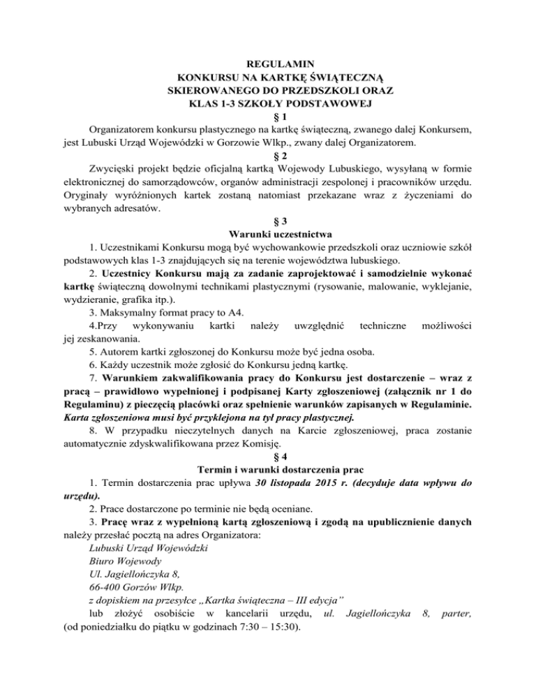REGULAMIN KONKURSU NA KARTKĘ ŚWIĄTECZNĄ SKIEROWANEGO DO PRZEDSZKOLI ORAZ KLAS 1-3 SZKOŁY PODSTAWOWEJ §1 Organizatorem konkursu plastycznego na kartkę świąteczną, zwanego dalej Konkursem, jest Lubuski Urząd Wojewódzki w Gorzowie Wlkp., zwany dalej Organizatorem. §2 Zwycięski projekt będzie oficjalną kartką Wojewody Lubuskiego, wysyłaną w formie elektronicznej do samorządowców, organów administracji zespolonej i pracowników urzędu. Oryginały wyróżnionych kartek zostaną natomiast przekazane wraz z życzeniami do wybranych adresatów. §3 Warunki uczestnictwa 1. Uczestnikami Konkursu mogą być wychowankowie przedszkoli oraz uczniowie szkół podstawowych klas 1-3 znajdujących się na terenie województwa lubuskiego. 2. Uczestnicy Konkursu mają za zadanie zaprojektować i samodzielnie wykonać kartkę świąteczną dowolnymi technikami plastycznymi (rysowanie, malowanie, wyklejanie, wydzieranie, grafika itp.). 3. Maksymalny format pracy to A4. 4.Przy wykonywaniu kartki należy uwzględnić techniczne możliwości jej zeskanowania. 5. Autorem kartki zgłoszonej do Konkursu może być jedna osoba. 6. Każdy uczestnik może zgłosić do Konkursu jedną kartkę. 7. Warunkiem zakwalifikowania pracy do Konkursu jest dostarczenie – wraz z pracą – prawidłowo wypełnionej i podpisanej Karty zgłoszeniowej (załącznik nr 1 do Regulaminu) z pieczęcią placówki oraz spełnienie warunków zapisanych w Regulaminie. Karta zgłoszeniowa musi być przyklejona na tył pracy plastycznej. 8. W przypadku nieczytelnych danych na Karcie zgłoszeniowej, praca zostanie automatycznie zdyskwalifikowana przez Komisję. §4 Termin i warunki dostarczenia prac 1. Termin dostarczenia prac upływa 30 listopada 2015 r. (decyduje data wpływu do urzędu). 2. Prace dostarczone po terminie nie będą oceniane. 3. Pracę wraz z wypełnioną kartą zgłoszeniową i zgodą na upublicznienie danych należy przesłać pocztą na adres Organizatora: Lubuski Urząd Wojewódzki Biuro Wojewody Ul. Jagiellończyka 8, 66-400 Gorzów Wlkp. z dopiskiem na przesyłce „Kartka świąteczna – III edycja” lub złożyć osobiście w kancelarii urzędu, ul. Jagiellończyka 8, parter, (od poniedziałku do piątku w godzinach 7:30 – 15:30). 4. Organizator nie ponosi odpowiedzialności za uszkodzenia powstałe podczas przesyłki. 5. Organizator nie zwraca nadesłanych prac. §5 Zasady przyznawania nagród 1. Rozstrzygnięcie Konkursu nastąpi 7 grudnia 2015r., a wyniki zostaną podane do wiadomości publicznej na stronie internetowej Organizatora www.lubuskie.uw.gov.pl oraz wysłane do mediów lokalnych – z poszanowaniem ochrony dóbr osobistych dziecka. 2. O wyłonieniu zwycięzców Konkursu decyduje powołana w tym celu Komisja Konkursowa, zwana dalej Komisją. 3. Komisję powołuje Organizator. W jej skład wchodzą przedstawiciele Lubuskiego Urzędu Wojewódzkiego w Gorzowie Wlkp. 4. Decyzje Komisji są ostateczne i nieodwołalne. 5. Prace niespełniające warunków regulaminowych nie będą oceniane przez Komisję. 6. Spośród zakwalifikowanych do Konkursu prac Komisja wybierze zwycięską kartkę. 7. Autor nagrodzonej pracy otrzyma od Organizatora indywidualną nagrodę rzeczową. 8. Organizator może przyznać dodatkowe wyróżnienia dla autorów kartek, które według Komisji odznaczają się szczególnymi walorami artystycznymi. 9. Autor zwycięskiej kartki oraz placówka, której jest podopiecznym, zostaną telefonicznie powiadomieni o przyznaniu nagrody. 10. Nagrody dla placówki oraz autora zwycięskiej kartki zostaną wręczone po ustaleniu dogodnego terminu dla wszystkich stron. §6 Ustalenia dodatkowe 1. Autorzy prac przenoszą na Organizatora nieograniczone prawa autorskie do swoich prac. W tym celu uczestnik składa stosowne oświadczenie, podpisane również przez rodzica lub opiekuna prawnego, zamieszczone na karcie zgłoszeniowej. 2. Organizator zastrzega sobie prawo do wykorzystania w materiałach edukacyjnych, informacyjnych i promocyjnych wszystkich prac nadesłanych do Konkursu. 3. Niniejszy Regulamin jest jedynym dokumentem określającym zasady Konkursu. 4. Wszelkie sprawy nieuregulowane niniejszym Regulaminem rozstrzyga Organizator.