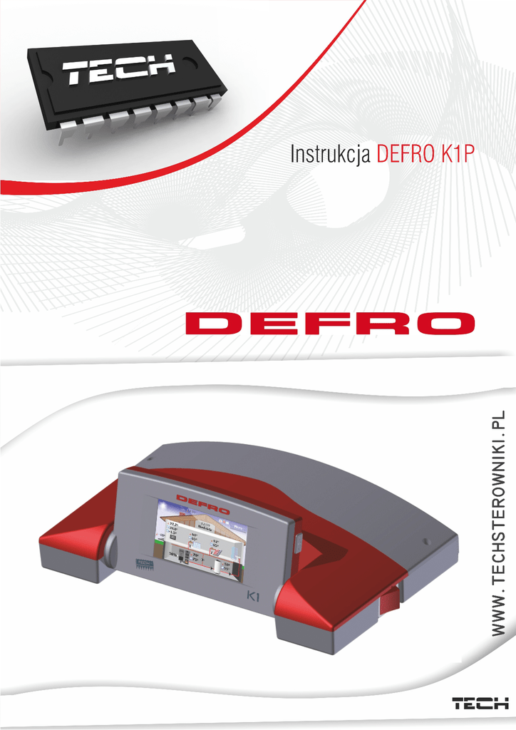 DEFRO K1P – instrukcja obsługi Deklaracja zgodności nr 97/2013 My, firma TECH, Wieprz 1047A, 34-122 Wieprz, deklarujemy z pełną odpowiedzialnością, że produkowany przez nas termoregulator DEFRO K1P (ST-590) 230V, 50Hz spełnia wymagania Rozporządzenia Ministra Gospodarki Pracy i Polityki Społecznej. (Dz.U. Nr 155, poz. 1089) z dnia 21 sierpnia 2007r., wdrażającego postanowienia Dyrektywy Niskonapięciowej (LVD) 2006/95/WE z dnia 16.01.2007 r. Sterownik pozytywnie DEFRO K1P badania z okablowaniem kompatybilności EMC przeszedł przy podłączeniu optymalnych obciążeń. Do ocen zgodności zastosowano normy zharmonizowane PN-EN 60730-2-9:2011, PN-EN 60730-1:2012. -2- DEFRO K1P – instrukcja obsługi I. Opis Regulator temperatury DEFRO K1P przeznaczony jest do kotłów C.O. z podajnikiem ślimakowym. Steruje pompą centralnego ogrzewania (C.O.), pompą ciepłej wody użytkowej (C.W.U.), dwoma pompami dodatkowymi (pompa ogrzewania podłogowego, pompa cyrkulacyjna, dodatkowa pompa CO lub dodatkowa pompa CWU), nadmuchem (wentylatorem), podajnikiem paliwa, zaworem wbudowanym oraz opcjonalnie dwoma zaworami trój- lub czterodrożnymi. Sterownik może współpracować z modułem GSM, modułem internetowym oraz z regulatorem pokojowym (dwustanowym lub wyposażonym w komunikację RS). Zaletą tego sterownika jest jego prostota w obsłudze. Użytkownik dokonuje wszelkich zmian parametrów za pomocą przejrzystego kolorowego wyświetlacza dotykowego. Każdy sterownik należy ustawić indywidualnie dla własnych potrzeb, w zależności od rodzaju opału stosowanego do palenia, jak również typu kotła. Celem rozwoju i udoskonalania produktu wszelkie uwagi dotyczące błędów programowych lub anormalnych stanów pracy sterownika prosimy kierować bezpośrednio na adres: [email protected] lub tel. (41) 3038085 w.14 lub do serwisu TECH: [email protected] – tel. (33) 8759380. Sterownik DEFRO K1P jest regulatorem z sygnałem wyjściowym ciągłym wykorzystującym algorytm regulacji PID. W tego typu sterowniku moc nadmuchu obliczana jest na podstawie pomiaru temperatury kotła i temperatury spalin mierzonej na wylocie kotła. Praca wentylatora odbywa się w sposób ciągły w czasie, a moc nadmuchu zależy bezpośrednio od mierzonej temperatury kotła, temperatury spalin i różnicy tych parametrów od ich wartości zadanych. Stabilne utrzymywanie temperatury zadanej bez zbędnych przeregulowań i oscylacji to zalety regulatora zPID. Stosując ten typ sterownika z czujnikiem wylotu spalin oszczędności w spalaniu paliwa mogą sięgać od kilku do kilkunastu procent; temperatura wody wyjściowej jest bardzo stabilna, co wpływa na dłuższą żywotność wymiennika (kotła). Kontrola temperatury spalin na wylocie kotła powoduje niską emisję pyłów i gazów szkodliwych dla środowiska. Energia cieplna ze spalin nie jest marnowana i wypuszczana do komina, lecz wykorzystywana do ogrzewania. Poniżej przedstawiamy wyniki badań przeprowadzonych z zastosowaniem sterownika Tech ze sterowaniem PID: oraz tego samego sterownika bez sterowania PID: -4- TECH II. Funkcje regulatora Rozdział ten opisuje funkcje regulatora, sposób zmiany ustawień, i poruszania się po menu. II.a) Pojęcia podstawowe Rozpalanie – cykl ten rozpoczyna się w momencie załączenia w menu sterownika funkcji rozpalanie i zatwierdzenia wyboru (na wyświetlaczu pojawi się komunikat: „PID:ROZPALANIE”) i trwa do czasu, gdy temperatura spalin osiągnie wartość co najmniej 60oC (fabrycznie ustawiony próg rozpalania), pod warunkiem, że temperatura ta nie spadnie poniżej tej wartości przez 30 sekund (fabrycznie ustawiony czas rozpalania). Praca – po zakończeniu rozpalania regulator przechodzi w cykl pracy a na wyświetlaczu pojawia się komunikat: „PID:PRACA”. Jest to podstawowy stan funkcjonowania regulatora, w którym nadmuch oraz podawanie opału odbywa się automatycznie według algorytmu PID, oscylując wokół zadanej przez użytkownika temperatury. Jeżeli temperatura nieoczekiwanie wzrośnie o ponad 5oC powyżej zadanej, uruchamia się tzw. tryb nadzoru. Tryb nadzoru – tryb ten uruchomi się automatycznie, jeżeli w cyklu pracy temperatura wzrośnie o ponad 5oC powyżej zadanej. W takim przypadku, aby obniżyć temperaturę wody obiegowej, sterownik zmienia regulację PID na ustawienia manualne (wg. parametrów w menu instalatora) a na wyświetlaczu pojawia się komunikat: „PID:NADZOR”. Wygaszenie – jeżeli temperatura spalin spadnie poniżej 37 oC (fabrycznie ustawiony próg wygaszania) i nie wzrośnie powyżej tej wartości przez 300 sekund (fabrycznie ustawiony czas wygaszania), regulator przechodzi w stan wygaszenia. W tym stanie nadmuch i podajnik przestają pracować a na wyświetlaczu pojawia się komunikat: „PID:WYGASZONY”. II.b) Strona główna Podczas normalnej pracy regulatora na dotykowym wyświetlaczu LCD widoczna jest strona główna. W zależności od ustawień użytkownika może ona mieć formę Widoku domu (ustawienie fabryczne) bądź Widoku paneli. -5- DEFRO K1P – instrukcja obsługi **Ikona regulatora pokojowego pulsuje, dopóki temperatura zadana w pomieszczeniu nie zostanie osiągnięta. W momencie, gdy regulator pokojowy zgłosi dogrzanie ikona przestanie pulsować. Naciśnięcie przycisku MENU przenosi użytkownika do kolejnych funkcji menu. Po menu można przemieszczać się przy użyciu strzałek. Naciśnięcie dowolnej funkcji w MENU uruchamia wybraną opcję. Naciskając WYJŚCIE jeden raz wychodzi się z danej funkcji, naciskając kolejny raz przechodzi się do menu wyższego poziomu, aż do widoku strony głównej sterownika. II.c) Temperatura zadana C.O. Funkcja ta służy do ustawienia temperatury zadanej C.O.; temperaturę tą można również zmienić bezpośrednio z ekranu głównego sterownika. -6- II.d) Temperatura zadana C.W.U. TECH Za pomocą tej funkcji ustawia się zadaną temperaturę wody użytkowej (funkcja nieaktywna, gdy aktywny jest tryb 