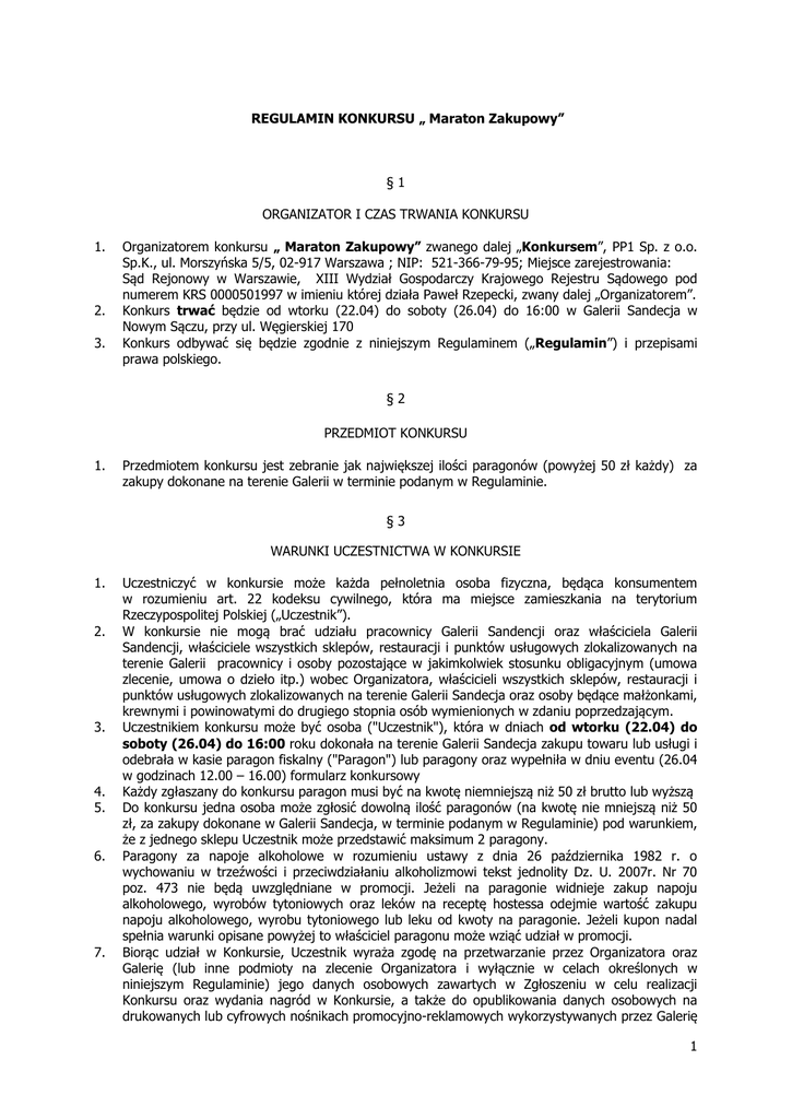 Organizatorem konkursu „ Maraton Zakupowy” zwanego dalej „Konkursem”, PP1 Sp. z o.o.