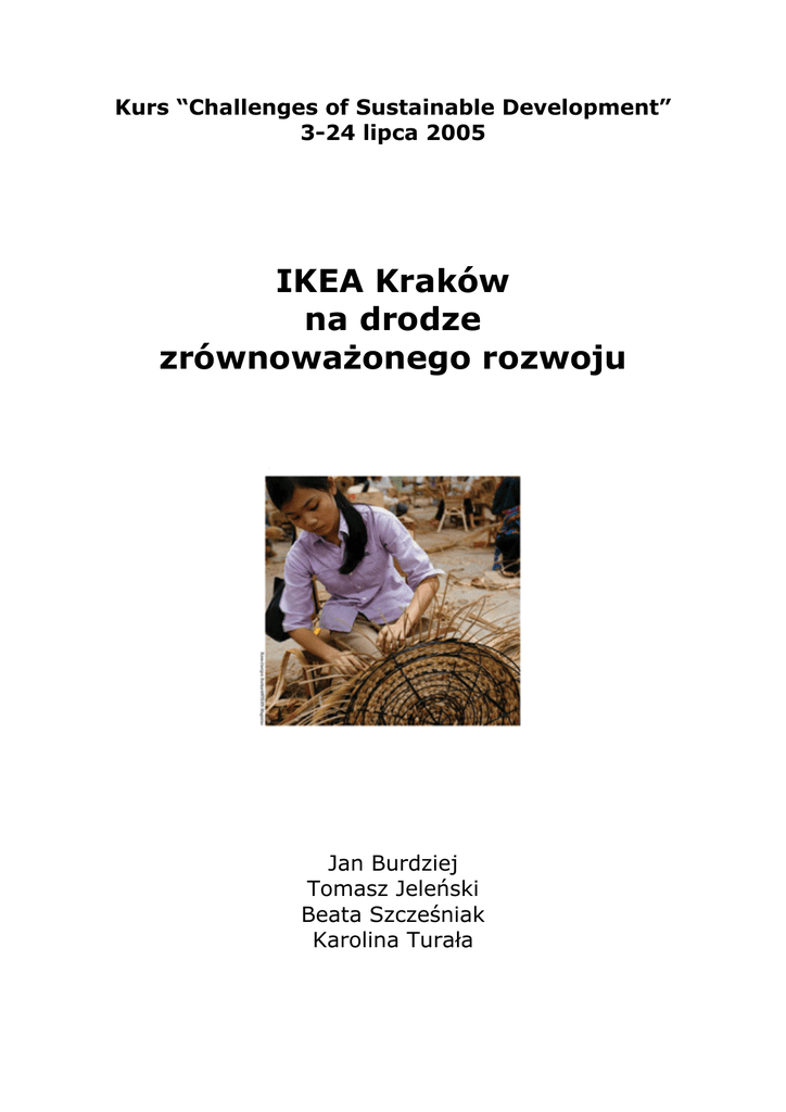Kurs “Challenges of Sustainable Development” 3-24 lipca 2005 IKEA Kraków na drodze zrównoważonego rozwoju Jan Burdziej Tomasz Jeleński Beata Szcześniak Karolina Turała Spis treści 1. Wstęp 1.1. O raporcie 1.2. Istota zrównoważonego rozwoju 1.3. IKEA 2. Odpowiedzialność środowiskowa i społeczna IKEA 2.1. Raport o odpowiedzialności środowiskowej i społecznej 2004 2.2. Ocena raportu w kontekście GRI 2.3. Zrównoważony rozwój IKEA w Krakowie • Dostęp do informacji • Podejmowanie decyzji • Zmniejszenie zużycia surowców, energii, wody • Szkolenie pracowników • Współpraca ze społecznością lokalną • Podsumowanie 1 1. Wstęp 1.1. O raporcie Niniejszy raport został stworzony przez uczestników ósmej edycji Kursu „Challenges of Sustainable Development in Poland”, jaki odbywał się w dniach 3-24 lipca 2005 roku, w Ośrodku Konferencyjnym PAN w Mogilanach koło Krakowa. Kolejne edycje Kursu są poświęcone tematyce zrównoważonego rozwoju i mają na celu szerzenie tej koncepcji w Polsce oraz zwiększanie świadomości ekologicznej polskiego społeczeństwa. Organizatorami Kursu są: Fundacja Sendzimira, Uniwersytet Florydzki, Akademia Górniczo-Hutnicza oraz Fundacja Partnerstwo dla Środowiska. Niniejszy raport jest wynikiem realizacji programu Kursu, a w szczególności tej jego części, która ma na celu zapoznanie się uczestników z praktycznymi możliwościami wprowadzania zasad zrównoważonego rozwoju w firmie. W raporcie autorzy podjęli próbę oceny procesu zrównoważonego rozwoju w IKEA Kraków. Raport został sporządzony głównie w oparciu o informacje pozyskane w drodze wywiadu z pracownikami IKEA Kraków (m.in. z Panem Robertem Kowalskim oraz Panem Piotrem Tomeczko), „Sustainability Reporting Guidelines” (Global Reporting Initiative, 2002)1, a także zasoby internetowe, w tym przede wszystkim „Social and Environmental Responsibility Report 2004” (IKEA). W raporcie zostanie przedstawiona kompletna analiza strategii proekologicznej na lata 2002-2005 i raportu IKEA za rok 2004. Są to oficjalne dokumenty IKEA, określające bieżącą politykę firmy w zakresie zrównoważonego rozwoju. Oceny dokonano w odniesieniu do międzynarodowego standardu GRI (Global Reporting Initiative). Szczegółowej analizie poddano sklep IKEA w Krakowie – dla niego opracowano propozycje działań, jakie można byłoby podjąć w zakresie działania na rzecz wdrażania i realizacji koncepcji zrównoważonego rozwoju. W ramach kursu przygotowano także raporty dla: BP Polska, Szpitala Bonifratrów im. J. Granego w Krakowie, hotelu Sheraton w Krakowie, Wyższej Szkoły Europejskiej im. Ks. J. Tischnera w Krakowie, oraz F.H.P.U. KEM w Skawinie. 1.2. Istota zrównoważonego rozwoju Rozwój zrównoważony i trwały (ang. sustainable development) to koncepcja, która wychodzi naprzeciw potrzebom środowiska naturalnego, rozwoju gospodarczego i społeczeństwa. Istotą tej koncepcji jest umożliwienie zaspokojenia potrzeb obecnego pokolenia bez ograniczania tej możliwości przyszłym pokoleniom, co realizuje się poprzez ciągłe równoważenie trzech systemów: ekologicznego, ekonomicznego i społecznego. Równowaga między tymi systemami sprzyja ochronie środowiska, podnoszeniu efektywności gospodarowania i wzrostowi jakości życia ludzi2. B. Piontek za F. Piontkiem syntetycznie ujmuje powyższe kwestie, przyjmując, że istotą rozwoju zrównoważonego i trwałego jest zapewnienie trwałej poprawy jakości życia współczesnych i przyszłych pokoleń poprzez kształtowanie właściwych proporcji w gospodarowaniu trzema rodzajami kapitału: ekonomicznym, ludzkim i przyrodniczym3. 1 www.globalreporting.org J. Adamczyk, Koncepcja zrównoważonego rozwoju w zarządzaniu przedsiębiorstwem, Wydawnictwo Akademii Ekonomicznej w Krakowie, Kraków 2001, s. 9. 3 B. Piontek, Koncepcja rozwoju zrównoważonego i trwałego Polski, Wydawnictwo Naukowe PWN, Warszawa 2002, s. 27. Barbara Piontek w swojej książce (s. 16-26) dokonuje analizy i oceny treści dostępnych definicji rozwoju zrównoważonego i trwałego, co może być szczególnie użyteczne wobec faktu, że można spotkać się ze 2 2 Zasada zrównoważonego i trwałego rozwoju to wiodąca zasada polityki ekologicznej Polski, jak i Unii Europejskiej, przyjęta przez społeczność międzynarodową na Konferencji Narodów Zjednoczonych, która pod roboczą nazwą Szczyt Ziemi odbyła się w dniach 3-14 czerwca 1992 roku w Rio de Janeiro. Zasada ta znajduje swoje odzwierciedlenie w polskich unormowaniach prawnych, m. in. w podstawowym akcie prawnym, jakim jest Konstytucja Rzeczypospolitej Polskiej. Mianowicie art. 5 Konstytucji4 stwierdza, że: Rzeczpospolita Polska (…) zapewnia ochronę środowiska, kierując się zasadą zrównoważonego rozwoju5. Idea zrównoważonego i trwałego rozwoju powinna znaleźć swoje odzwierciedlenie w zarządzaniu przedsiębiorstwem, ponieważ z jednej strony prowadzona przez przedsiębiorstwo działalność gospodarcza wywiera znaczącą presję na środowisko w formie korzystania z jego zasobów i będąc źródłem największych zagrożeń dla środowiska naturalnego, a z drugiej strony rozwój gospodarczy i wzrost poziomu życia ludzi realizują się poprzez efektywność tej działalności. Realizacja koncepcji zrównoważonego i trwałego rozwoju na poziomie przedsiębiorstwa oznacza integrowanie i równoważenie celów ekonomicznych, ekologicznych i społecznych w procesie zarządzania6. 1.3. IKEA IKEA oferuje szeroki wybór atrakcyjnych, trwałych, dobrze zaprojektowanych i funkcjonalnych artykułów7 wyposażenia domu po możliwie niskich cenach, tak aby jak najwięcej ludzi mogło sobie na nie pozwolić. IKEA jest firmą międzynarodową. O rozmachu jej działalności świadczą m.in. następujące dane8: • Obroty grupy IKEA w roku finansowym 2004 (1.09.03. – 31.08.04.) wyniosły 12,8 miliardów euro (Azja i Australia 3%, Ameryka Północna 16%, Eur