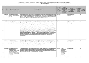Lista inwestycji do Kontraktu Terytorialnego - zgodnie z informacją przyjętą przez Zarząd Województwa Mazowieckiego w dniu 10.09.2013 BADANIA I ROZWÓJ Lp. OSI Nazwa przedsięwzięcia Instytucje odpowiedzialna za realizacje przedsięwzięcia Orientacyjna wartość Program projektu Operacyjny (mln zł) Warszawa Utworzenie Mazowieckiego Centrum Fotoniki Stosowanej CEFOS Utworzenie Mazowieckie Centrum Fotoniki Stosowanej CEFOS stworzy warunki do dynamicznego rozwoju 2014-2018 Mazowsza poprzez ścisłe sprzężenie nauki i przemysłu, będzie stanowiło Centrum edukacyjne dla młodego pokolenia i poligon technologiczny dla firm i ośrodków badawczych, dając szansę bezpośredniego kontaktu z technologiami high-tech i rozwoju w obszarze praktycznych zastosowań fotoniki. Wojskowa Akademia Techniczna Warszawa Centrum grafenu i innowacyjnych nanotechnologii Utworzeniu ośrodka badawczego o wysokim potencjale naukowym i badawczo-rozwojowym: „Centrum 2014-2016 grafenu i innowacyjnych nanotechnologii”. • adaptacja lub budowa obiektu o kubaturze ok. 35 tys. m³ i powierzchni netto wynoszącej ok. 6 tys. m², funkcjonalnie tworzącego dwa segmenty: laboratoryjny ze strefami czystymi (część niższa) oraz segment obejmujący pracownie opracowywania badań laboratoryjnych (część wyższa), • przeprowadzenie modernizacji laboratoriów badawczych wchodzących w skład Zakładów Badawczych mieszczących się w istniejących budynkach nr 2, nr 5 i nr 8. Łączna powierzchnia zmodernizowanych laboratoriów wyniesie ok. 3 tys. m². W zmodernizowanych laboratoriach będą kontynuowane badania związane z obszarem badawczym dotyczącym nanotechnologii, a przede wszystkim zostanie wprowadzony nowy program badawczy, uzupełniający badania nad grafenem prowadzone w nowym obiekcie (pierwszy komponent projektu). Dla spełnienia założeń programowych niezbędne jest wyposażenie nowopowstałych laboratoriów w specjalistyczną, unikalną w skali kraju aparaturę naukowo-badawczą - zakup unikalnej, wysokozaawansowanej aparatury badawczej. W Centrum powstaną doskonałe warunki do prowadzenia na światowym poziomie badań i prac rozwojowych w zakresie wysoko zaawansowanych, innowacyjnych technologii wytwarzania materiałów o perfekcyjnej strukturze krystalograficznej i specyficznych właściwościach. Instytut Technologii Materiałów Elektronicznych 150 OSI OMW Utworzenie Centrum innowacyjno-wdrożeniowe przemysłowych technik radiacyjnych Celem projektu jest wzrost produktywności i innowacyjności mazowieckich MŚP dzięki zastosowaniu ultranowoczesnych technik radiacyjnych do: kontroli wyrobów (zmniejszenie braków, wad ukrytych, liczby reklamacji, zwiększenie świadomości niezawodności wyrobów MŚP z Mazowsza), kontroli jakości dostaw surowcowych (np. węgla, kruszyw, cementu, podłoży drogowych i innych), kontroli jakości obiektów strategicznych (dróg, mostów, lotnisk, obiektów przemysłowych). Narodowe Centrum Badań Jądrowych 62 UP-H w Siedlcach 25 1 2 3 4 Opis przedsięwzięcia Miejsce Przewidyw realizacji (kraj/ any okres województwo/ realizacji obszar przedsięw strategicznej zięcia interwencji) OSI Siedlce Utworzenie Laboratorium Środowiskowego z wydzielonym Centrum Analiz Żywności i Diagnostyki Genetycznej w Uniwersytecie Przyrodniczo-Humanistycznym w Siedlcach 2014 – 2018 Adaptacja/modernizacja części istniejących budynków Wydziału Przyrodniczego i Wydziału Nauk Ścisłych 2014-2017 Polska / UPH dla potrzeb funkcjonowania laboratorium środowiskowego. Zakup instalacji wyspecyfikowanego mazowieckie/ wyposażenia laboratoryjnego, dedykowanego dla stworzenia certyfikowanego laboratorium środowiskowego ostrołęckoz wydzielonym Centrum Analiz Żywności i Diagnostyki Genetycznej siedlecki obszar strategicznej interwencji (SRWM). 68 Lista inwestycji do Kontraktu Terytorialnego - zgodnie z informacją przyjętą przez Zarząd Województwa Mazowieckiego w dniu 10.09.2013 BADANIA I ROZWÓJ Warszawa Wrota Mokotowa - utworzenie interdyscyplinarnego centrum współpracy nauki, badań i rozwoju z biznesem przy SGH WROTA MOKOTOWA – budowa Uczelni XXI wieku w symbiozie z miastem. Modernizacja i przebudowa infrastruktury zlokalizowanej w Al. Niepodległości 162 i 164, niezbędna do prowadzenia działalności ukierunkowanej na współpracę w obszarze B+R z przedsiębiorcami. Specjalistyczne kształcenie biznesowe i przedsiębiorczości. Prowadzenie warsztatów w różnych grupach wiekowych, z uwzględnieniem najmłodszych. Warszawa Narodowe Centrum Chemii w ramach Klastra Mazowieckiej Doliny Zielonej Chemii OSI OMW Utworzenie laboratorium nietermalnych metod higienizacji i sterylizacji bioaktywnych odpadów organicznych 5 6 7 OSI Radom Utworzenie Centrum Prototypowania w Instytucie Technologii Eksploatacji – PIB w Radomiu 8 Szkoła Głowna Handlowa w Warszawie 50 Do strategicznych celów utworzenia NCC należeć będą: 2014-2017 1.Zwiększenie konkurencyjności i innowacyjności regionu poprzez efektywny transfer i komercjalizację technologii związanej z szeroko rozumianą chemią, powstałą w jednostkach badawczych będących sygnatariuszami niniejszego konsorcjum do podmiotów gospodarczych. 2.Koncentracja badań naukowych w obszarze chemii oraz integracja działań przedsiębiorstw, władz regionalnych i innych podmiotów w celu zapewnienia przepływu wiedzy i umiejętności z sektora akademickiego do podmiotów gospodarczych z sektora chemicznego. 3.Rozwój infrastruktury, wzbogacanie wiedzy oraz wymiana doświadczeń pomiędzy Uczestnikami Klastra MGCV w celu opracowania optymalnego modelu transferu wiedzy naukowej do podmiotów gospodarczych i jego praktycznego wdrożenia. 4.Promowanie wiedzy w zakresie transferu i komercjalizacji technologii powstałej w jednostkach badawczych do firm oraz edukacja w zakresie prowadzenia działalności gospodarczej wśród studentów studiów wyższych i doktoranckich, organizowanych przez Uczestników Klastra. 5.Zape
