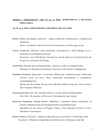 „Kultura i Społeczeństwo”, tom 57, nr 4, 2013: KONSUMPCJA I KULTURA POPULARNA vol. 57, no 4, 2013: CONSUMPTION AND POPULAR CULTURE Michał Cebula, Konsumpcja statusowa – między praktyczną świadomością a strategicznym działaniem Status Consumption: Between Practical Consciousness and Strategic Action Tomasz Kozłowski, Dobrobyt contra dobrostan. Konsumeryzm a ideał dobrego życia z perspektywy psychologii-pozytywnej Prosperity versus Well-Being: Consumerism and the Ideal of a Good Life from the Perspective of Positive Psychology Aneta Duda, Strategie oporu konsumenckiego - dezercja z rynku czy zaangażowanie Strategies for Resisting Consumerism: Desertion of the Market or Engagement Magdalena Smolarek, Kupowanie i wyrzucanie, składowanie i kolekcjonowanie, odkrywanie wartości rzeczy na nowo. Nowe zachowania konsumenckie w perspektywie socjopedagogicznej Buying and Discarding, Storing and Collecting, Rediscovering the Value of Items: New Consumer Behaviour Alicja Raciniewska, Poor chic. Estetyka ubóstwa w modzie epoki postindustrialnej Poor Chic: The Aesthetic of Poverty in Post-Industrial Age Fashion Jekatierina Szipińskaja, Siergiej Iwanow, Subkultury w kontekście kultury popularnej: od protestu subkulturowego do konsumpcjonizmu postsubkulturowego Subcultures in the Context of Popular Culture: From Subculture Protests to PostSubculture Consumerism Mateusz Halawa, Facebook - platforma algorytmicznej towarzyskości i technologia siebie Facebook: A Platform of Algorithmic Sociability and a Technology of the Self 1 Paweł Ciołkiewicz, Opowieść o mitycznej podróży bohatera współczesnej kultury popularnej, czyli kilka uwag na temat uroczystości upamiętniającej Michaela Jacksona The Mythical Journey of a Pop-Culture Hero, or Remarks on Orations at Michael Jackson’s Funeral Agnieszka Szymańska, Główne podmioty świata sztuki. Refleksje na temat roli kuratora Main Players in the Art World: Reflections on the Curator’s Role PAMIĘCI STANISŁAWA OSSOWSKIEGO Remembering Stanisław Ossowski O Ossowskim na Uniwersytecie Warszawski z perspektywy półwiecza (Bazyli Motrenko) On Ossowski at the Uniwersity of Warsaw from the Perspective of Half Century Małe ojczyzny: Stanisław Ossowski i socjologia wizualna (Elżbieta Tarkowska) Little Fatherland: Stanisław Ossowski and Visual Sociology „Ojczyzna prywatna” Stanisława Ossowskiego. Sesja popularnonaukowa w półwiecze zgonu Profesora Ossowskiego (1897-1963) (Lipno, 24 października 2013 r.) The Private Faterland of Stanisław Ossowski Elżbieta Neyman, Nad pamiątkami po Stanisławie Ossowskim w pięćdziesiątą rocznicę śmierci On Mementos of Stanisław Ossowski on the 50 th Anniversary of His Death FAKTY I PROBLEMY Facts and Problems Elżbieta Tarkowska, Łódzka szkoła badań ubóstwa The Łódź School of Poverty Research OMÓWIENIA, POLEMIKI, RECENZJE Books Review and Discussions Marcin Kula, Skomplikowane rewolucyjne kino (rec.: Marcin Florian Gawrycki, Między sztuką a polityką. Kino i kubańska rewolucja, Toruń 2013) 2 Arkadiusz Rogoziński, Kulturowy obraz – od osobistego pytania do antropologicznej refleksji (rec.: Marcin Kępiński, Podróż w ciemności. Kulturowe obrazy wojny, Łódź 2012) Magda Prokopczuk, Socjologia we flakonie pełnym zapachów (rec.: Beata Hoffman, Perfumy. Uwarunkowania kulturowo-społeczne, Kraków 2013) Mirosława Jaworowska, Kultura w biografii Juliusza Poniatowskiego (rec.: Marian Marek Drozdowski, Juliusz Poniatowski( 1886 -1975) Zarys biografii. Warszawa 2012) Robert Pawlak, O wielkich socjologach polityki (rec.: Koncepcje polityki, Włodzimierz Wesołowski [red.], Warszawa 2009) * Noty bibliograficzne Streszczenia Michał Cebula Chociaż społeczny i kulturowy aspekt konsumowania jest dość dobrze rozpoznany przez badaczy, to brakuje zgody co do teoretycznej i operacyjnej definicji konsumpcji opartej na statusie (zwłaszcza jeśli bierzemy pod uwagę myśl postmodernistyczną). W celu lepszego zrozumienia tego pojęcia autor podejmuje – na podstawie literatury przedmiotu – próbę odpowiedzi na następujące pytania: (a) Czy konsumpcja statusowa jest tożsama z konsumpcją prestiżową?; (b) Jak powinna być rozumiana konsumpcja statusowa: jako psychologiczna skłonność, strategiczne działanie czy jako relacyjna, wyłaniająca się, kulturowa praktyka?; (c) Jaka jest zależność między konsumpcją statusową a pokazową i jakie typy konsumpcji statusowej możemy wyróżnić współcześnie?; (d) Jak zmienia się konsumpcja statusowa w dzisiejszym świecie (i czy jesteśmy świadkami jej zaniku w warunkach ponowoczesności)?; (e) Jakie są sposoby pomiaru konsumpcji statusowej? (różnica między podejściem psychospołecznym a społeczno-kulturowym). Summary Although the social and cultural aspects of consumption are well known to researchers, there is lack of agreement on a theoretical and operational definition of status consumption 3 (particularly if we take post-modernist thinking into account). With the aim of producing a better understanding of the concept, the author undertakes to answer the following questions on the basis of the existing literature: (a) Is status consumption the same as prestige consumption?; (b) How should status consumption be understood — as a psychological tendency, strategic action, or as an emerging relational and cultural practice?; (c) What is the relationship between status consumption and conspicuous consumption and what types of status consumption can we currently differentiate?; (d) How is status consumption changing in today’s world (and are we witnessing its disappearance in contemporary conditions)?; (e) How is status consumption measured (i.e., what is the difference between a psycho-social and a socio-cultural approach)? Key words/słowa kluczowe status consumption / konsumpcja statusowa; conspicuous consumption / konsumpcja ostentacyjna; social status / status społeczny; postmodernism / postmodernizm; l