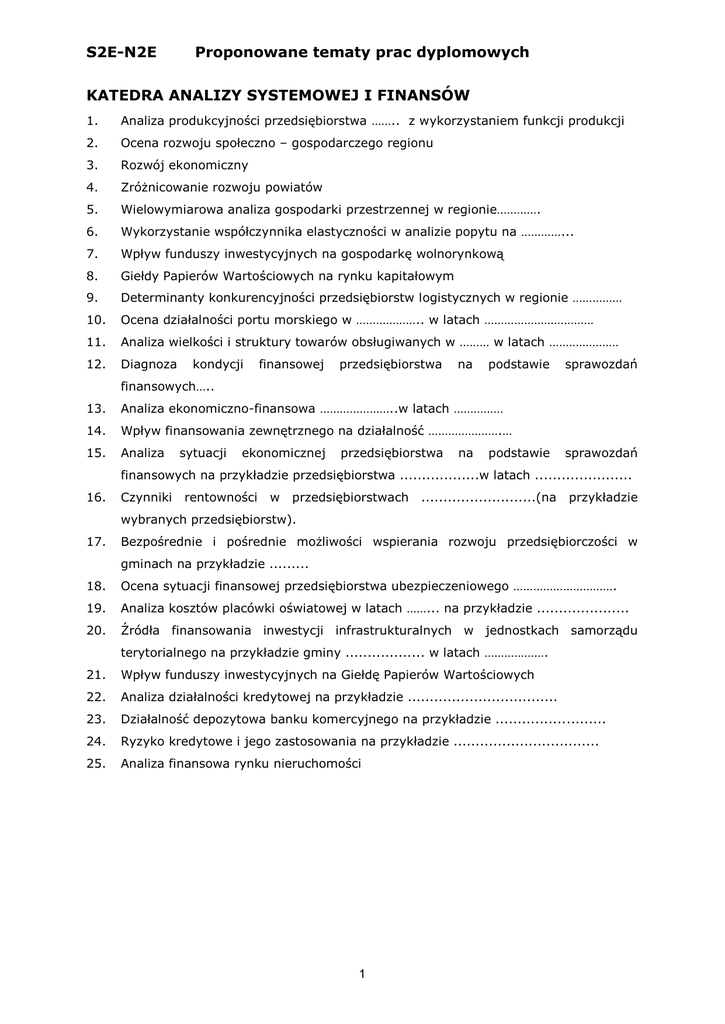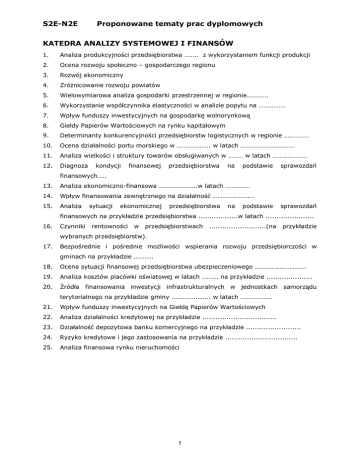 S2E-N2E Proponowane tematy prac dyplomowych KATEDRA ANALIZY SYSTEMOWEJ I FINANSÓW 1. Analiza produkcyjności przedsiębiorstwa …….. z wykorzystaniem funkcji produkcji 2. Ocena rozwoju społeczno – gospodarczego regionu 3. Rozwój ekonomiczny 4. Zróżnicowanie rozwoju powiatów 5. Wielowymiarowa analiza gospodarki przestrzennej w regionie…………. 6. Wykorzystanie współczynnika elastyczności w analizie popytu na …………... 7. Wpływ funduszy inwestycyjnych na gospodarkę wolnorynkową 8. Giełdy Papierów Wartościowych na rynku kapitałowym 9. Determinanty konkurencyjności przedsiębiorstw logistycznych w regionie …………… 10. Ocena działalności portu morskiego w ……………….. w latach …………………………… 11. Analiza wielkości i struktury towarów obsługiwanych w ……… w latach ………………… 12. Diagnoza kondycji finansowej przedsiębiorstwa na podstawie sprawozdań finansowych….. 13. Analiza ekonomiczno-finansowa …………………..w latach …………… 14. Wpływ finansowania zewnętrznego na działalność ………………….… 15. Analiza sytuacji ekonomicznej przedsiębiorstwa na podstawie sprawozdań finansowych na przykładzie przedsiębiorstwa ..................w latach ...................... 16. Czynniki rentowności w przedsiębiorstwach ..........................(na przykładzie wybranych przedsiębiorstw). 17. Bezpośrednie i pośrednie możliwości wspierania rozwoju przedsiębiorczości w gminach na przykładzie ......... 18. Ocena sytuacji finansowej przedsiębiorstwa ubezpieczeniowego …………………………. 19. Analiza kosztów placówki oświatowej w latach ……... na przykładzie ..................... 20. Źródła finansowania inwestycji infrastrukturalnych w jednostkach samorządu terytorialnego na przykładzie gminy .................. w latach ………………. 21. Wpływ funduszy inwestycyjnych na Giełdę Papierów Wartościowych 22. Analiza działalności kredytowej na przykładzie .................................. 23. Działalność depozytowa banku komercyjnego na przykładzie ......................... 24. Ryzyko kredytowe i jego zastosowania na przykładzie ................................. 25. Analiza finansowa rynku nieruchomości 1 S2E-N2E Proponowane tematy prac dyplomowych KATEDRA EKONOMII 1. Innowacyjność i konkurencyjność jako czynnik rozwoju przedsiębiorstwa 2. Innowacyjność i konkurencyjność czynnikiem rozwoju kraju (regionu) 3. Współpraca technologiczna polskiego sektora B+R z przedsiębiorstwami jako czynnik wzrostu innowacyjności gospodarki 4. Polityka wspierania innowacyjności podmiotów gospodarczych (np. MŚP) i jej efekty 5. Ocena polityki wspierania innowacyjności w Polsce 6. Innowacyjność krajów (regionów) – analiza porównawcza 7. Determinanty rozwoju regionalnego w warunkach współczesnej gospodarki 8. Możliwości rozwojowe przedsiębiorstwa (kraju, regionu) wobec wyzwania współczesnej gospodarki 9. Kooperacja i koopetycja jako strategie rozwoju w gospodarce opartej na wiedzy 10. Alianse strategiczne jako czynnik rozwoju przedsiębiorstw we współczesnej gospodarce 11. Megakorporacje i ich wpływ na gospodarkę światową 12. Przemiany gospodarki światowej w XXI w. 13. Regionalne systemy innowacji – istota, znaczenie, uwarunkowania 14. Przekształcenia agrobiznesu w makro i mikroskali 15. Przemiany polskiego przemysłu spożywczego jako konsekwencja integracji z UE 16. Analiza ekonomiczna firmy …… w latach ……… 17. Ocena rezultatów transformacji społeczno-gospodarczej w Polsce (innym kraju postsocjalistycznym) 18. Reformy instytucjonalne w Polsce i ich efekty 19. Problemy wzrostu i rozwoju gospodarczego z perspektywy nowej ekonomii instytucjonalnej 20. Inflacja i polityka antyinflacyjna w wybranych krajach w latach ……. 21. Deflacja i polityka antydeflacyjna w wybranych krajach w latach …….. 22. Przebieg i skutki globalnego kryzysu gospodarczego dla polskiej (lub innej) gospodarki 23. Przezwyciężanie skutków kryzysu gospodarczego na przykładzie wybranego kraju 24. Determinanty rozwoju MŚP w Polsce 25. Problemy liberalizacji rynku ………….. (np. usług pocztowych) w Polsce 26. Problemy funkcjonowania sektora ………….. (rynku) w latach ………… 27. Oddziaływanie polityki …………….. na ……………… (firmę, sektor, problem społecznogospodarczy) 28. Wykorzystanie środków pomocowych UE dla rozwoju regionu 29. Wykorzystanie środków pomocowych z UE dla rozwoju przedsiębiorstw 30. Wykorzystanie alternatywnych źródeł finansowania na rozwój przedsiębiorstwa …… 2 S2E-N2E Proponowane tematy prac dyplomowych 31. Gospodarka mieszkaniowa w województwie …………… w latach ……………. 32. Problemy rynku ……………. i narzędzia ich rozwiązywania przez państwo 33. Analiza systemu opieki zdrowotnej w Polsce 34. Ekonomiczno-organizacyjna ocena działalności przedsiębiorstwa 35. Wpływ jakości kapitału ludzkiego na efektywność ekonomiczną firmy 36. System ubezpieczeń społecznych - analiza porównawcza 37. Wspólna polityka rolna UE-ewolucja i znaczenie dla rolnictwa polskiego 38. Procesy prywatyzacji w Polsce jako czynnik wzrostu konkurencyjności 39. Ewolucja systemu podatkowego w okresie transformacji systemowej 40. Wsparcie małych i średnich przedsiębiorstw w polityce rozwojowej 41. Analiza budżetu samorządu terytorialnego w aspekcie dochodów i inwestycji 42. Ocena strategii rozwoju gminy w kontekście zaspokajania potrzeb społecznych 43. Wpływ pakietu klimatyczno-energetycznego UE na polski sektor energetyczny 44. Rola kapitału społecznego w rozwoju gospodarczym 45. Rynek pracy (w Polsce, w zachodniopomorskim…) i jego uwarunkowania 46. Gospodarka oparta na wiedzy jako koncepcja XX wieku 47. Koncepcja homo oeconomicus w teorii ekonomii 48. Współczesne tendencje oddziałujące na biznes 49. Pozaekonomiczne cele działania podmiotów gos