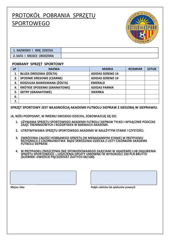 PROTOKÓŁ POBRANIA SPRZĘTU SPORTOWEGO 1. NAZWISKO I IMIĘ DZIECKA 2. DATA I MIEJSCE URODZENIA POBRANY SPRZĘT SPORTOWY LP 1. 2. 3. 4. 5. 6. 7. NAZWA BLUZA DRESOWA (ŻÓŁTA) SPODNIE DRESOWE (CZARNE) KOSZULKA BAWEŁNIANA (ŻÓŁTA) KRÓTKIE SPODENKI (GRANATOWE) GETRY (GRANATOWE) MARKA ADIDAS SERENO 14 ADIDAS SERENO 14 EMERALD ADIDAS PARMA ISKIERKA ROZMIAR SZTUK SPRZĘT SPORTOWY JEST WŁASNOŚCIĄ AKADEMII FUTBOLU SIEPRAW Z SIEDZIBĄ W SIEPRAWIU. JA, NIŻEJ PODPISANY, W IMIENIU SWOJEGO DZIECKA, ZOBOWIAZUJĘ SIĘ DO: 1. UŻYWANIA SPRZĘTU SPORTOWEGO AKADEMII FUTBOLU SIEPRAW TYLKO I WYŁĄCZNIE PODCZAS ZAJĘĆ TRENINGOWYCH I ROZGRYWEK W BARWACH AKADEMII. 2. UTRZYMYWANIA SPRZĘTU SPORTOWEGO AKADEMII W NALEŻYTYM STANIE I CZYSTOŚCI. 3. ZWRÓCENIA CAŁOŚCI POBRANEGO SPRZETU (W NIENAGANNYM STANIE) W PRZYPADKU REZYGNACJI Z CZŁONKOWSTWA BĄDŹ SKREŚLENIA DZIECKA Z LISTY CZŁONKÓW AKADEMII FUTBOLU SIEPRAW. 4. W PRZYPADKU ZNISZCZENIA (NIE SPOWODOWANEGO ZAJĘCIAMI W AKADEMII) LUB ZAGUBIENIA SPRZETU SPORTOWEGO – UISZCZENIA OPŁATY UMOWNEJ W WYSOKOŚCI 250 PLN BRUTTO (SŁOWNIE: DWIEŚCIE PIĘĆDZIESIAT ZŁOTYCH 00/100). Miejsce i data Podpis rodziców lub opiekunów prawnych