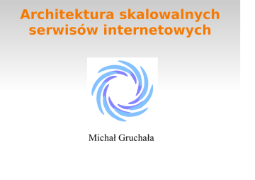Architektura skalowalnych serwisów internetowych Michał Gruchała Architektura skalowalnych serwisów internetowych Serwis Wprowadzamy zmiany Modularność Cache Shardowanie Podsumowanie O mnie 2005-2011 GG Network S.A. 2011 Politechnika Warszawska 2011 scaleIT Serwis Serwis Dodaj wpis Zobacz Ostatnie wpisy (wszystkich) Wpisy moich znajomych (stream) Wpisy (blog) danej osoby Obserwuj Serwis Struktura bazy Serwis Blog select * from User where id=ID select * from Message where id=ID order by ts desc limit … Stream select * from User where id=JA select Message.*, User.* from Message join Follow on Message.owner_id=Follow.whom_id join User on Message.owner_id=User.id where Follow.who_id=JA; (!) Dodaj wpis insert into Message(`owner_id`,`message`) values ... Serwis Gdzie jesteśmy? Replikacja danych użytkownik PHP MySQL HaProxy Serwis Gdzie jesteśmy? LB i workery ”dokładamy w nieskończoność” Kolejne repliki bazy zwiększają odczyt Nie zapis Nie pojemność full-mesh Wprowadzamy zmiany Wprowadzamy zmiany Rozdzielamy ma moduły Wprowadzamy zmiany Rozdzielamy ma moduły Partycjonowanie funkcjonalne User (API) Message (API) Front Front Moduł stanowy (sesja) Prezentacja Agregacja danych z API User użytkownik Message Moduł Wprowadzamy zmiany Moduły są niezależne Ma swój zestaw maszyn Moduł A nie wie jak zorganizowany jest moduł B Load balancery, Workery, Bazy Jedna maszyna = jedna rola Wie tylko jak go używać (API) Komunikacja między modułami tylko za pomocą API (dostępne przez LB) Wprowadzamy zmiany Blog Front => User (podaj dane użytkownika X) Front => Message (podaj wpisy użytkownika X) Stream Front => User (podaj listę obserwowanych przez użytkownika X) Front => Message (podaj ostatnie wpisy użytkowników o zadanych id) Zrób join na liscie użytkowników i wpisów Wprowadzamy zmiany Zalety Moduł Front prostszy Wiemy gdzie są wąskie gardła Separacja obowiązków Wady Więcej maszyn Workery Front robią joiny Odciąża bazy, workery można dokładać Jest wolniej Spójność danych (skasowanie użytkownika?) Wprowadzamy zmiany Dodajemy cache Wprowadzamy zmiany Dodajemy cache Każdy moduł zarządza swoim cache Dwa poziomy cache Loadbalancery (zamieniamy haproxy na varnisha) Memcached ”chroni” workery, memcached, DB ”chroni” DB Dwie metody Odczyt z DB, zapis do cache na X sekund Odczyt z DB, zapis do cache ”w nieskończoność” (!) Wprowadzamy zmiany Blog Front => Message (podaj wpisy użytkownika X) Message API LB (cache) MessageAPI Worker => DB Lista wiadomości zapisana w Memcached ? Varnish ? Wprowadzamy zmiany Stream Front=> User (podaj listę obserwowanych) Front => Message (podaj blogi użytkowników z listy) Message: dla każdego użytkownika z listy pobierz wpisy użytkownika (blog) join w workerze Tak zwane pull on demand Wprowadzamy zmiany Dodaj wpis Front => Message (dodaj wpis użytkownika X) Worker Message dodaje wpis do bazy Worker Message dodaje wpis do memcached Worker niszczy (łatwiej) listę wpisów (blog) ze swojego varnisha ze swojego memcached troche się skomplikowało.... Wprowadzamy zmiany Zalety Jest szybciej Odciążamy DB i sieć(!) Duże hit-ratio na memcached przy blogach Brak dog-pile effect (varnish) Wady Trudniej (więcej worker-side) Spójność cache i baz danych Im więcej lb, tym mniejsze hit-ratio Wprowadzamy zmiany Shardujemy Wprowadzamy zmiany Shardujemy Partycjonowanie horyzontalne Shardy są niezależne Mają inne dane Nic nie wiedzą o sobie Funkcja(klucz) = numer sharda Wprowadzamy zmiany Shardujemy Tabela Follow Tabela Message Klucz who_id Funkcja who_id modulo liczba shardów Klucz owner_id Funkcja owner_id modulo liczba shardów Tabela User Bez shardowania Wprowadzamy zmiany Zalety Zwiększamy wydajność zapisów (i odczytów) Zwiększamy pojemność bazy Więcej mniejszych baz (zarządzanie, szybkość) Wady Komplikacja logiki Kto mnie obserwuje Cross-shard query Dokładanie shardów Podsumowanie Podsumowanie Prosty serwis Zrobił się skomplikowany Skomplikowanie wydelegowane do modułów ;) Dodaliśmy sporo maszyn Optymalizacja jeszcze ważniejsza (IO) Sieć dostaje w kość Dużo pracy może scale-up ? Dziękuję Pytania?