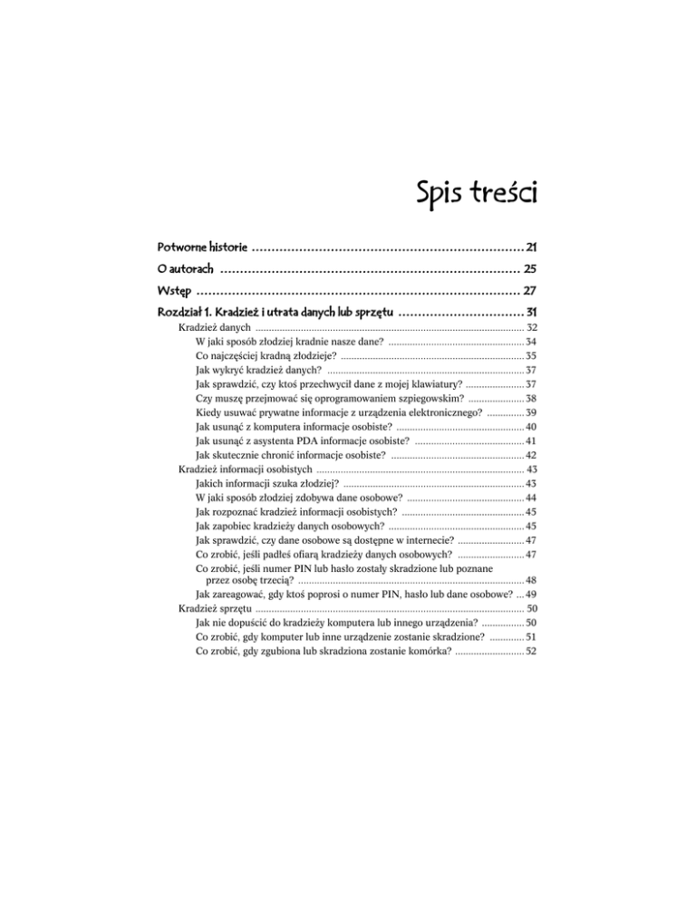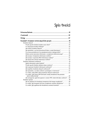 Spis treści Potworne historie ..................................................................... 21 O autorach ............................................................................ 25 Wstęp .................................................................................. 27 Rozdział 1. Kradzież i utrata danych lub sprzętu ................................ 31 Kradzież danych ..................................................................................................... 32 W jaki sposób złodziej kradnie nasze dane? ................................................... 34 Co najczęściej kradną złodzieje? ..................................................................... 35 Jak wykryć kradzież danych? .......................................................................... 37 Jak sprawdzić, czy ktoś przechwycił dane z mojej klawiatury? ...................... 37 Czy muszę przejmować się oprogramowaniem szpiegowskim? ..................... 38 Kiedy usuwać prywatne informacje z urządzenia elektronicznego? .............. 39 Jak usunąć z komputera informacje osobiste? ................................................ 40 Jak usunąć z asystenta PDA informacje osobiste? ......................................... 41 Jak skutecznie chronić informacje osobiste? .................................................. 42 Kradzież informacji osobistych .............................................................................. 43 Jakich informacji szuka złodziej? .................................................................... 43 W jaki sposób złodziej zdobywa dane osobowe? ............................................ 44 Jak rozpoznać kradzież informacji osobistych? .............................................. 45 Jak zapobiec kradzieży danych osobowych? ................................................... 45 Jak sprawdzić, czy dane osobowe są dostępne w internecie? ......................... 47 Co zrobić, jeśli padłeś ofiarą kradzieży danych osobowych? ......................... 47 Co zrobić, jeśli numer PIN lub hasło zostały skradzione lub poznane przez osobę trzecią? ..................................................................................... 48 Jak zareagować, gdy ktoś poprosi o numer PIN, hasło lub dane osobowe? ... 49 Kradzież sprzętu ..................................................................................................... 50 Jak nie dopuścić do kradzieży komputera lub innego urządzenia? ................ 50 Co zrobić, gdy komputer lub inne urządzenie zostanie skradzione? ............. 51 Co zrobić, gdy zgubiona lub skradziona zostanie komórka? .......................... 52 6 To tylko awaria, czyli katastrofy i wpadki z pecetem Jakie środki zapobiegawcze stosować, aby ograniczyć skutki kradzieży telefonu komórkowego? ............................................................................... 52 Jakie środki zapobiegawcze stosować, aby ograniczyć skutki kradzieży komputera lub asystenta PDA? ................................................................... 53 Podsumowanie ........................................................................................................ 54 Rozdział 2. Tragedie i gafy związane ze sprzętem ............................. 55 Korzystanie z pomocy i obsługi technicznej systemu Windows ........................... 57 Menedżer urządzeń .......................................................................................... 58 Awaria sprzętu ........................................................................................................ 59 Jakie są najczęstsze przyczyny awarii sprzętu? .............................................. 59 Co zrobić, gdy komputer nie może się uruchomić? ........................................ 61 Co zrobić, gdy zapomnę hasła do ustawień BIOS? ........................................ 62 Po czym poznać, że dysk twardy nadaje się do wymiany? ............................. 63 Co zrobić, jeśli dysk twardy zaczyna być przyczyną problemów? .................... 64 Co zrobić, jeśli dysk twardy całkowicie przestanie działać? ........................... 65 Jak zapobiec awariom dysku twardego? .......................................................... 65 Dlaczego mój monitor nie może się włączyć? ................................................. 66 Dlaczego na ekranie monitora pojawiły się plamy lub przebarwienia? .......... 68 Jak zapobiec powstawaniu plam i przebarwień na ekranie monitora? .......... 69 Dlaczego monitor hałasuje? ............................................................................ 69 Co zrobić, gdy urządzenie wejściowe przestaje działać? ..................................... 69 Co zrobić, gdy napęd nie może odczytać lub zapisać płyty CD lub DVD? .... 70 Co zrobić, jeżeli napęd CD, DVD lub dysk twardy nie działają po ich zainstalowaniu? ............................................................. 71 Dlaczego mój napęd CD nie odtwarza muzyki? ............................................. 72 Co zrobić, gdy nie działają porty USB lub urządzenia do nich podłączone? . 73 Co zrobić, gdy napęd dyskietek nie działa? .................................................... 73 Jak zapobiec zniszczeniu dyskietek przez napęd? .......................................... 74 Nieszczęśliwe wypadki ze sprzętem ....................................................................... 75 Dlaczego urządzenia mogą się zapalić lub dymić? ......................................... 75 Co robić, gdy urządzenie zapali się lub zacznie dymić? ................................. 77 Jak zapobiec zaprószeniu ognia? ..................................................................... 78 Co zrobić, gdy urządzenie zamoknie? ............................................................. 79 Co zrobić, żeby nie zalać urządzenia? ........................................
