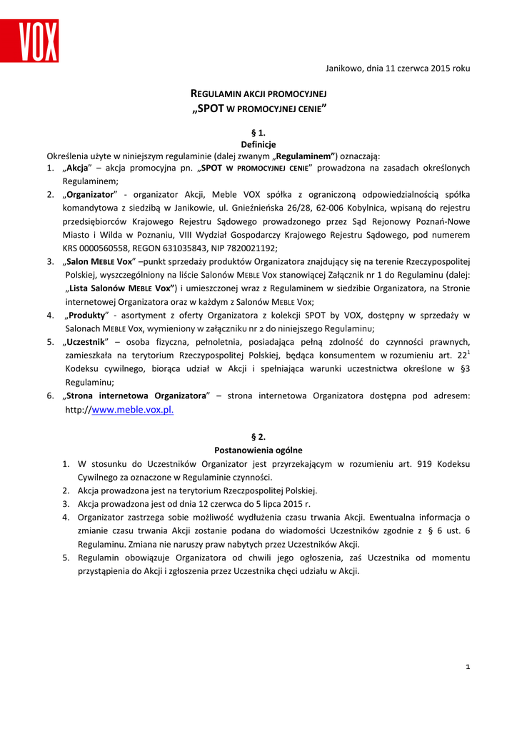 Janikowo, dnia 11 czerwca 2015 roku REGULAMIN AKCJI PROMOCYJNEJ „SPOT W PROMOCYJNEJ CENIE” § 1. Definicje Określenia użyte w niniejszym regulaminie (dalej zwanym „Regulaminem”) oznaczają: 1. „Akcja” – akcja promocyjna pn. „SPOT W PROMOCYJNEJ CENIE” prowadzona na zasadach określonych Regulaminem; 2. „Organizator” - organizator Akcji, Meble VOX spółka z ograniczoną odpowiedzialnością spółka komandytowa z siedzibą w Janikowie, ul. Gnieźnieńska 26/28, 62-006 Kobylnica, wpisaną do rejestru przedsiębiorców Krajowego Rejestru Sądowego prowadzonego przez Sąd Rejonowy Poznań-Nowe Miasto i Wilda w Poznaniu, VIII Wydział Gospodarczy Krajowego Rejestru Sądowego, pod numerem KRS 0000560558, REGON 631035843, NIP 7820021192; 3. „Salon MEBLE Vox” –punkt sprzedaży produktów Organizatora znajdujący się na terenie Rzeczypospolitej Polskiej, wyszczególniony na liście Salonów MEBLE Vox stanowiącej Załącznik nr 1 do Regulaminu (dalej: „Lista Salonów MEBLE Vox”) i umieszczonej wraz z Regulaminem w siedzibie Organizatora, na Stronie internetowej Organizatora oraz w każdym z Salonów MEBLE Vox; 4. „Produkty” - asortyment z oferty Organizatora z kolekcji SPOT by VOX, dostępny w sprzedaży w Salonach MEBLE Vox, wymieniony w załączniku nr 2 do niniejszego Regulaminu; 5. „Uczestnik” – osoba fizyczna, pełnoletnia, posiadająca pełną zdolność do czynności prawnych, zamieszkała na terytorium Rzeczypospolitej Polskiej, będąca konsumentem w rozumieniu art. 221 Kodeksu cywilnego, biorąca udział w Akcji i spełniająca warunki uczestnictwa określone w §3 Regulaminu; 6. „Strona internetowa Organizatora” – strona internetowa Organizatora dostępna pod adresem: http://www.meble.vox.pl. 1. 2. 3. 4. 5. § 2. Postanowienia ogólne W stosunku do Uczestników Organizator jest przyrzekającym w rozumieniu art. 919 Kodeksu Cywilnego za oznaczone w Regulaminie czynności. Akcja prowadzona jest na terytorium Rzeczpospolitej Polskiej. Akcja prowadzona jest od dnia 12 czerwca do 5 lipca 2015 r. Organizator zastrzega sobie możliwość wydłużenia czasu trwania Akcji. Ewentualna informacja o zmianie czasu trwania Akcji zostanie podana do wiadomości Uczestników zgodnie z § 6 ust. 6 Regulaminu. Zmiana nie naruszy praw nabytych przez Uczestników Akcji. Regulamin obowiązuje Organizatora od chwili jego ogłoszenia, zaś Uczestnika od momentu przystąpienia do Akcji i zgłoszenia przez Uczestnika chęci udziału w Akcji. 1 § 3. Zasady uczestnictwa w Akcji 1. Zasady Akcji: a. Warunkiem udziału w Akcji jest zakup przez Uczestnika Produktów objętych Akcją. b. W przypadku spełnienia przez Uczestnika warunku, o którym mowa w pkt. a) powyżej, i wyrażeniu chęci uczestniczenia w Akcji, dany Salon Meble VOX w którym nastąpił zakup Produktów udzieli Uczestnikowi jednorazowego rabatu od ceny detalicznej do poziomu ceny promocyjnej, której wysokość określona jest w załączniku nr 2 niniejszego Regulaminu. 2. Pod pojęciem „zakupu” należy rozumieć (każdy z poniższych przypadków): a. zakup Produktów (niepoprzedzony zamówieniem) dokonany w jednym z dni trwania Akcji, w ramach jednej transakcji sprzedaży, niezależnie od ilości i rodzaju wystawionych (w szczególności rachunków, paragonów, faktur), w Salonie Meble VOX i zapłatę ceny (także po rabacie udzielonym na Produkty zgodnie z Regulaminem) wszystkich zakupionych Produktów tego samego dnia (nie obejmuje zakupów Produktów dokonanych na podstawie zamówień złożonych poza okresem trwania Akcji); b. złożenie zamówienia na Produkty w jednym z dni trwania Akcji, w ramach jednej transakcji sprzedaży, niezależnie od ilości wystawionych dowodów zakupu wszelkiego rodzaju (w szczególności rachunków, paragonów, faktur) w Salonie Meble VOX w czasie trwania Akcji. 3. Rabat o którym mowa w § 3 ust. 1 lit. b) powyżej udzielany zostanie Uczestnikowi na Produkty zakupione przez Uczestnika w Salonie Meble VOX -przy zapłacie ceny za Produkty, poprzez obniżenie ceny zakupu Produktów o ww. rabat, z zastrzeżeniem ust. 4 i 5 poniżej. 4. Rabat jest jednorazowy. 5. Rabat można uzyskać na zakup Produktów, z zastrzeżeniem ustępów poniższych: a. Akcja nie obejmuje produktów, które w tym samym czasie objęte są inną akcją promocyjną bądź wyprzedażową. b. Produkty, oznaczone określeniem „do wyczerpania zapasu”, biorą udział w Akcji po potwierdzeniu dostępności przez doradców w Salonach Meble VOX. 1. 2. 3. § 4. Tryb składania i rozpatrywania reklamacji Reklamacje Uczestników dotyczące Akcji mogą być składane przez Uczestników we wszelki prawnie dopuszczalny sposób.. Reklamacja może być zgłoszona m.in. na adres Organizatora lub na adres email [email protected] i zawierać imię, nazwisko Uczestnika, jego adres korespondencyjny, wskazanie nazwy promocji, której był Uczestnikiem, oraz opis okoliczności stanowiących podstawę reklamacji. Złożone reklamacje rozpatrywane będą w terminie 14 dni od daty otrzymania reklamacji. Zainteresowani zostaną powiadomieni o sposobie rozpatrzenia reklamacji listem poleconym, na adres podany w zgłoszeniu reklamacyjnym. 2 § 5. Dane osobowe Dane osobowe Uczestników będą przetwarzane zgodnie z przepisami ustawy z dnia 29 sierpnia 1997 r. o ochronie danych osobowych (tekst jednolity w Dz. U. z 2014 r., poz. 1182). Administratorem danych osobowych jest spółka Meble Vox spółka z ograniczoną odpowiedzialnością spółka komandytowa z siedzibą w Janikowie, adres: ul. Gnieźnieńska 26/28, 62-006 Kobylnica, wpisana do rejestru przedsiębiorców prowadzonego przez Sąd Rejonowy Poznań-Nowe Miasto i Wilda w Poznaniu VIII Wydział Gospodarczy Krajowego Rejestru Sądowego pod numerem KRS 0000560558 posiadająca numer statystyczny REGON 631035843 oraz numer identyfikacji podatkowej NIP 7820021192. Dane Uczestników będą przetwarzane wyłącznie w celu i w zakresie niezbędnym do przeprowadzeni